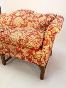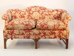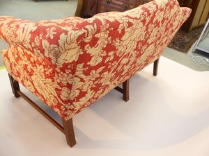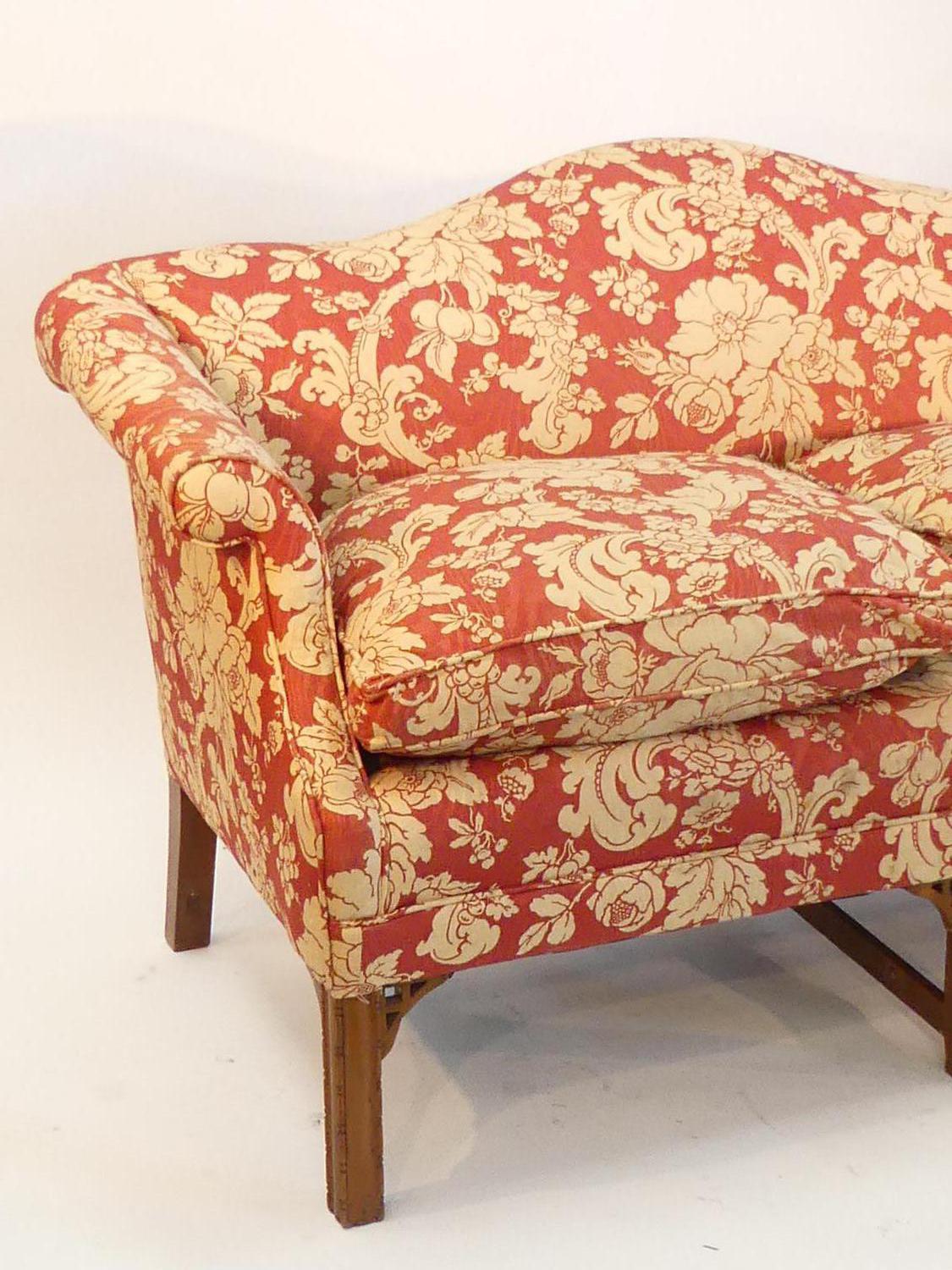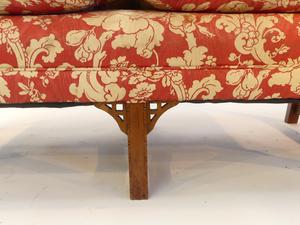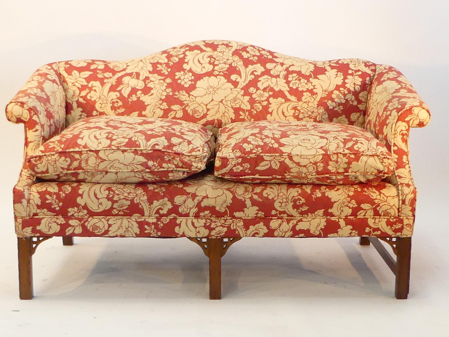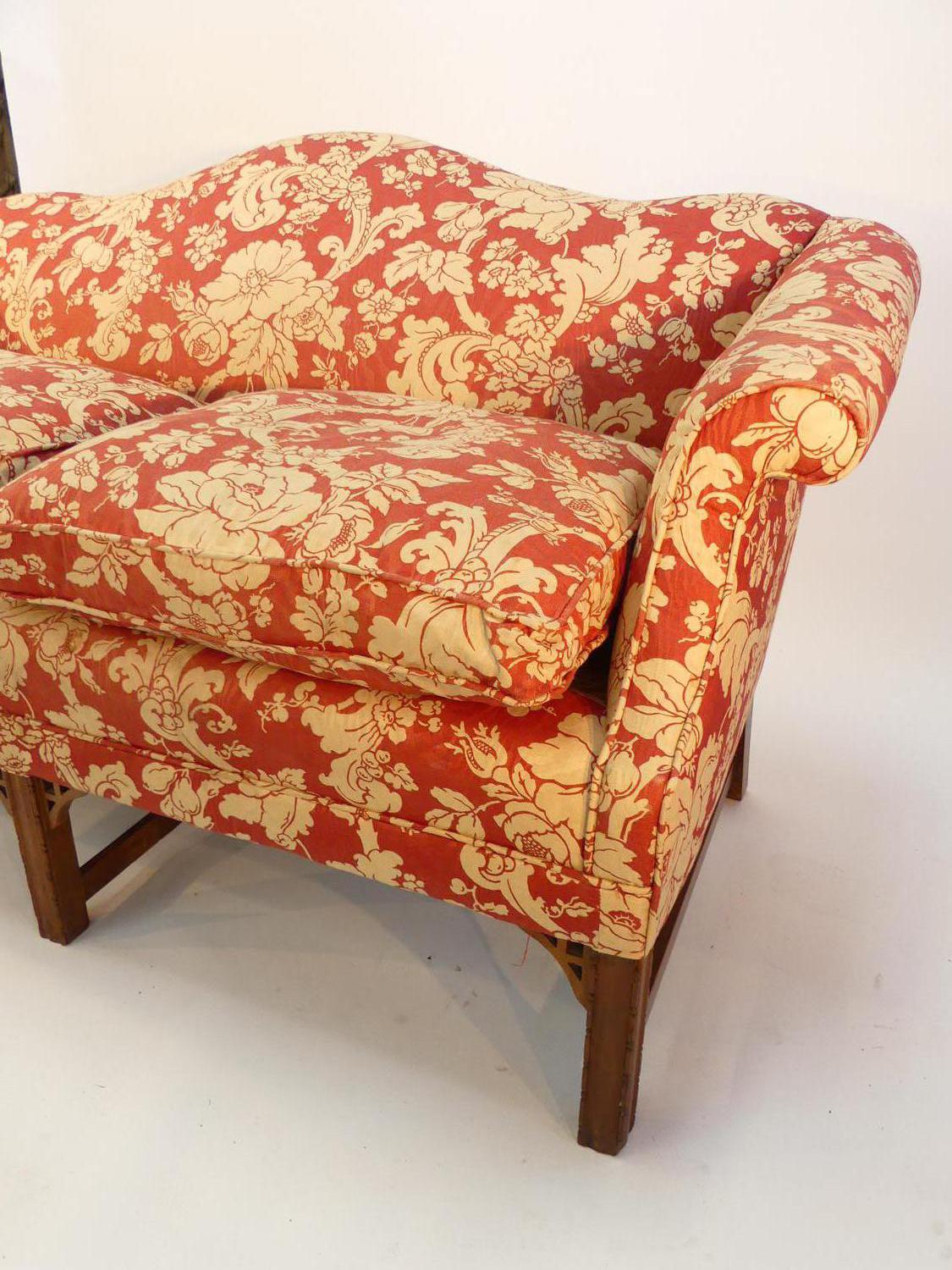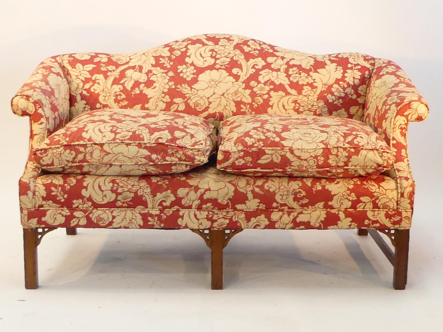 chippendale style upholstered camel back sofa with rolled arms, mahogany blind fretwork base, length 57"