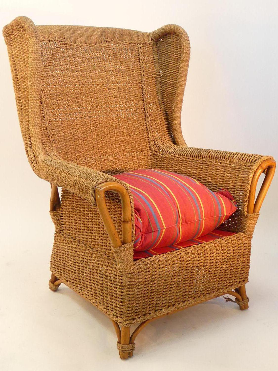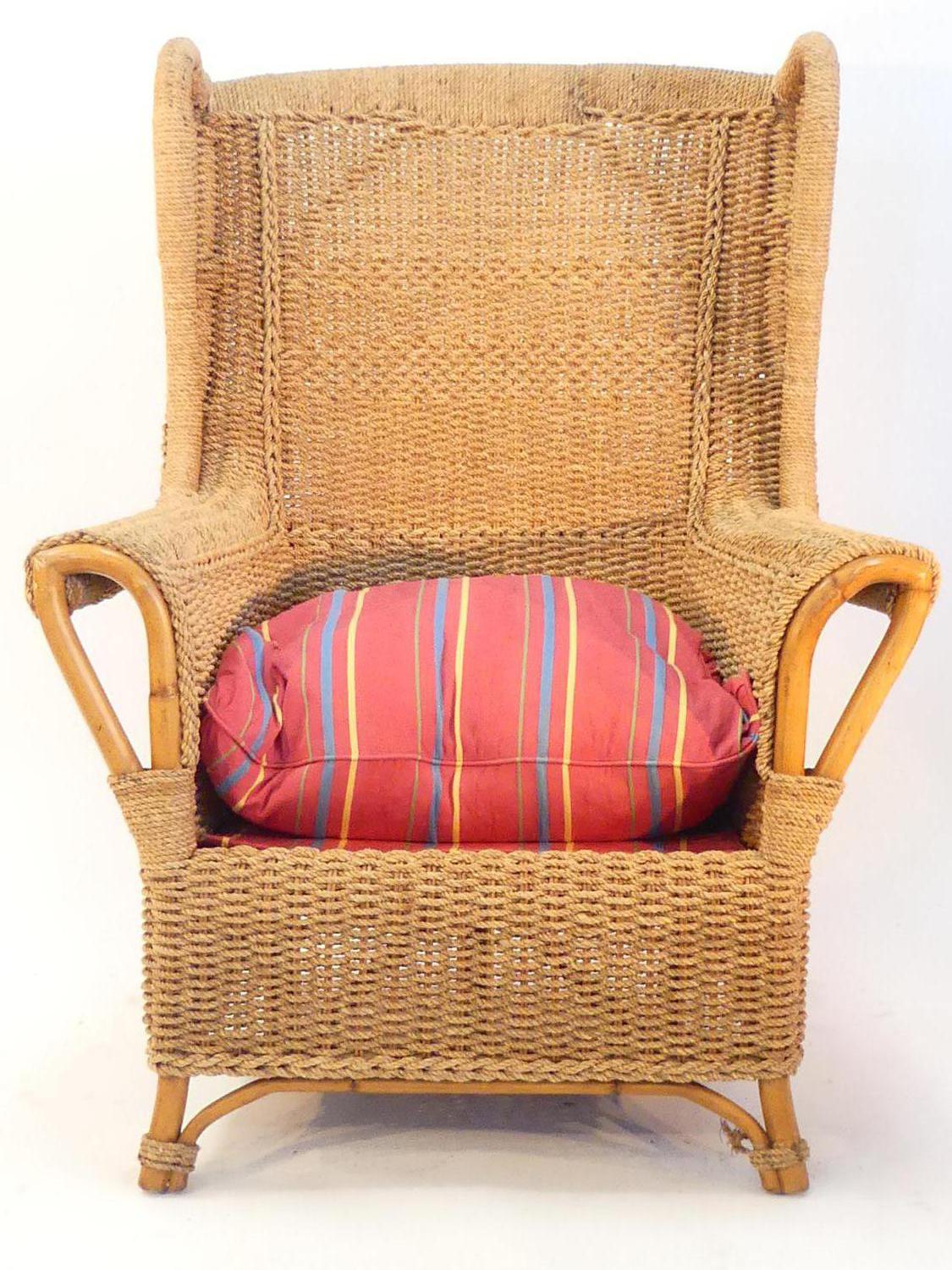 woven and rattan wing chair, late 20th century, 48" x 36" x 27"