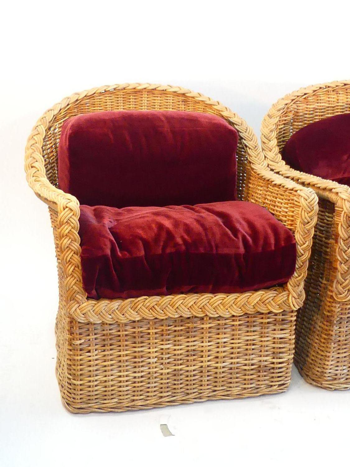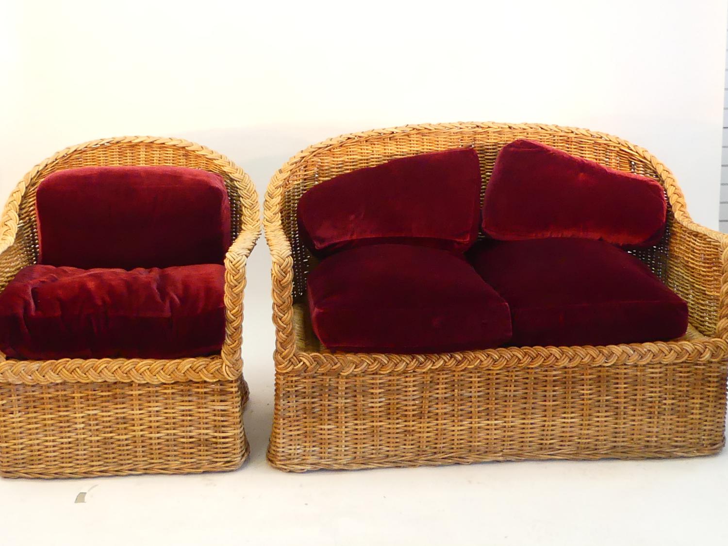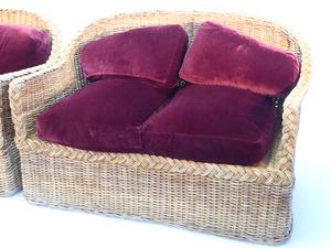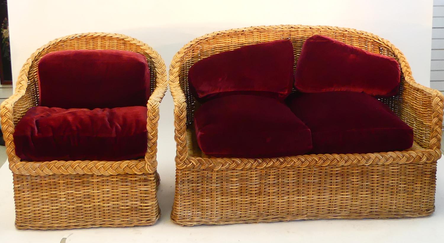 wicker loveseat and armchair with loose cushions