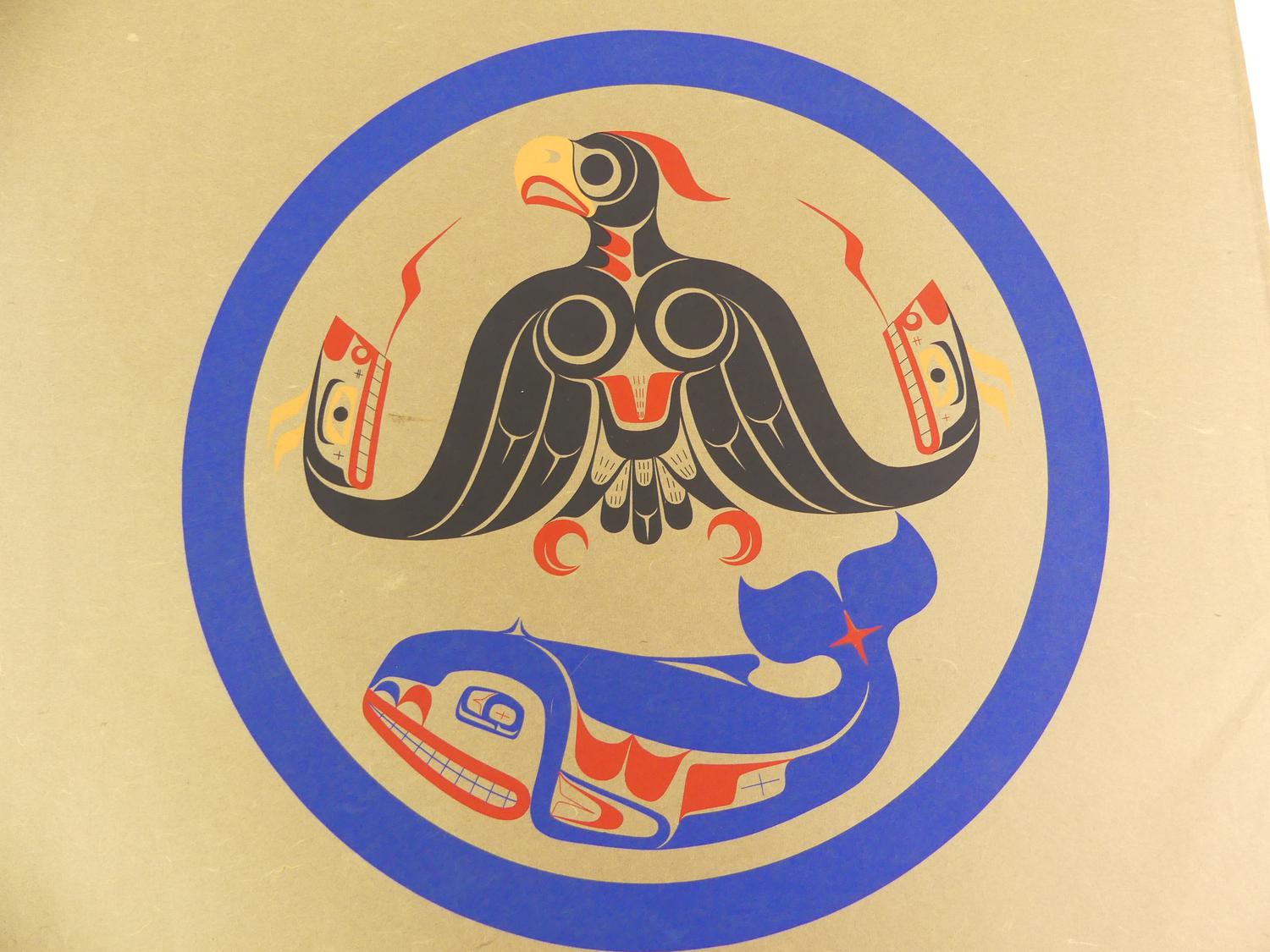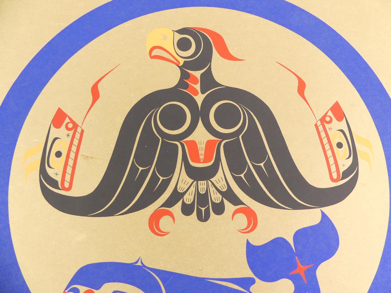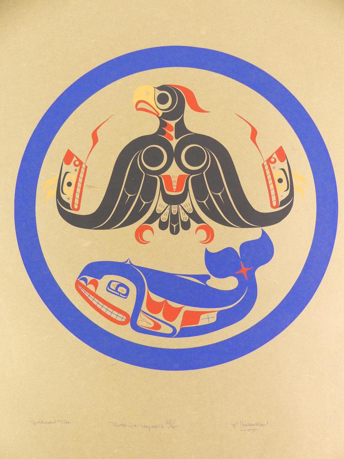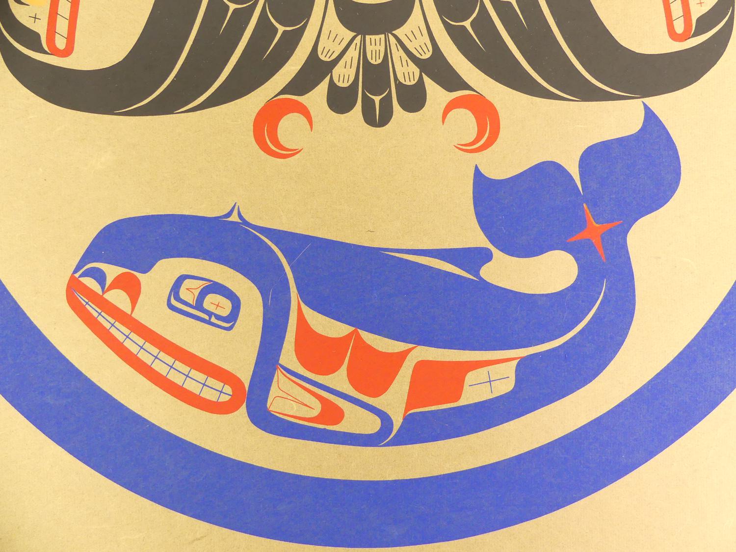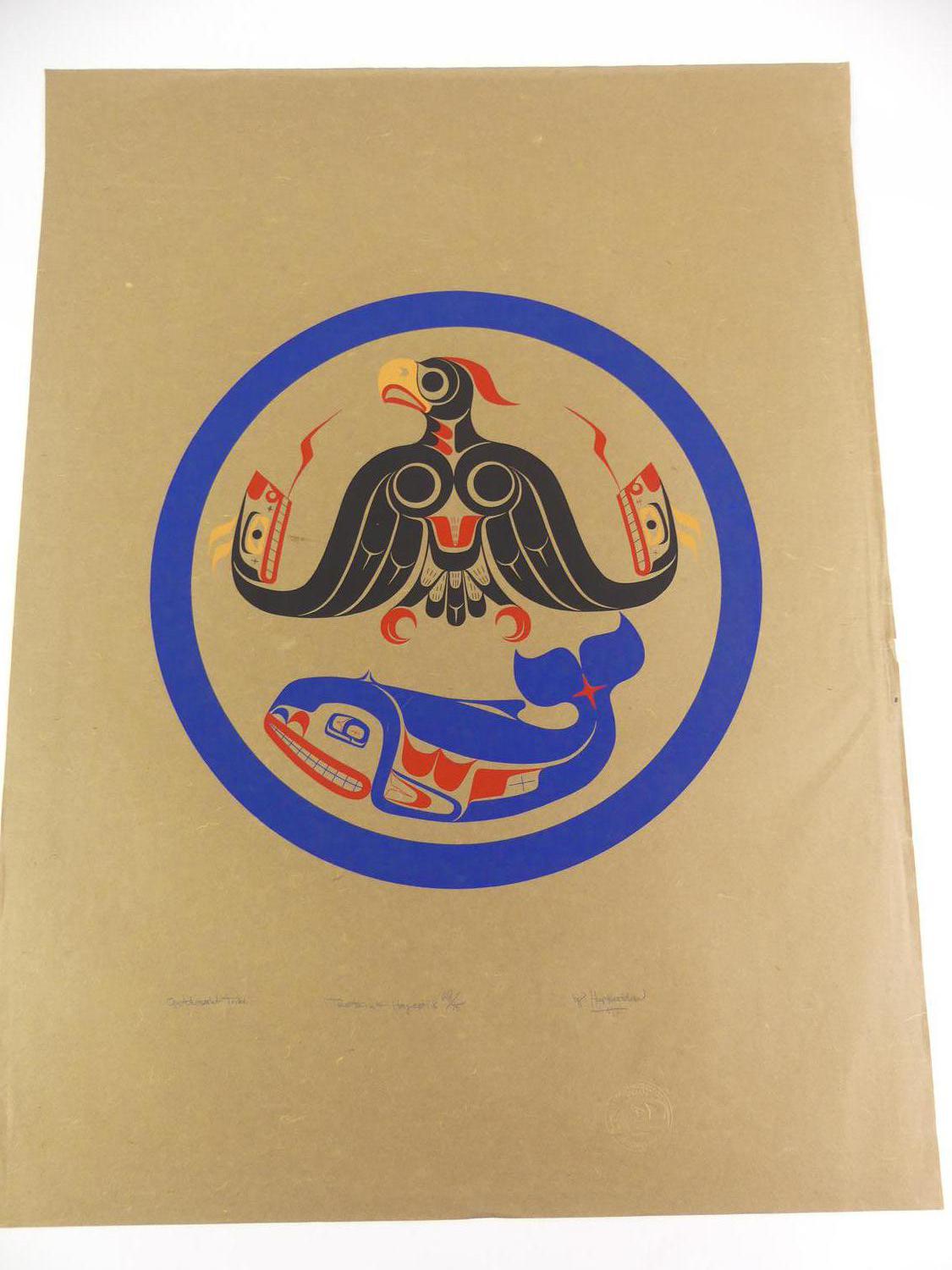ron hamilton, hupacasath (b.1948), silkscreen, 28/75, c.1977, 33" x 24 3/4", "teetskin & hayitlik in the sky"
