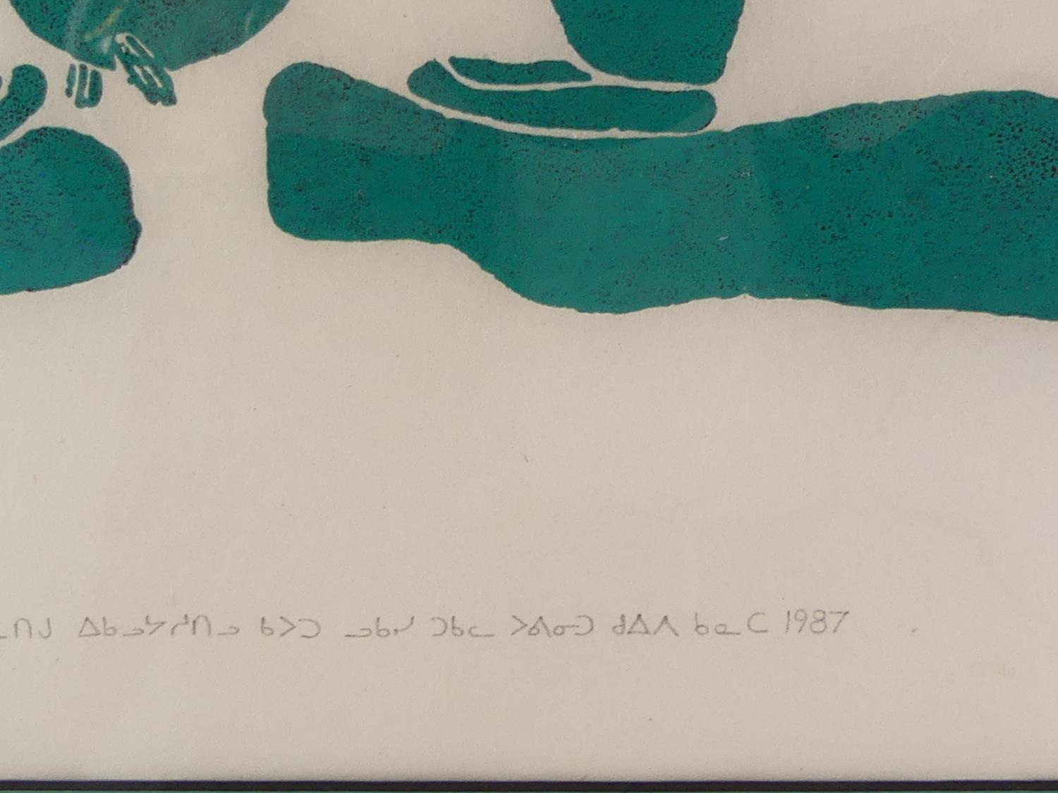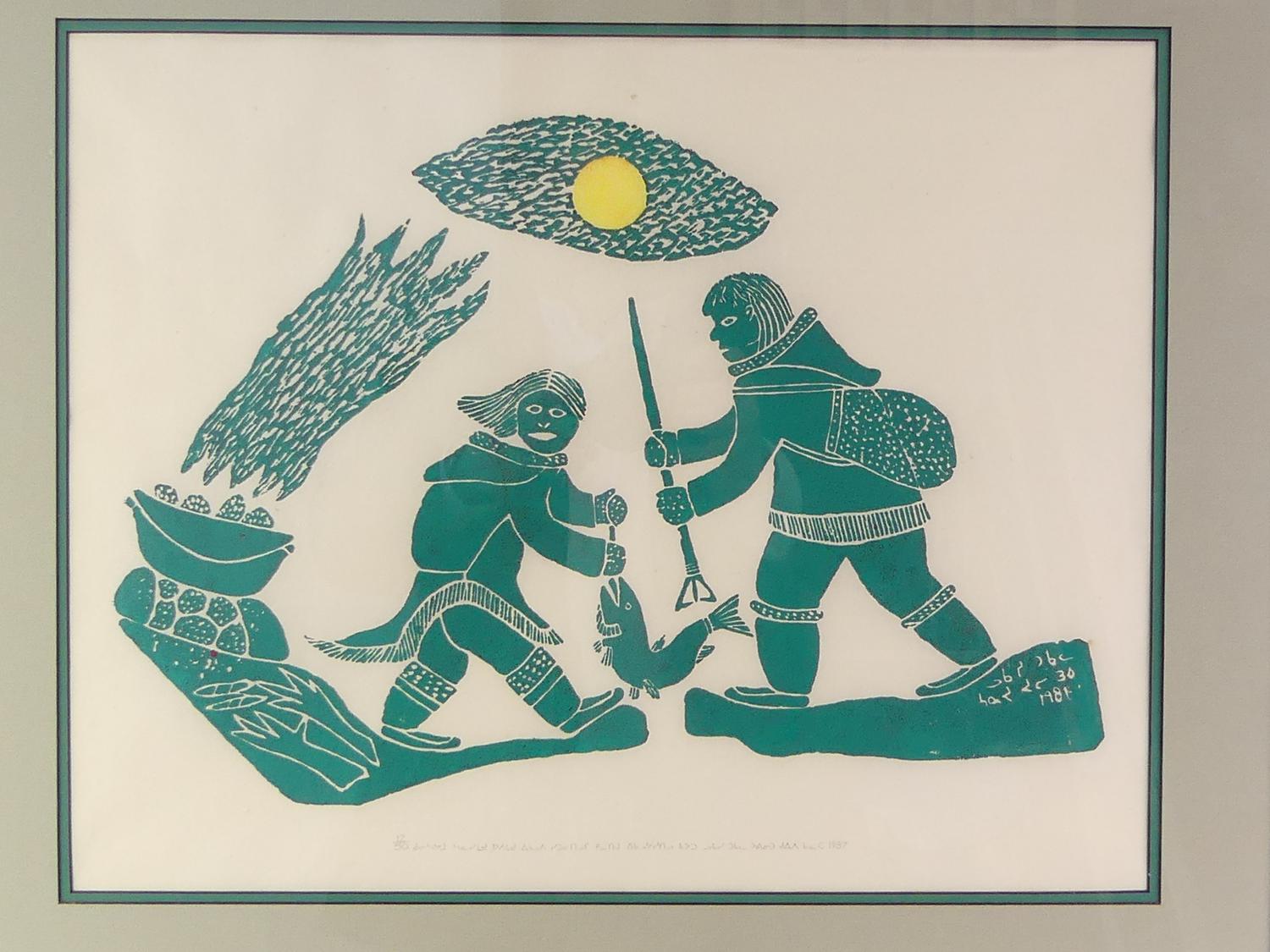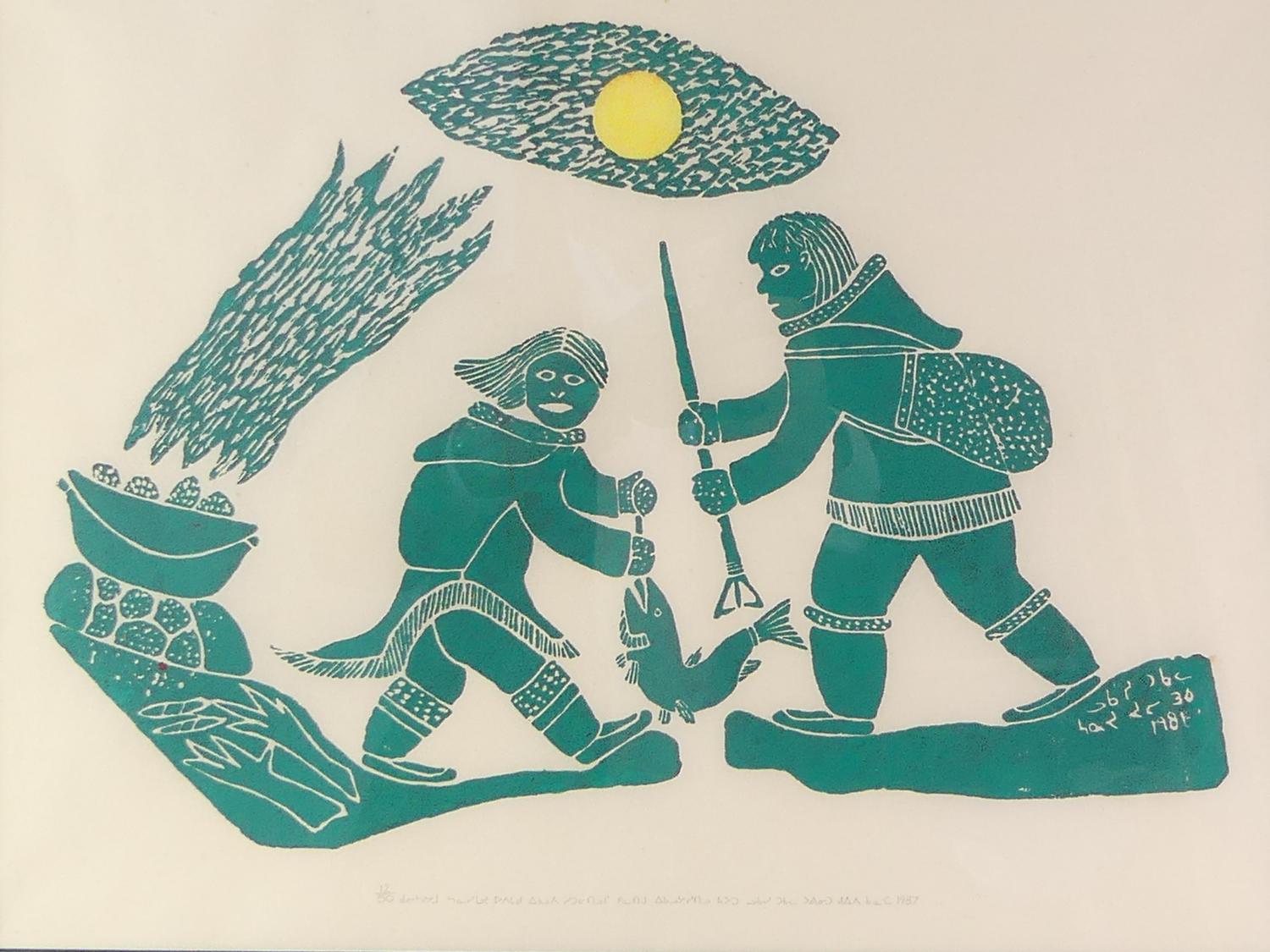 inuit stonecut signed in syllabics, d.1987, #12/50, 15" x 19", "scene with hunters and fish"