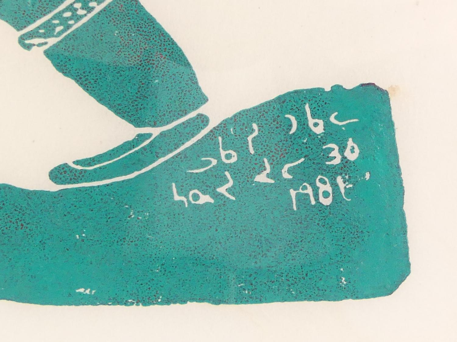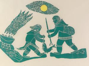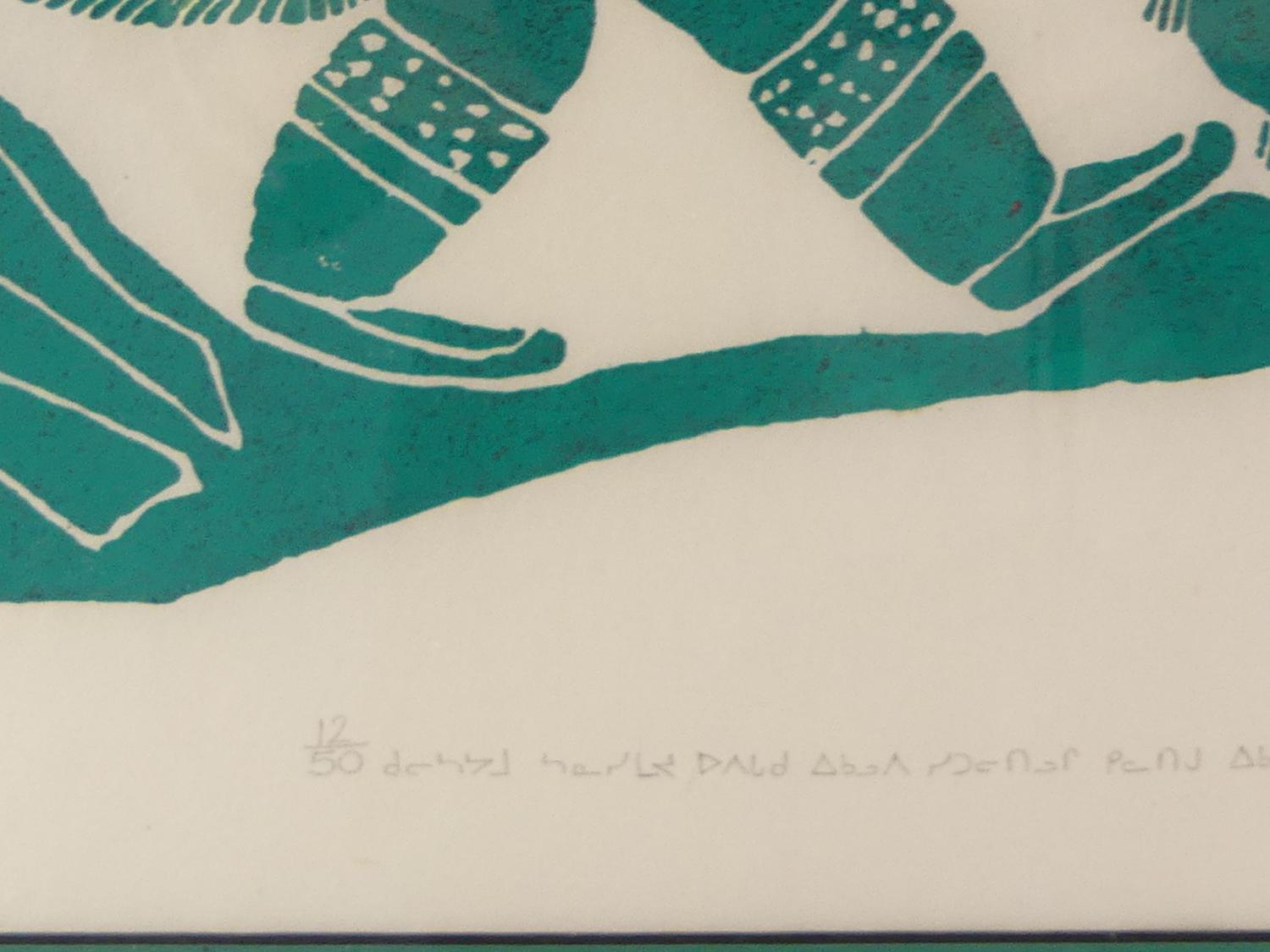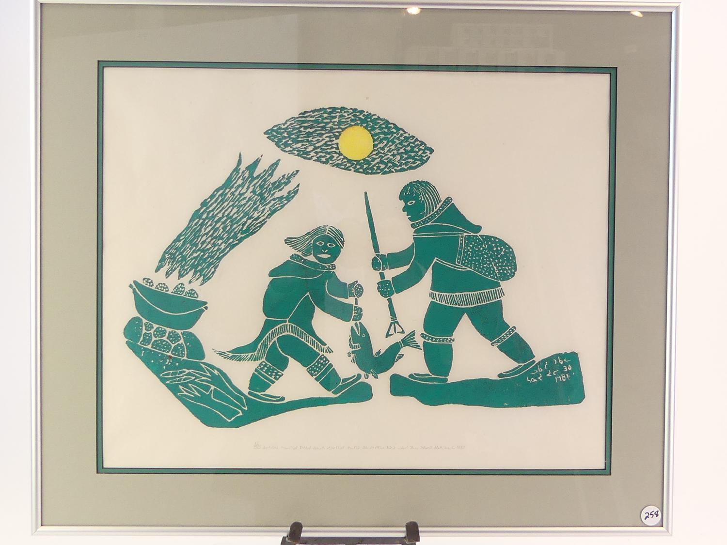 inuit stonecut signed in syllabics, d.1987, #12/50, 15" x 19", "scene with hunters and fish"