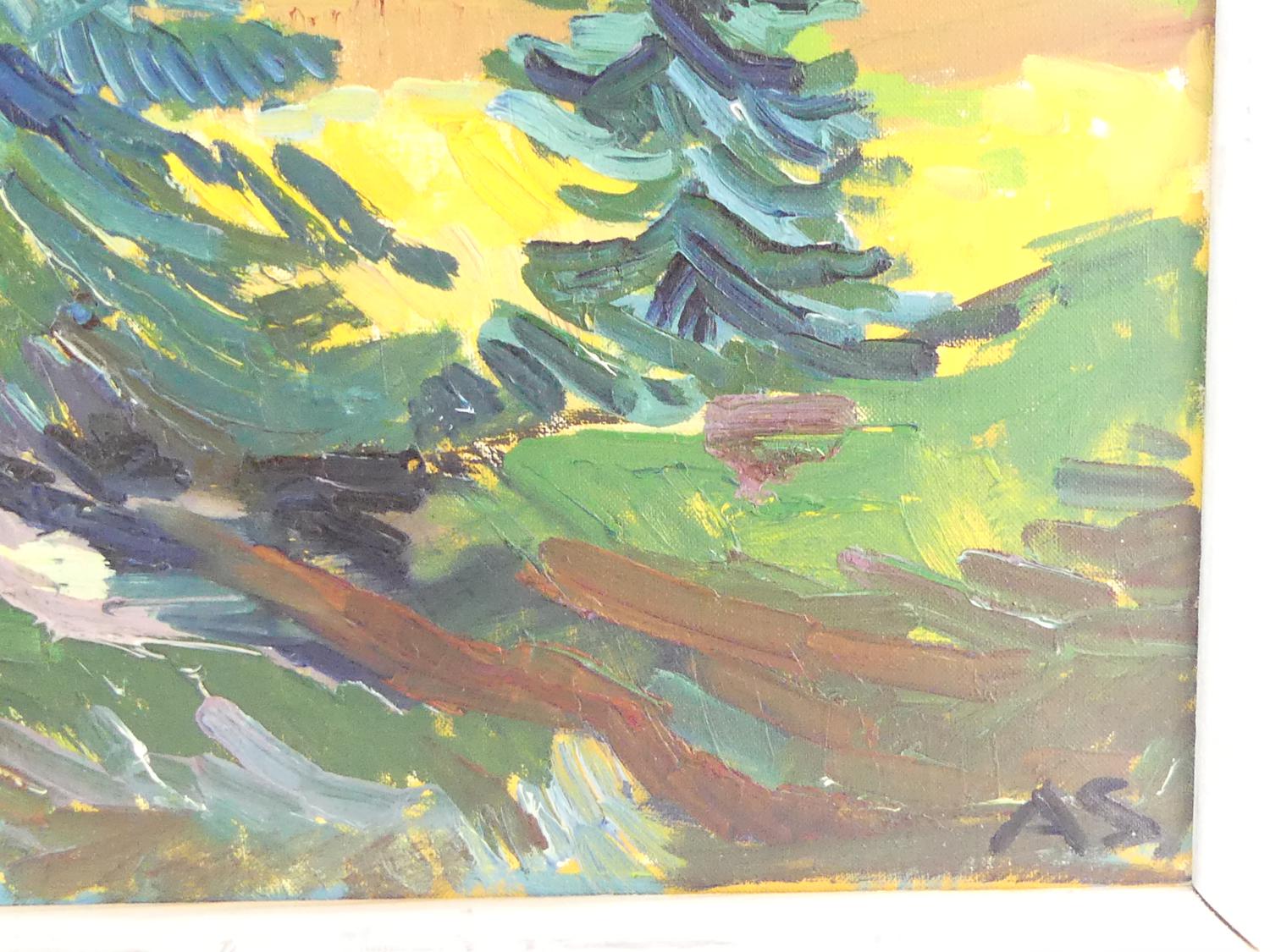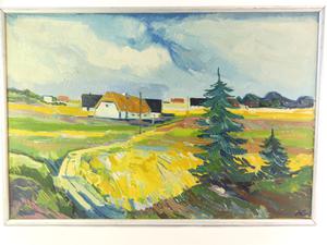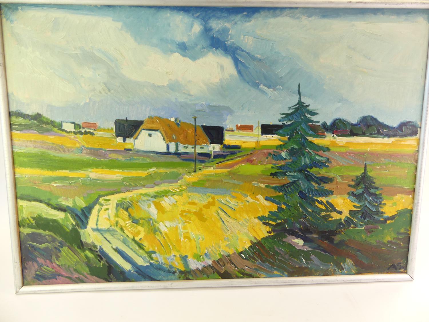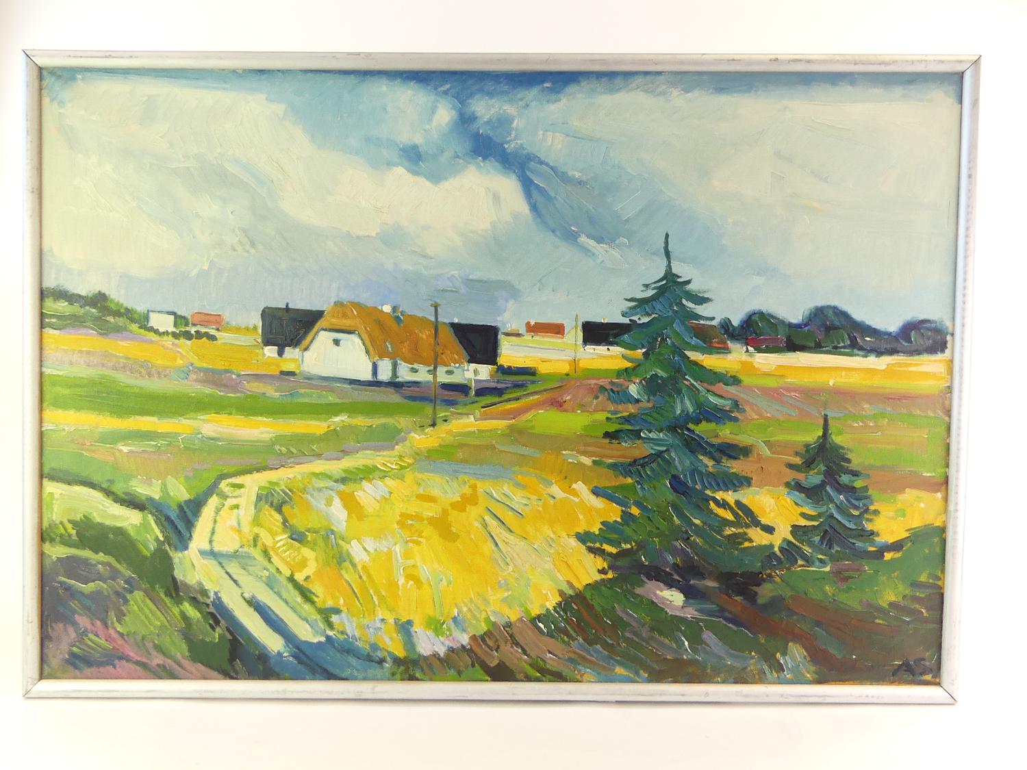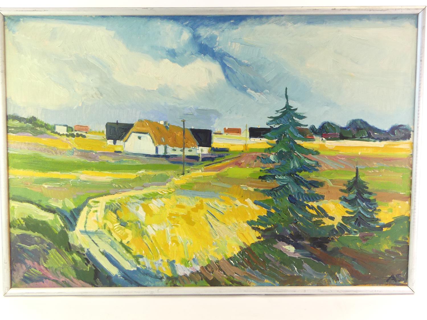 aage strand (1910-1974), oil on canvas, 26" x 28", "danish landscape"