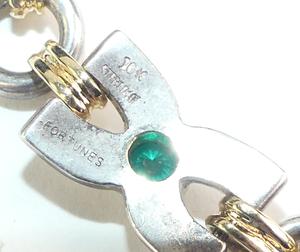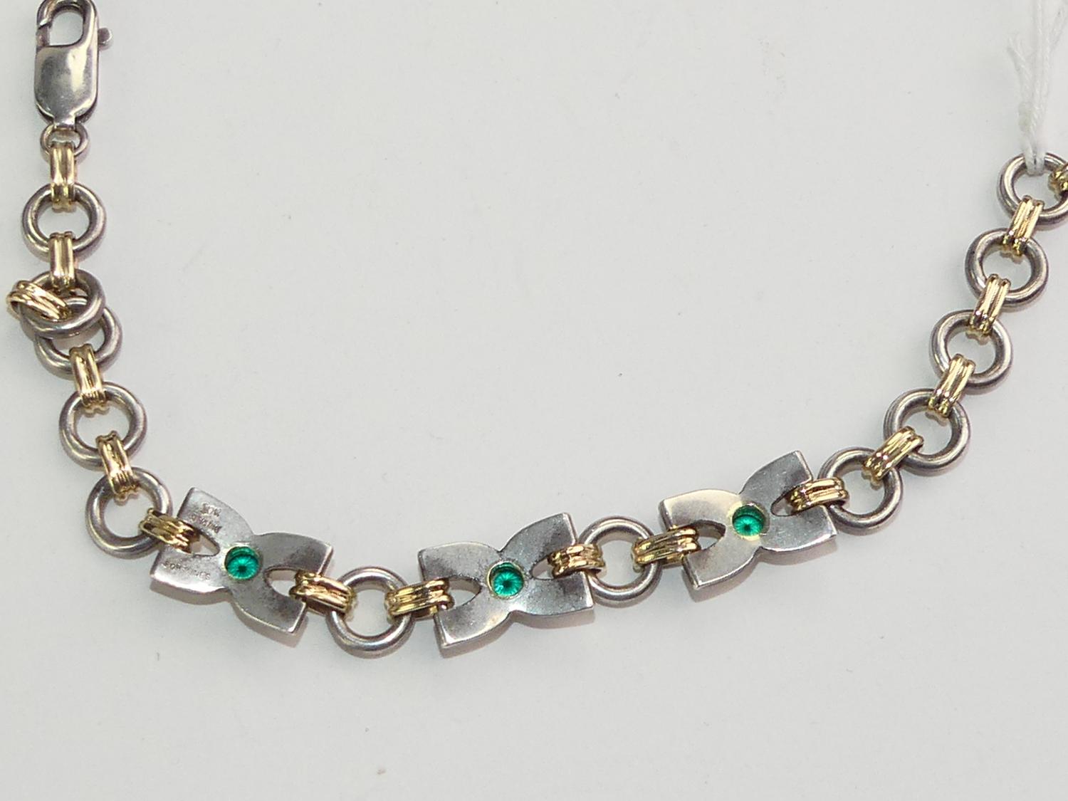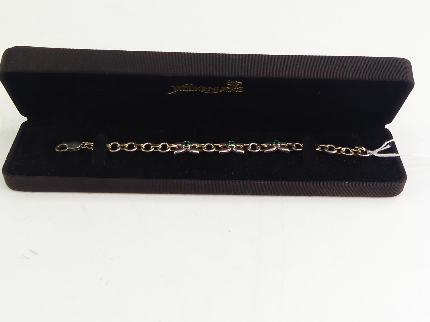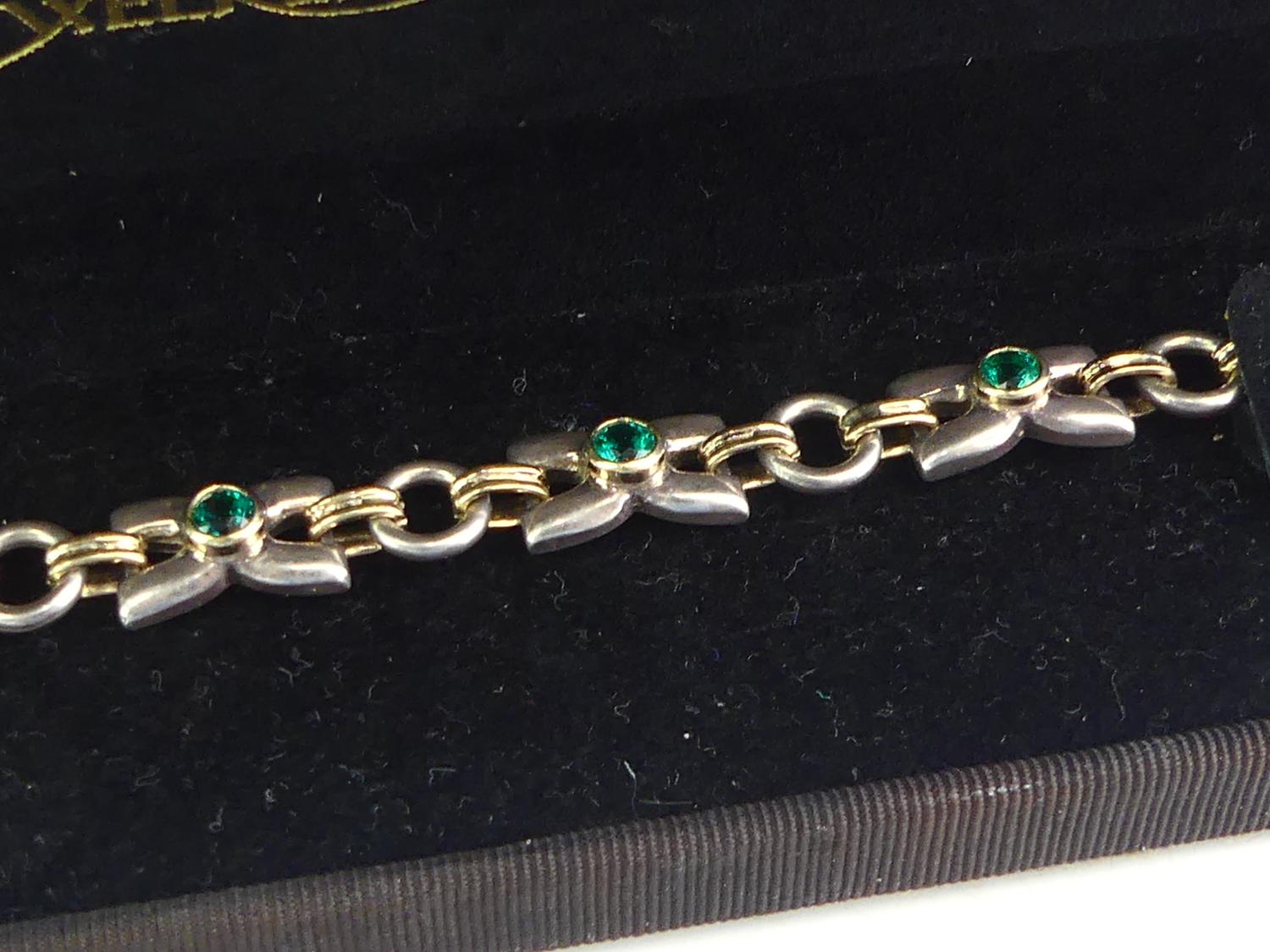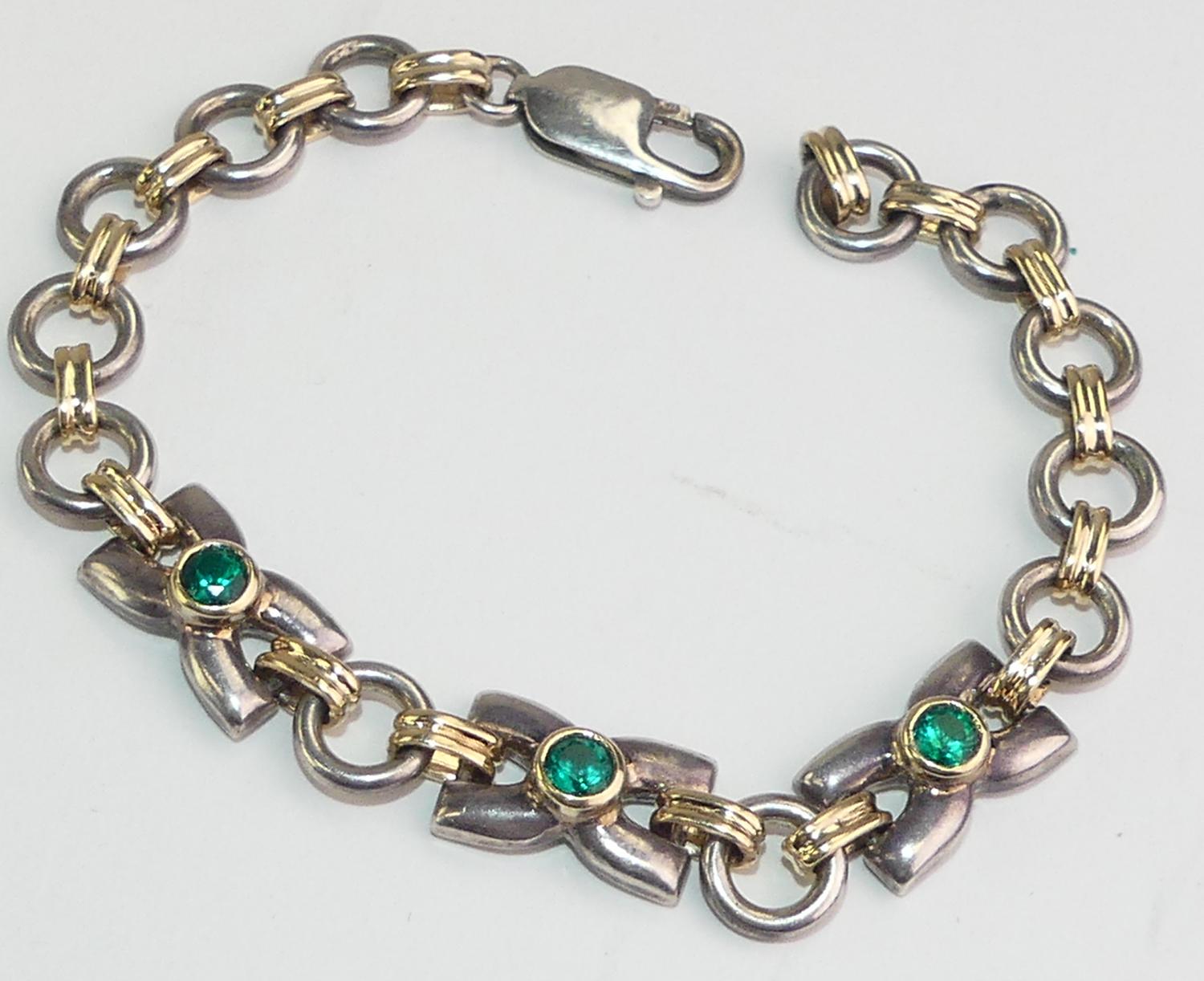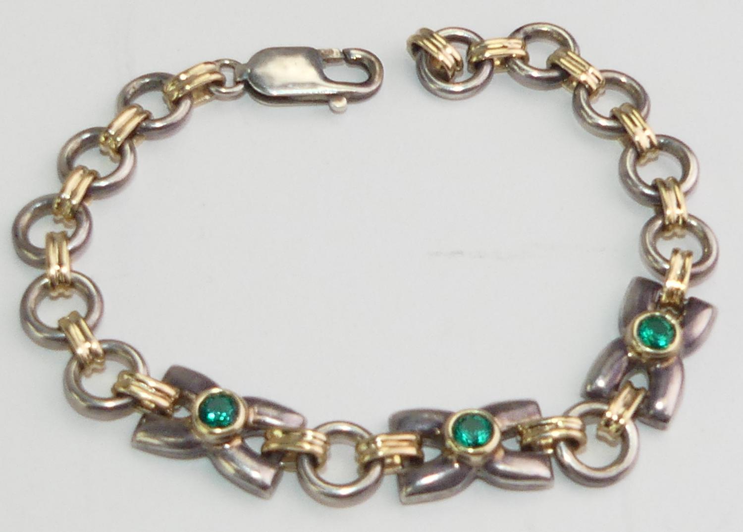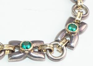 10k and sterling silver bracelet with synthetic emeralds, length is 7 1/2, fortunes of toronto, micheal dacosta, with box