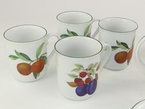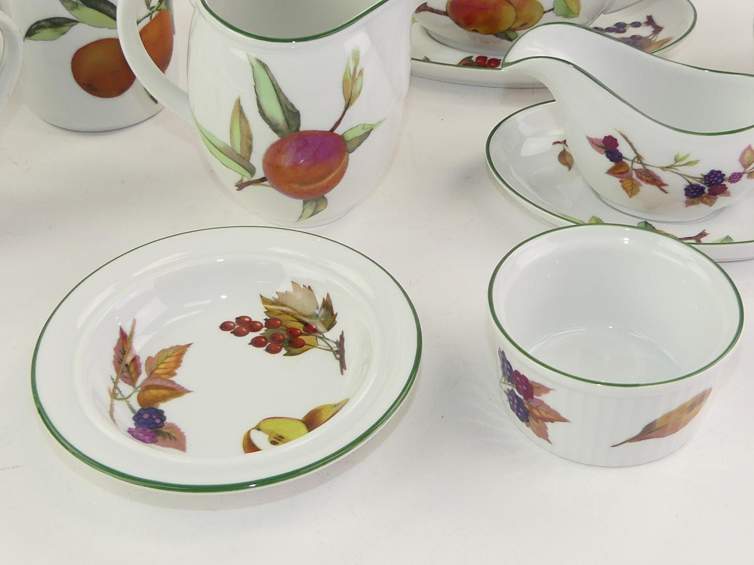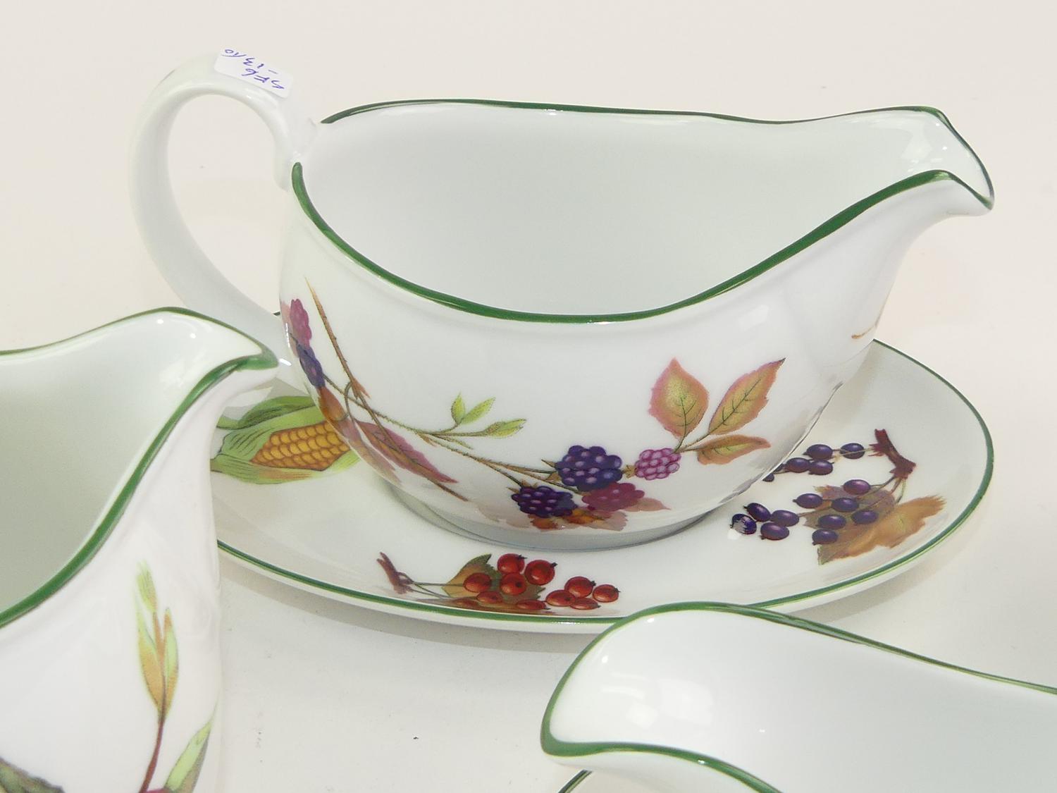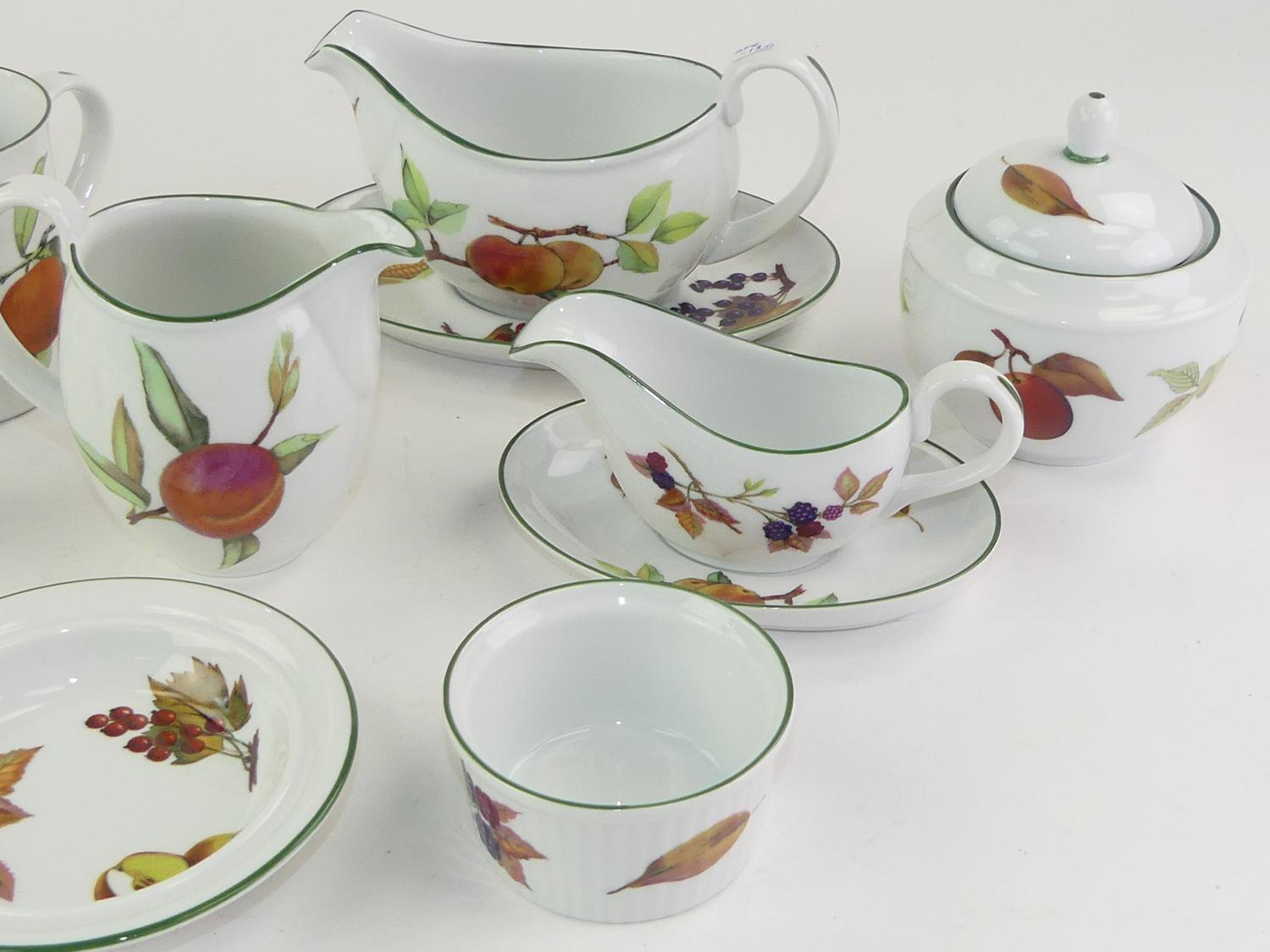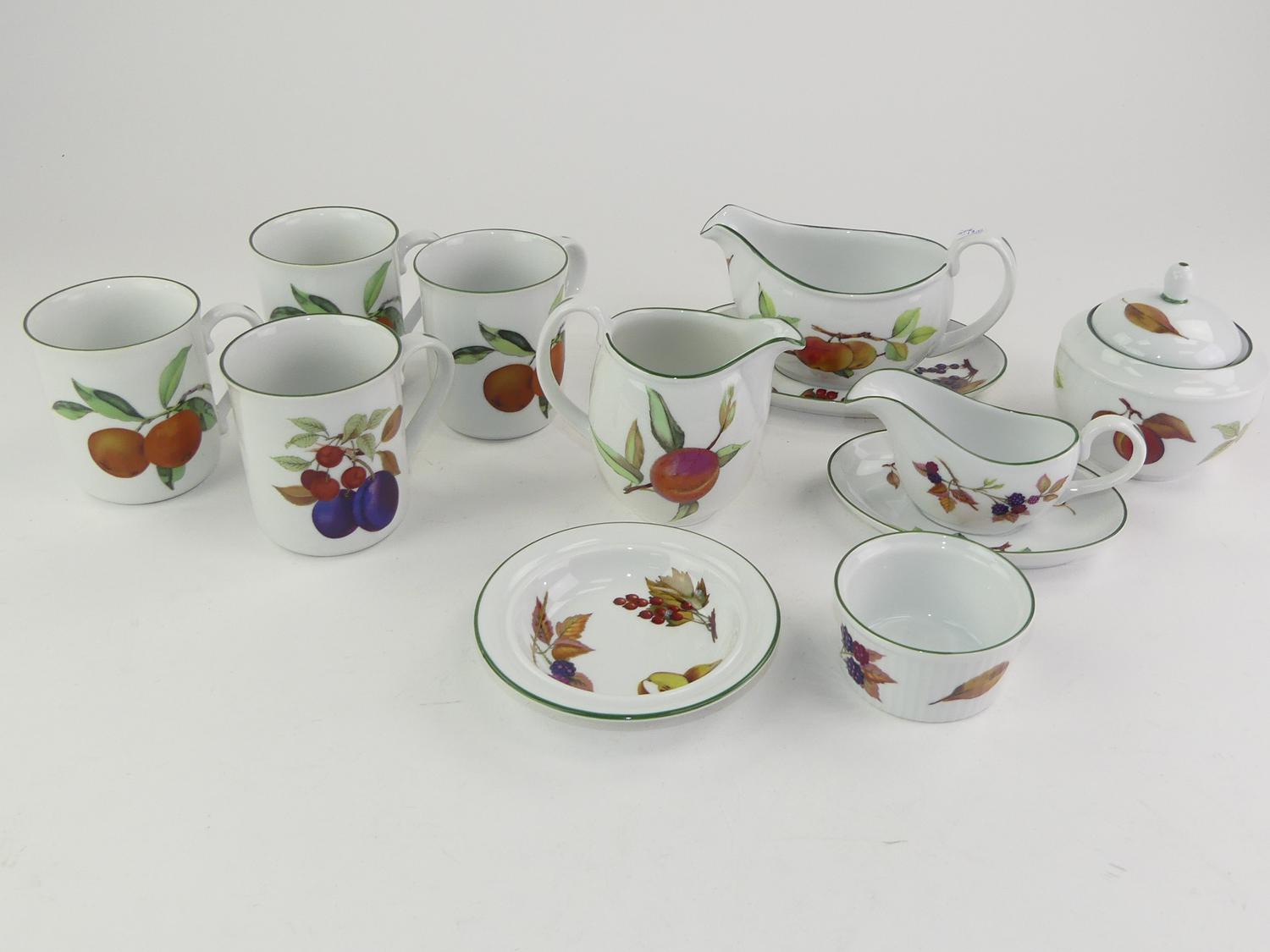 10 pieces royal worcester evesham vale pattern porcelain tablewares including sauce boats, cream and sugar, four mugs etc.