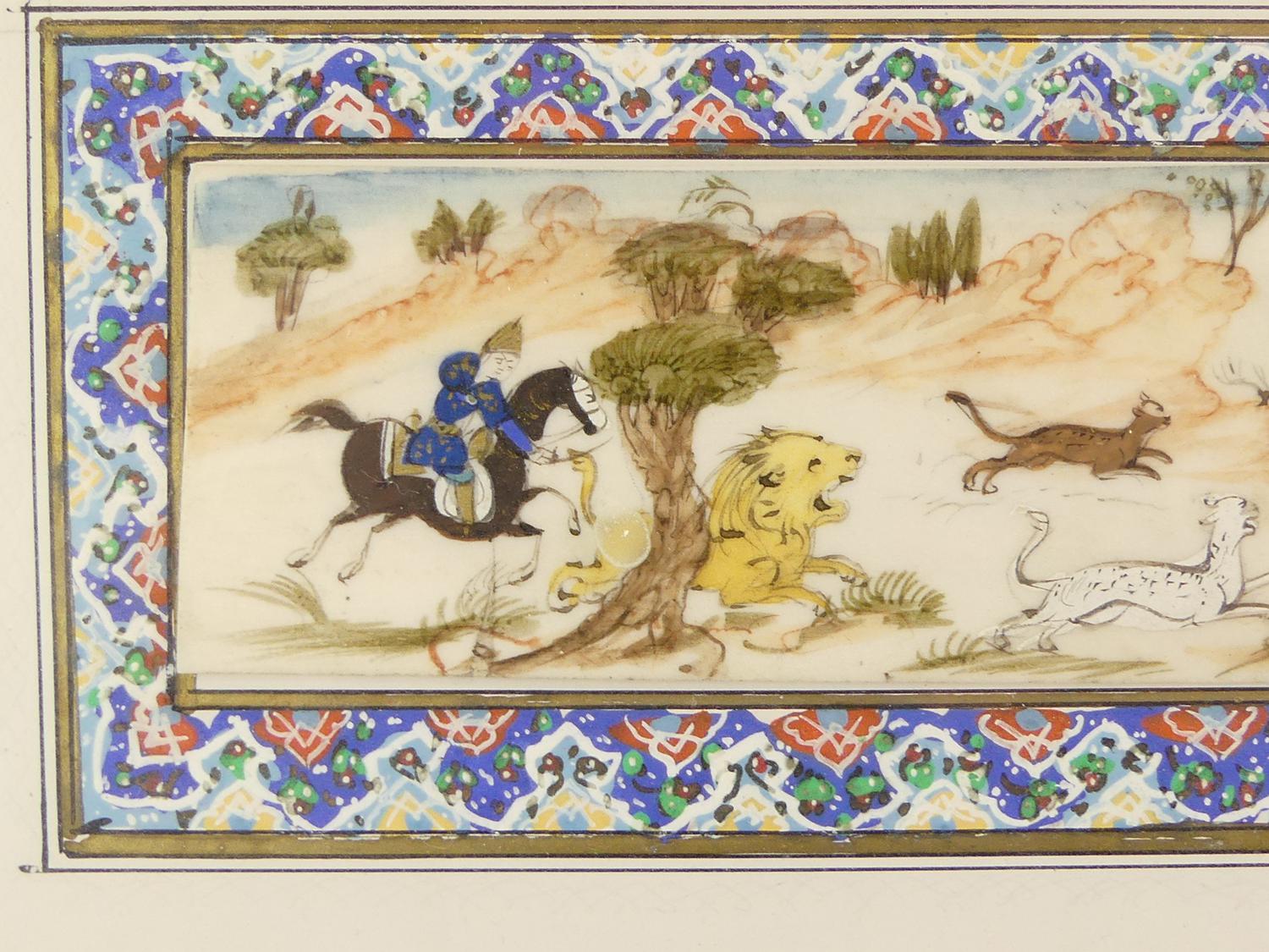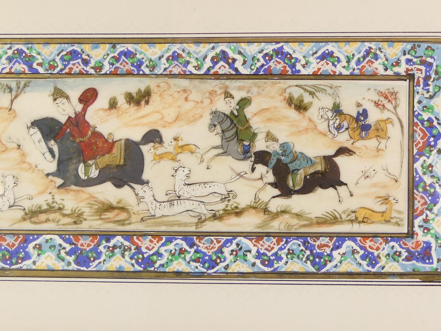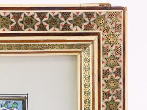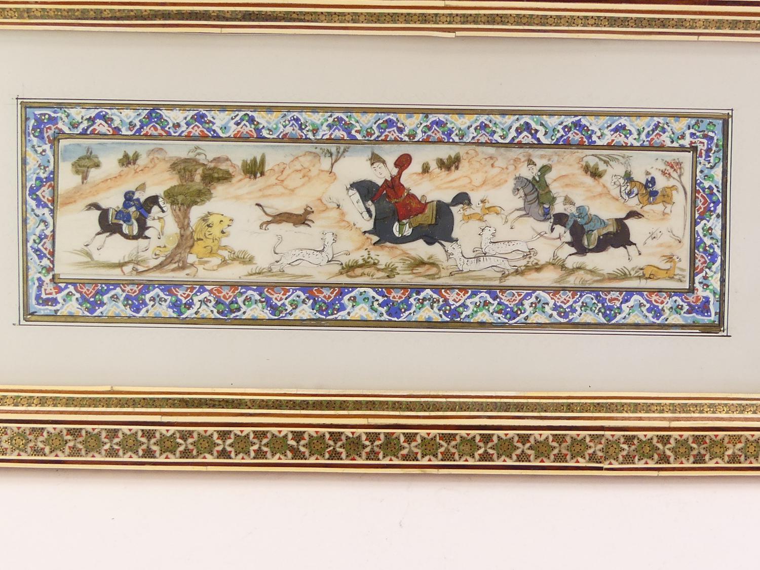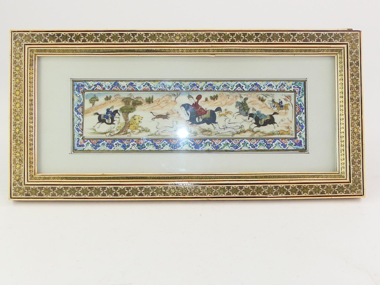middle eastern miniature painting on ivory in a micro mosaic frame, early 20th century, 7" x 14 1/2"