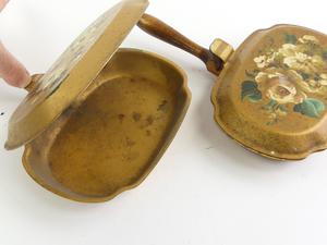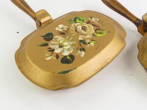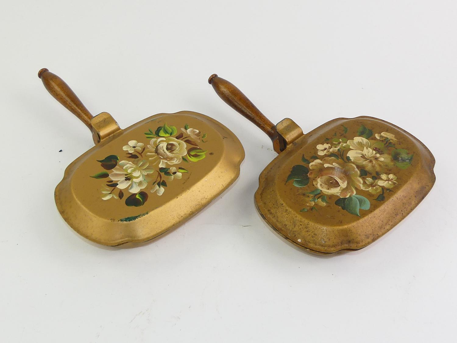 pair of matching hand painted tole crumb trays with turned handles, length 11"