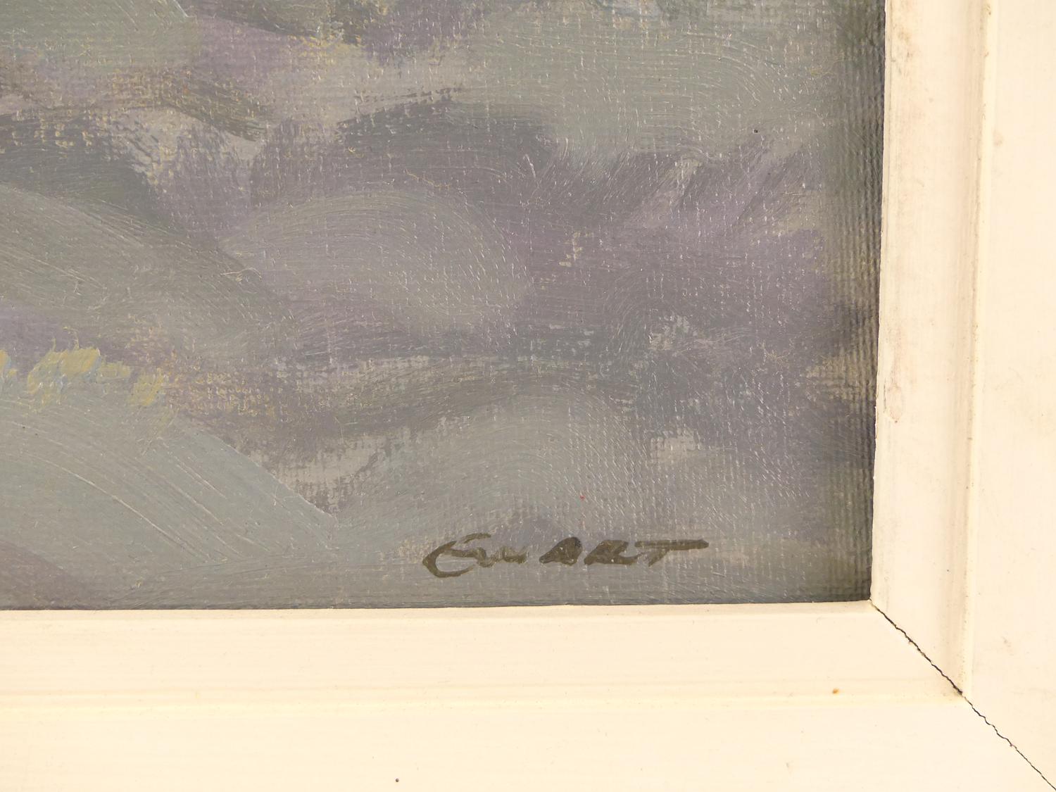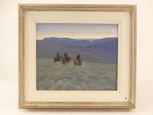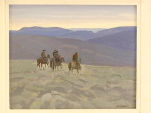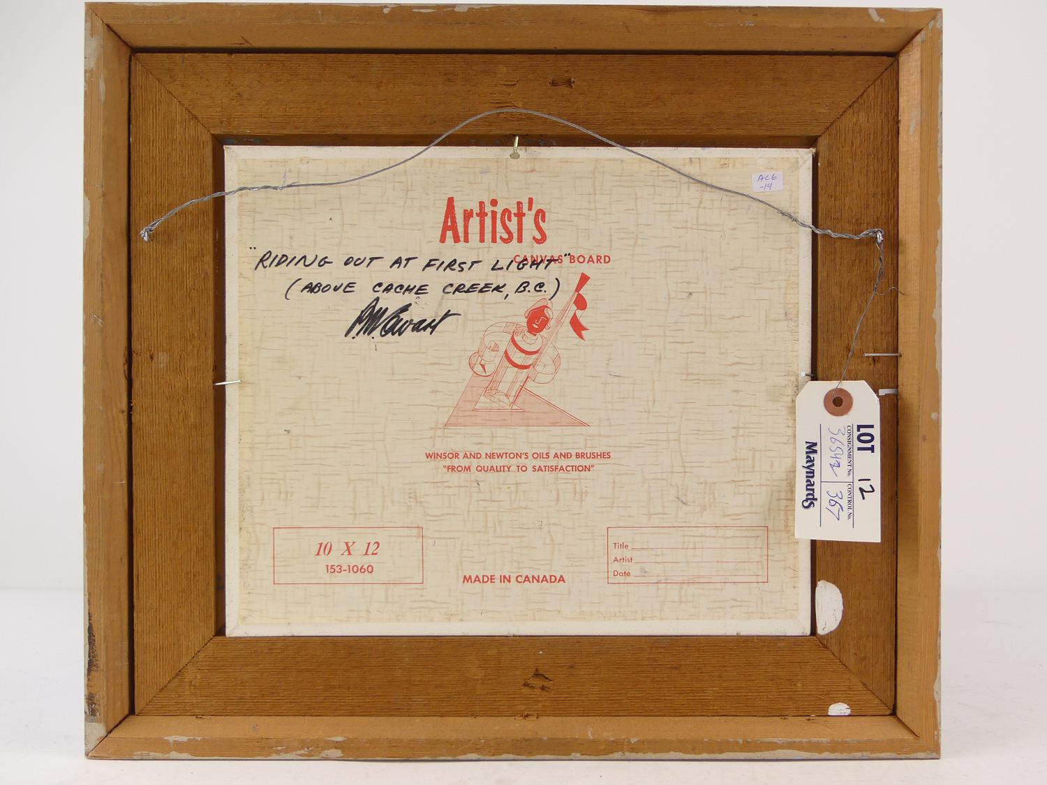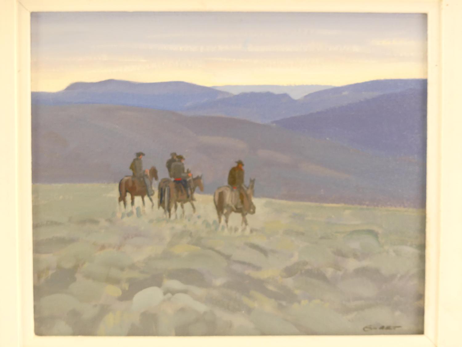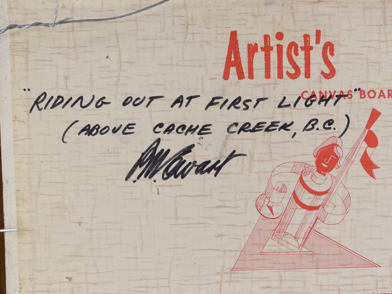 peter maxwell ewart (1918-2001), oil on board, 10" x 12", "riding out at first light (above cache creek, bc)"