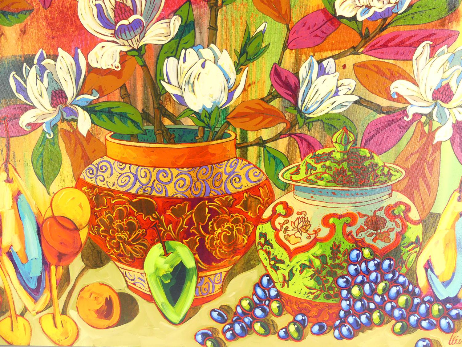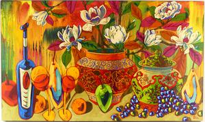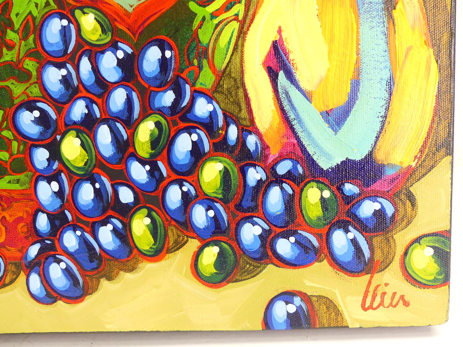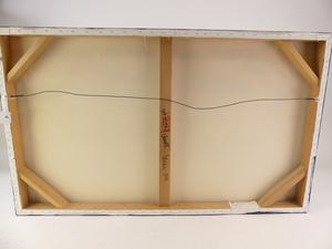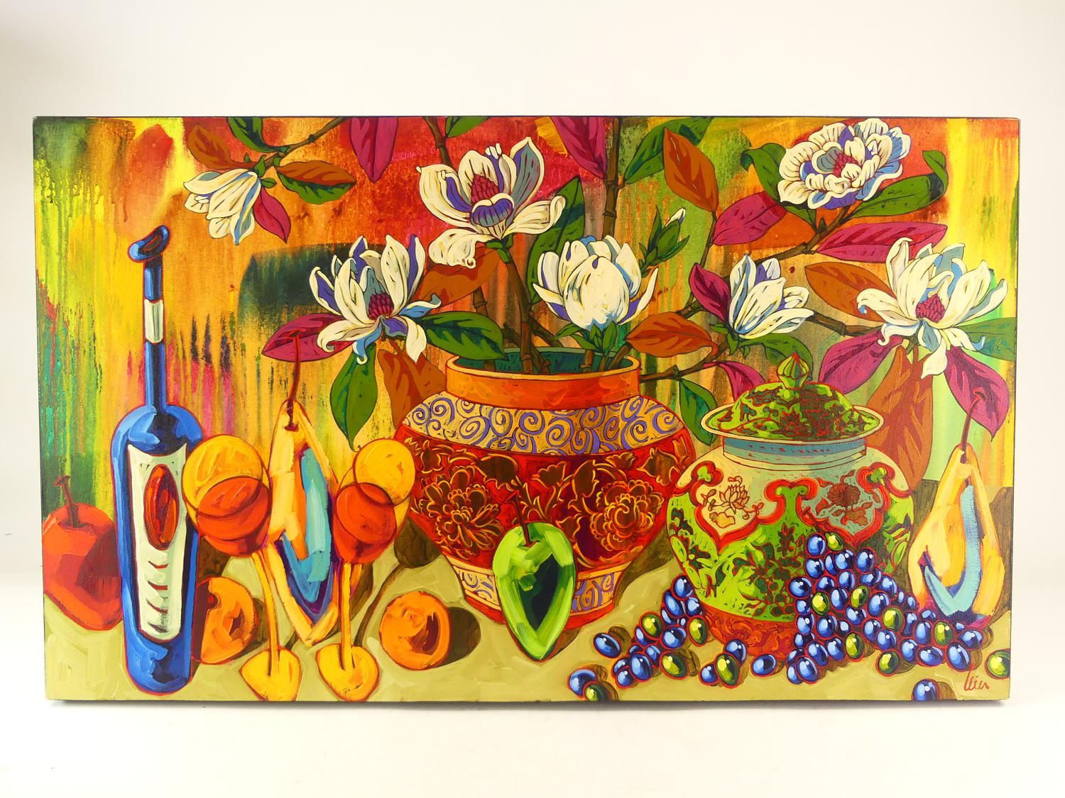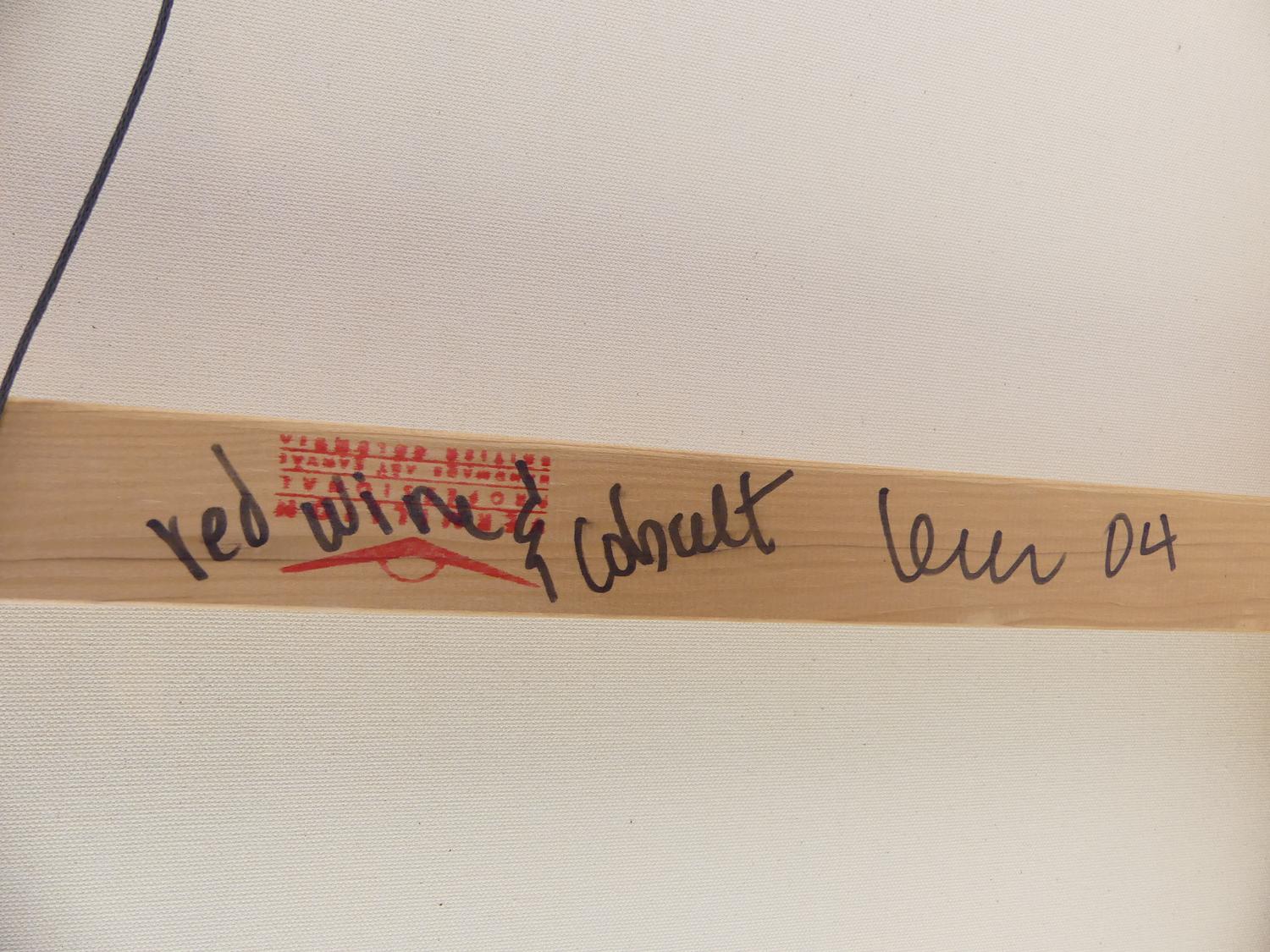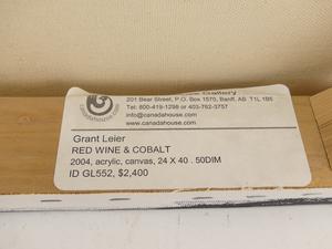 grant leier (b.1956), acrylic on canvas, d.2004, 24" x 40", "red wine & cobalt"