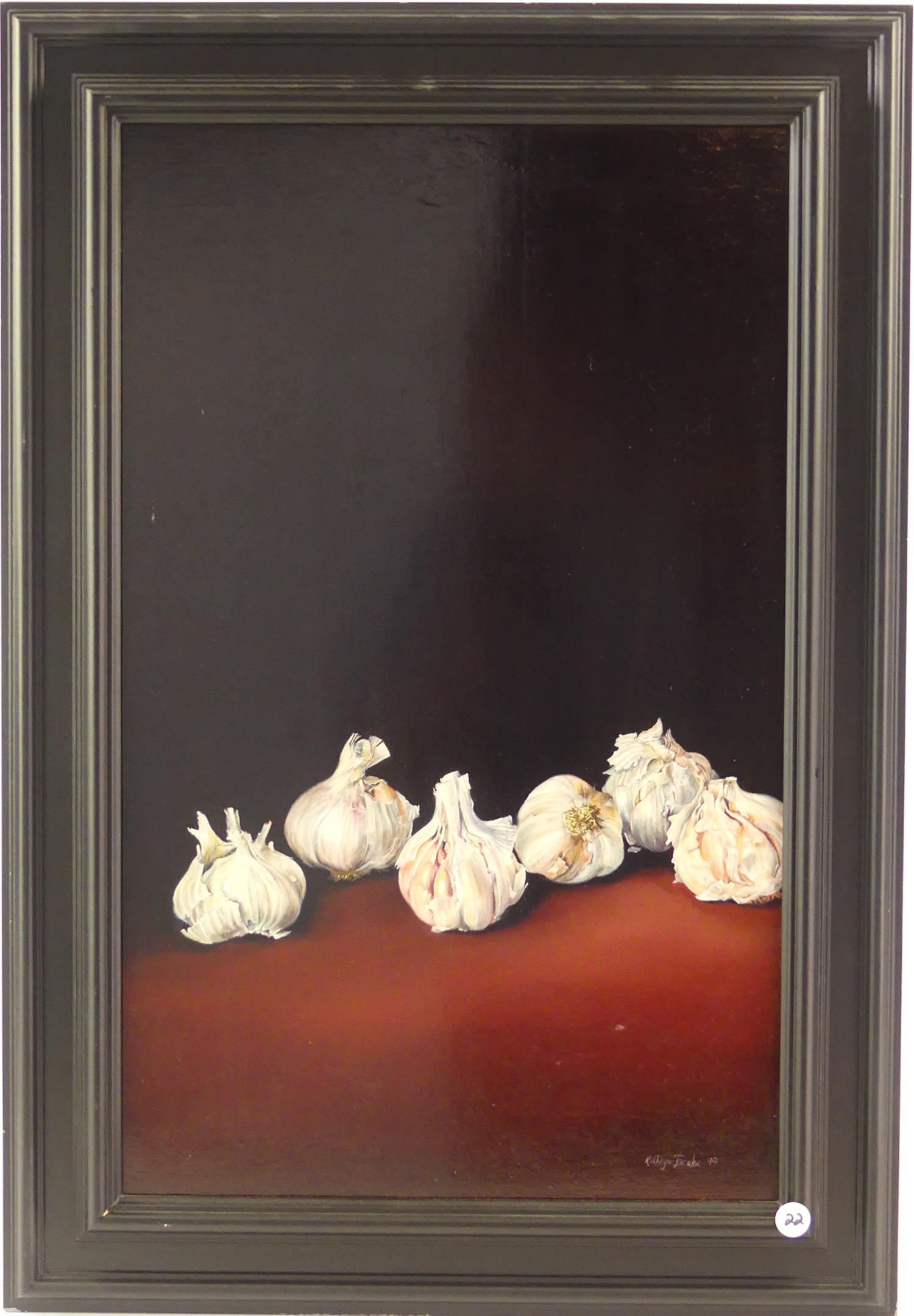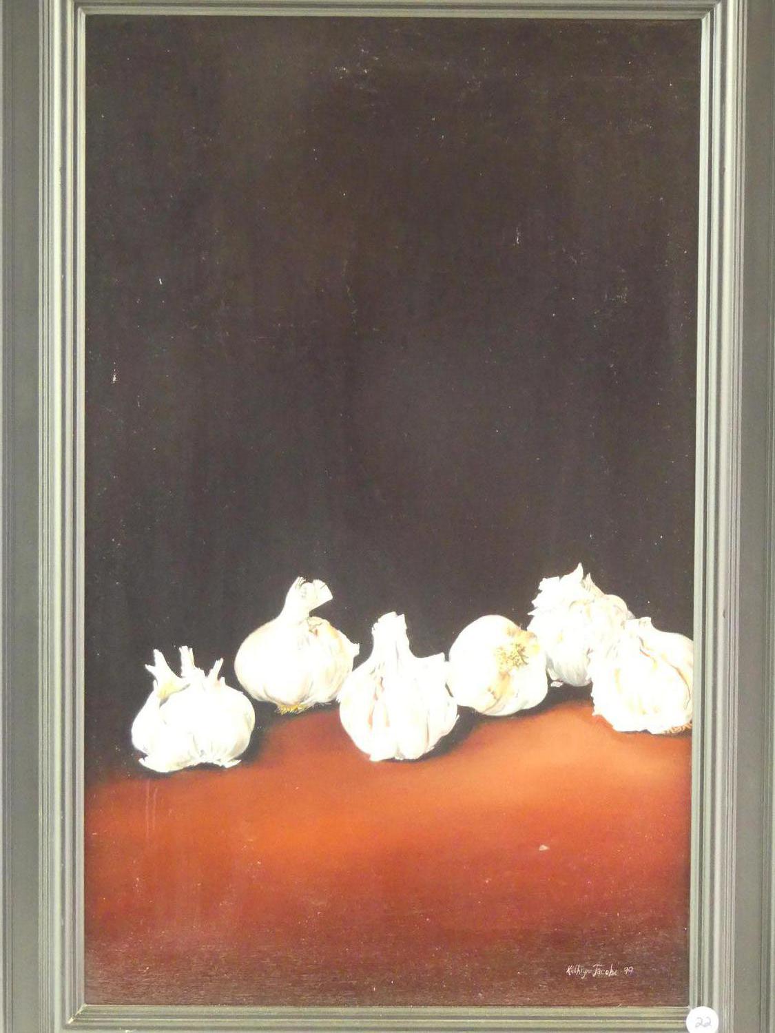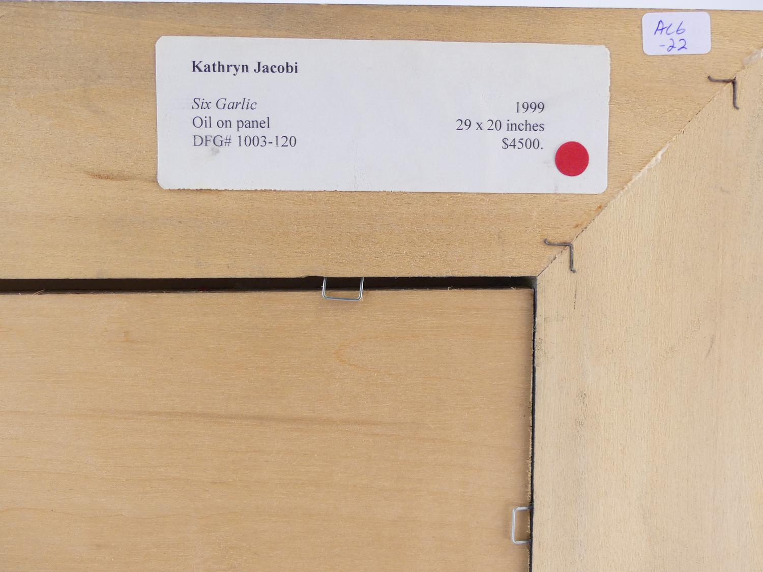 kathryn jacobi (b.1947), oil on panel, d.1999, 24" x 15", "six garlic"