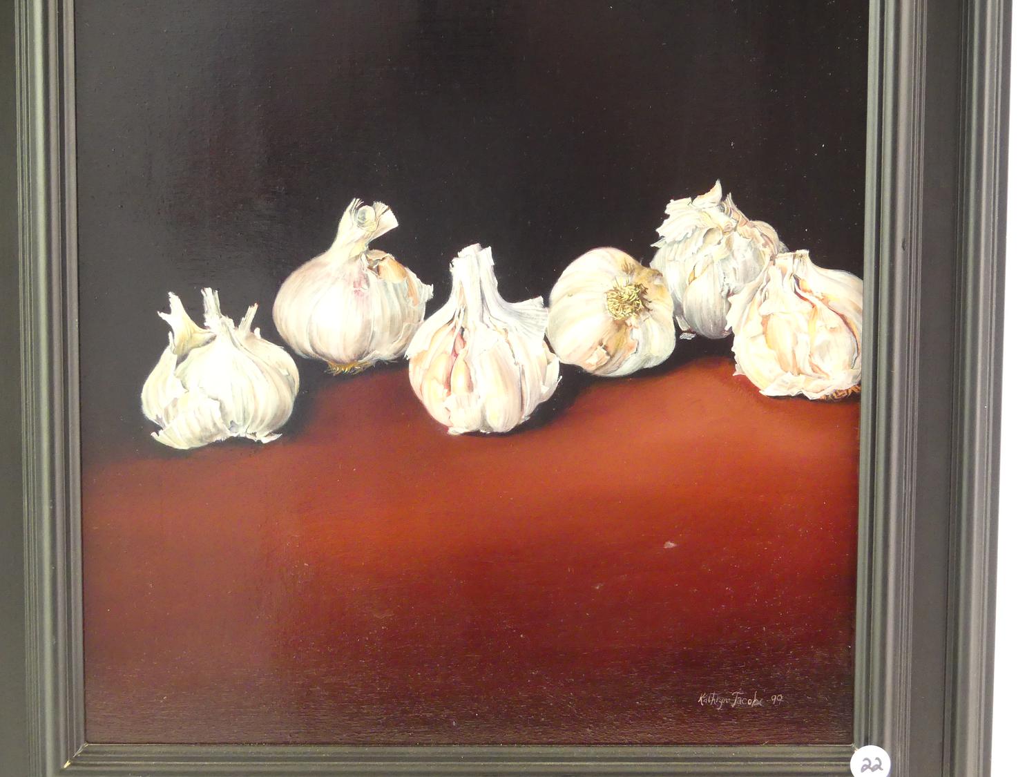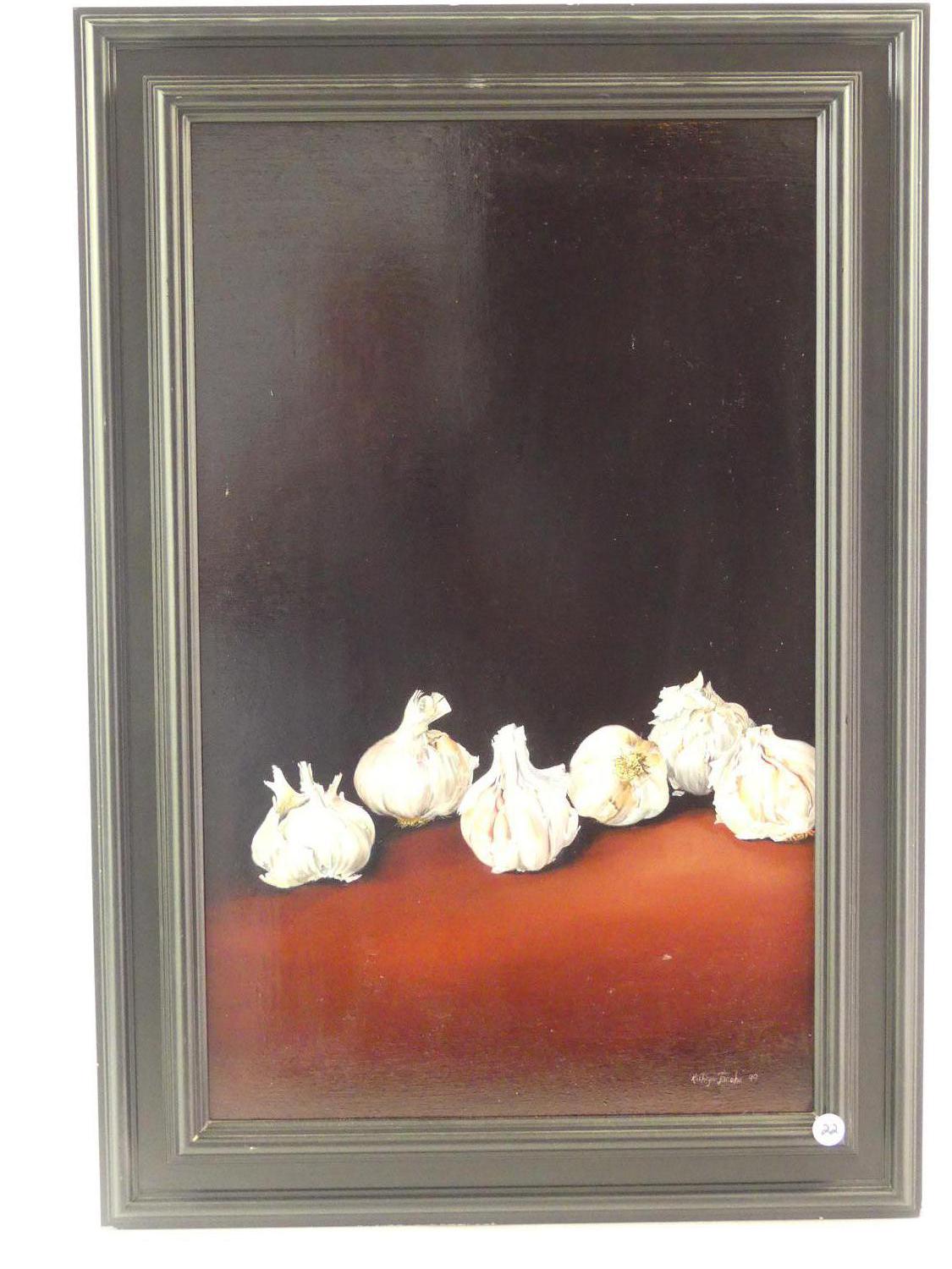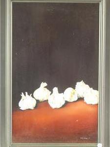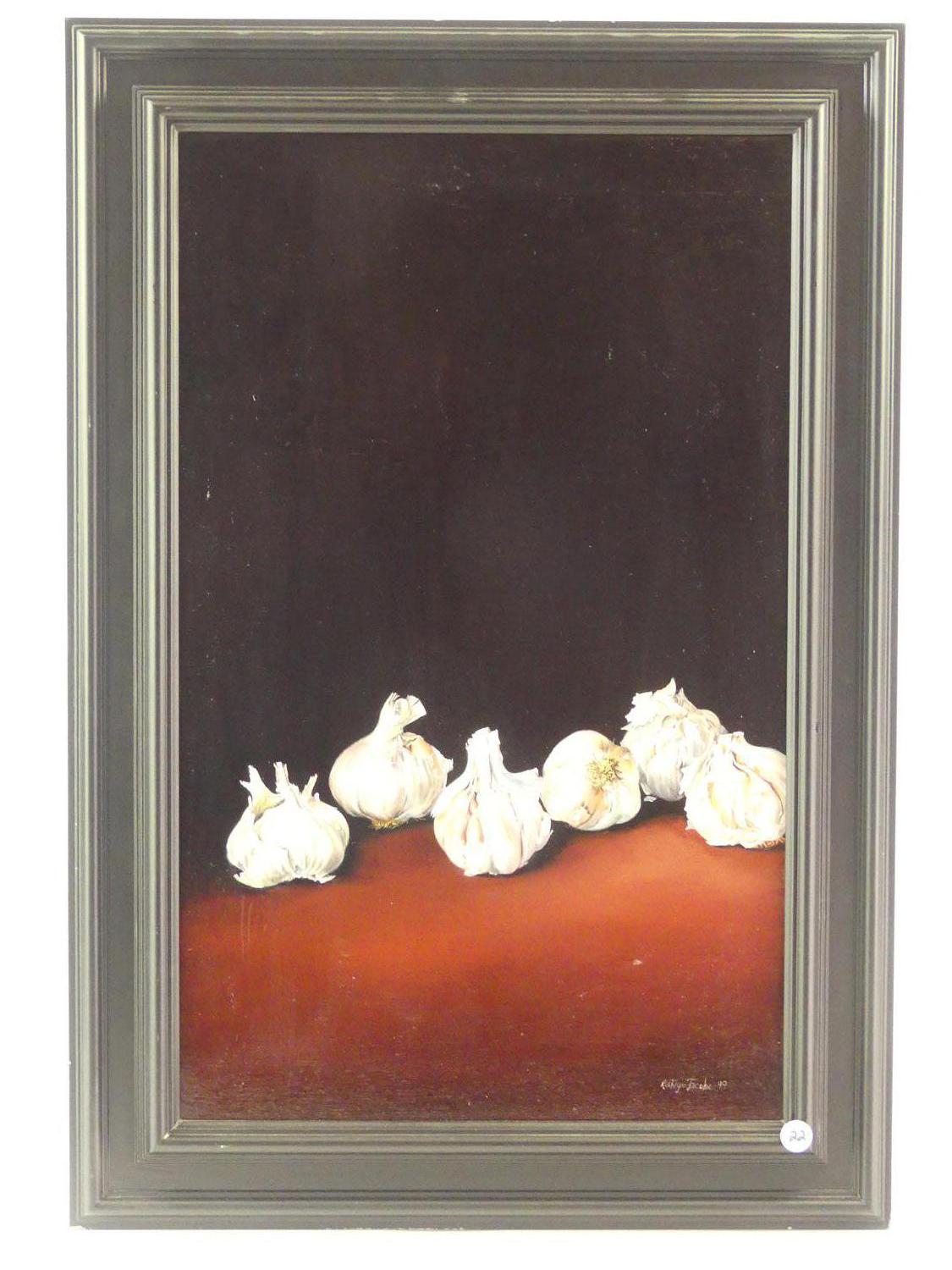 kathryn jacobi (b.1947), oil on panel, d.1999, 24" x 15", "six garlic"