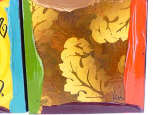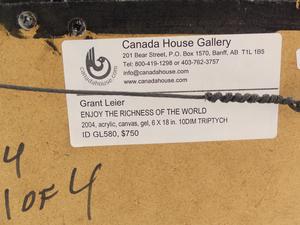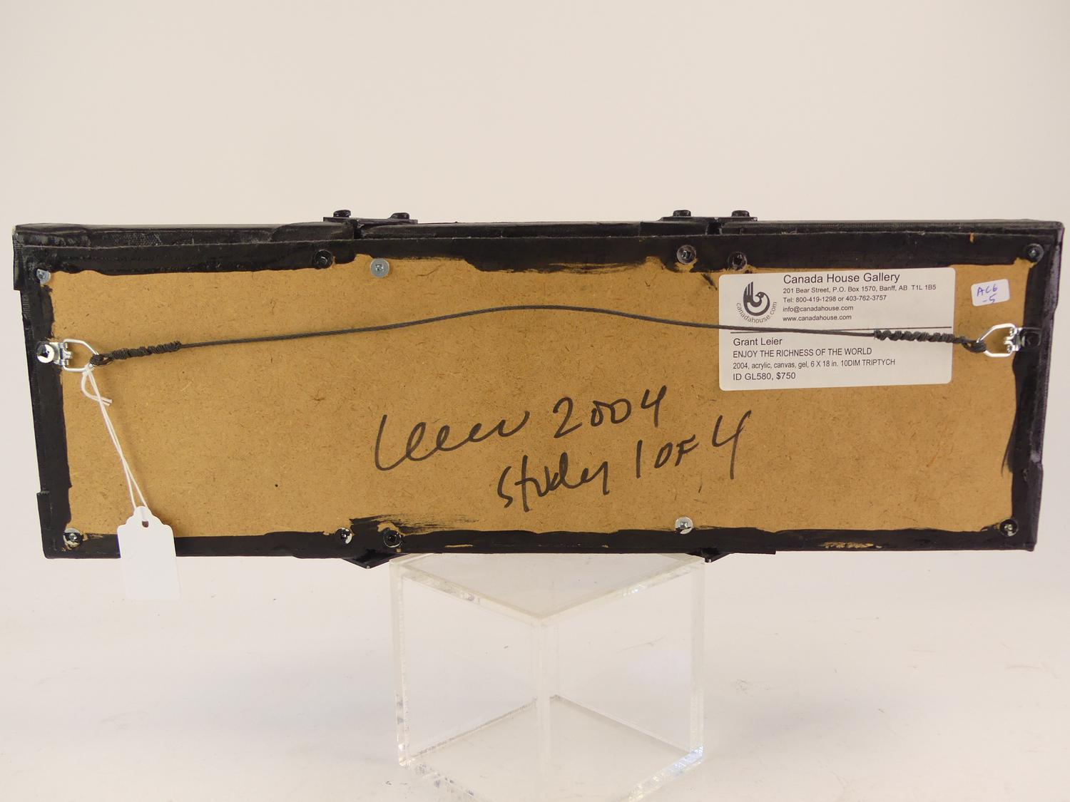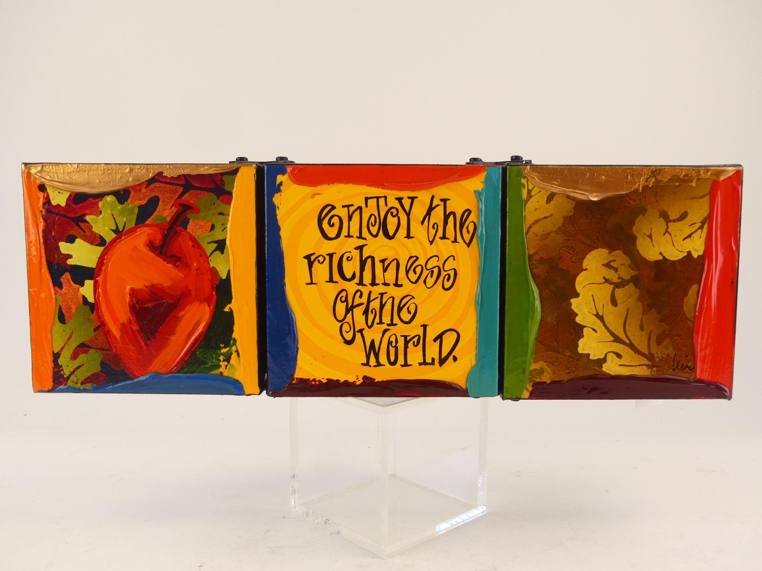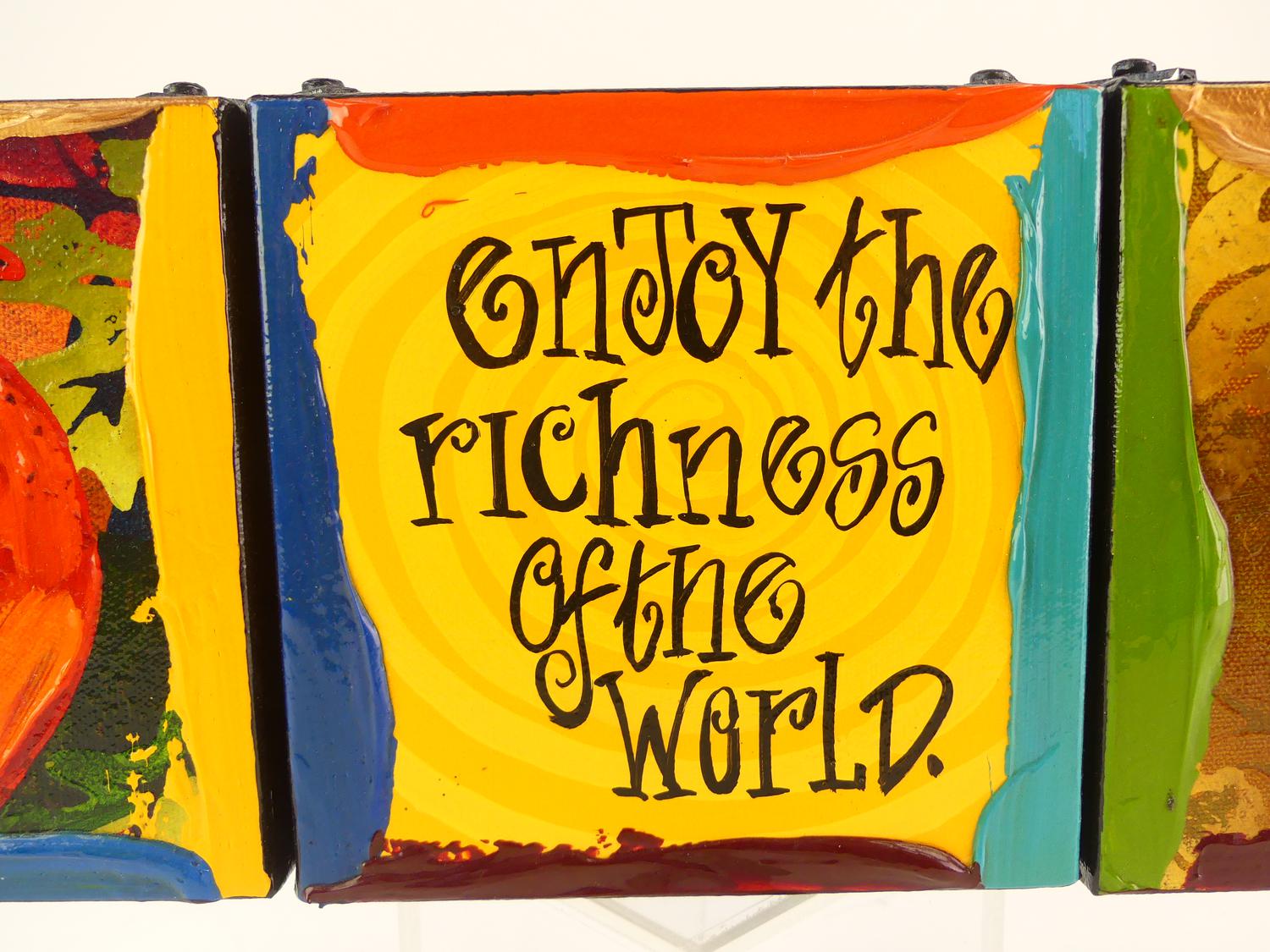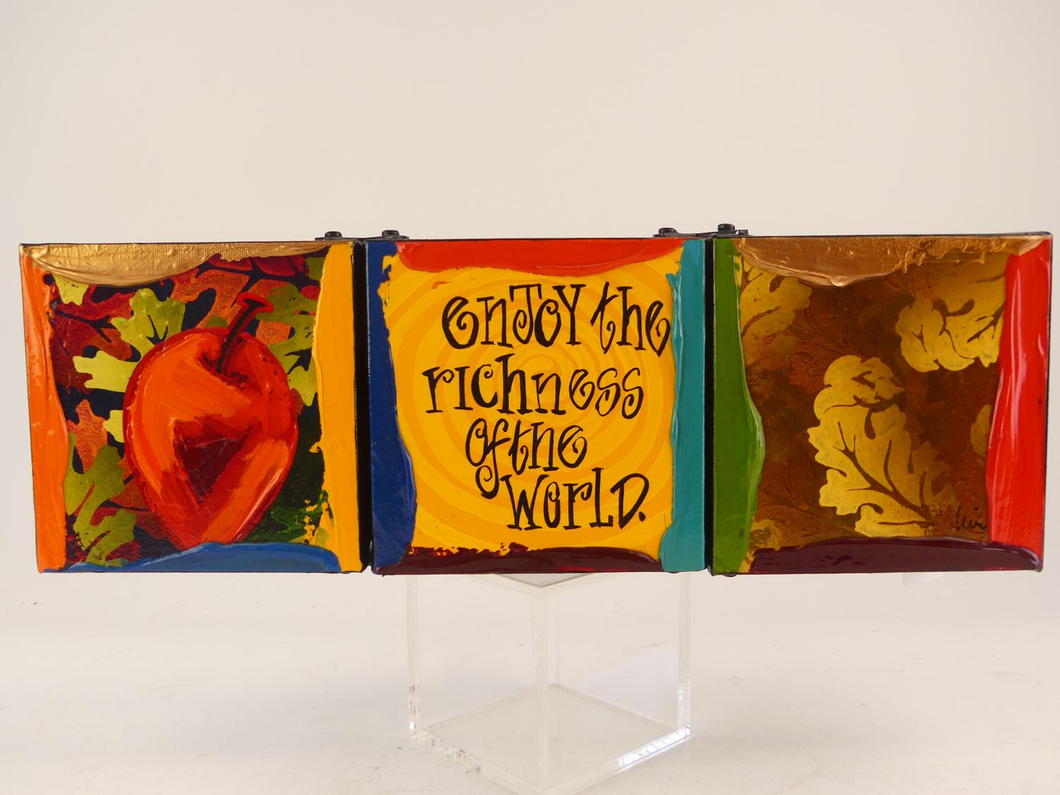 grant leier (b.1956), acrylic on canvas triptych, total 6" x 18", "enjoy the richness of the world"