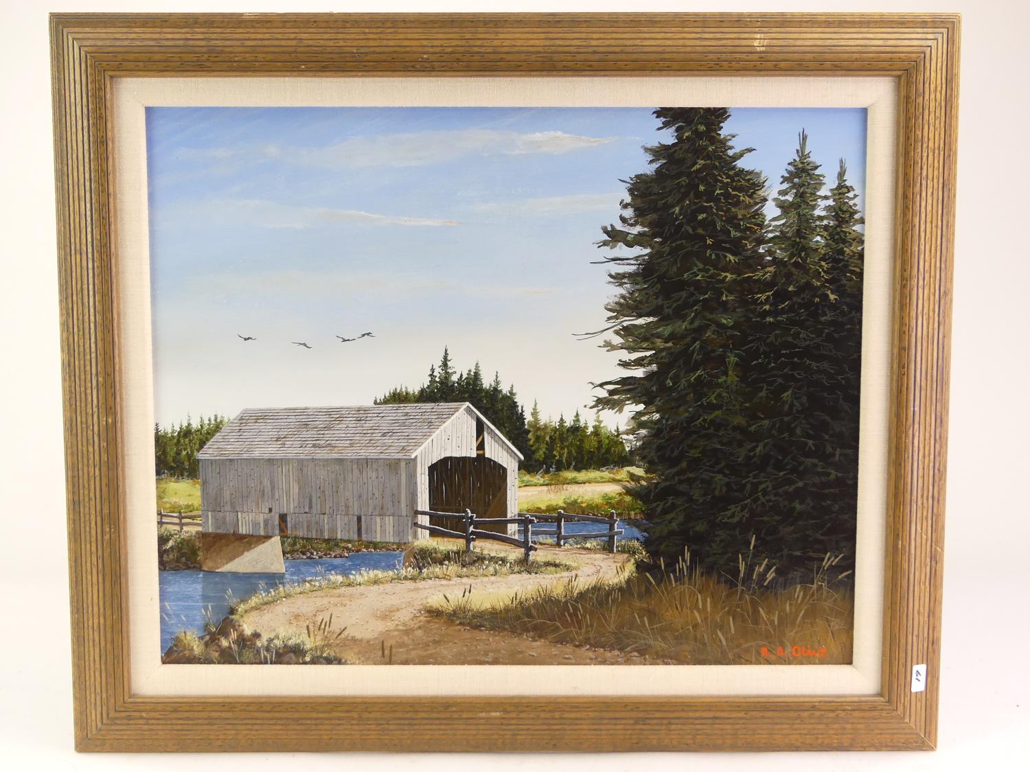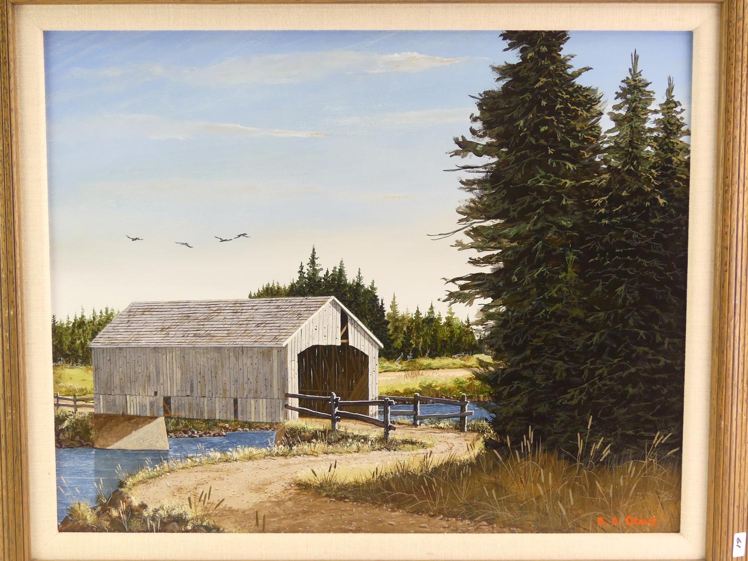r. a. olive, oil on board, 16" x 20", "the old covered bridge"