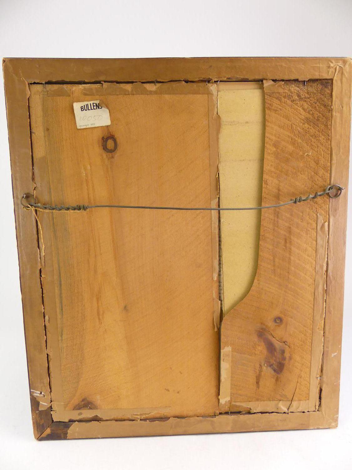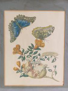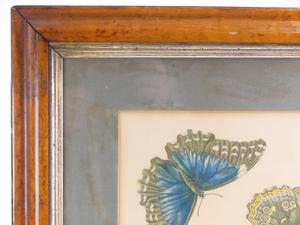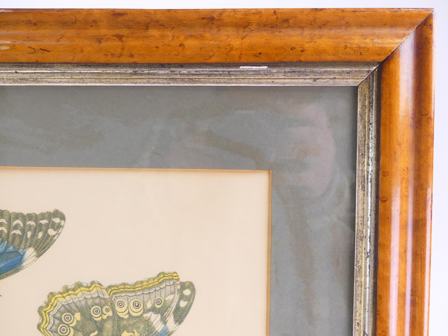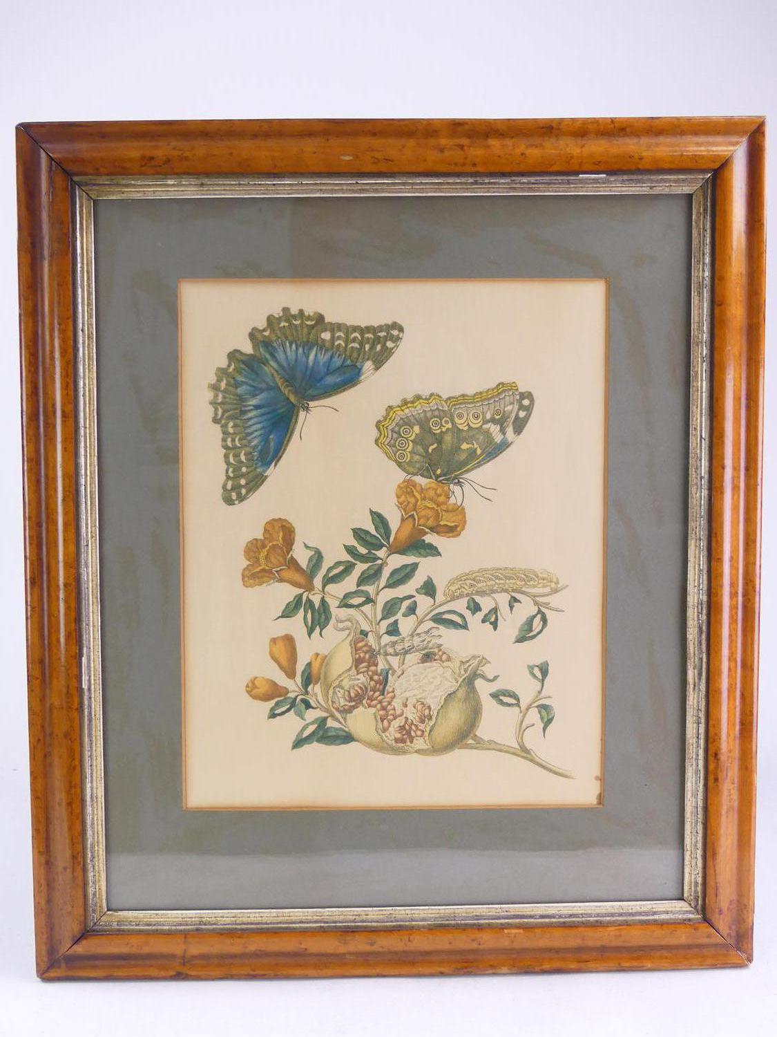 antique parcel gilt birds-eye maple frame, overall 23 1/2" x 20", with a colour print of insects and flowering fruit