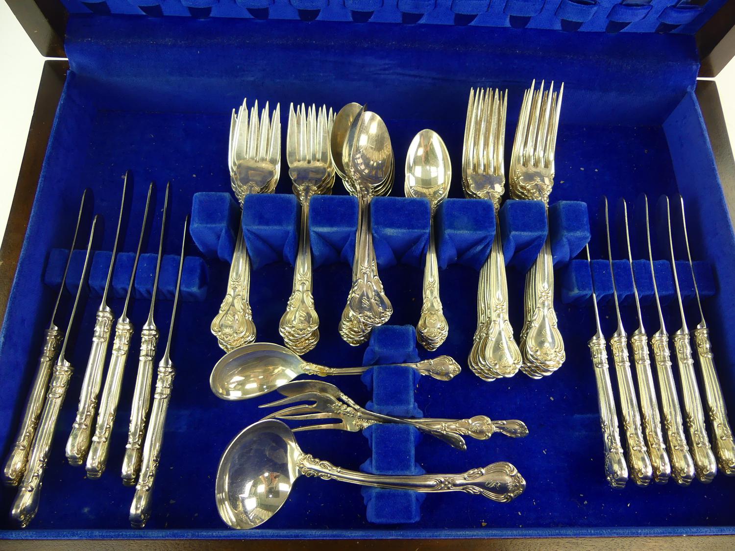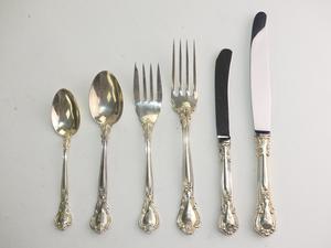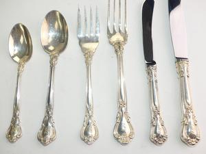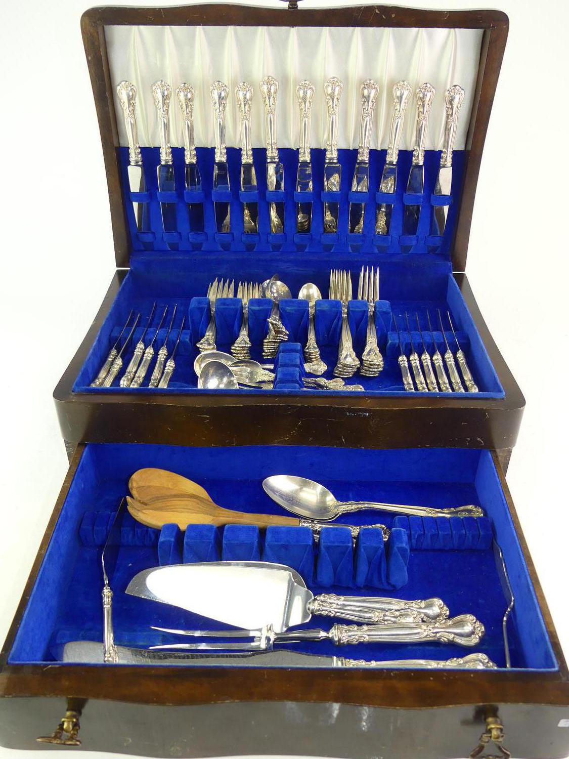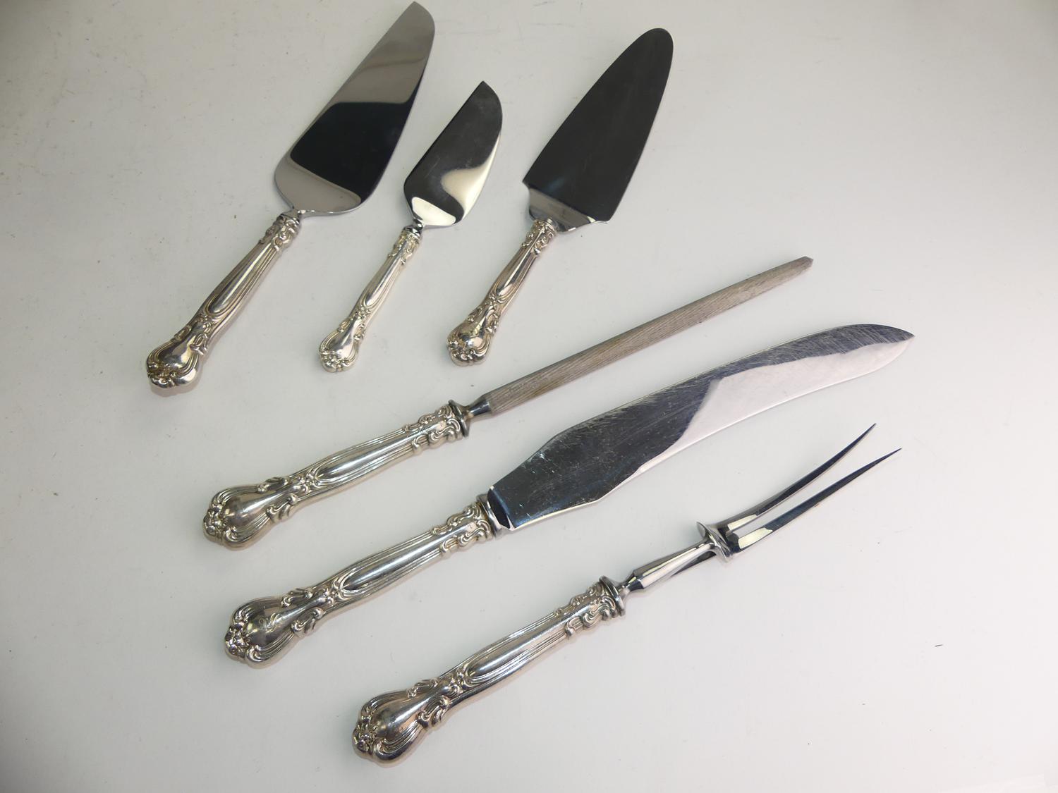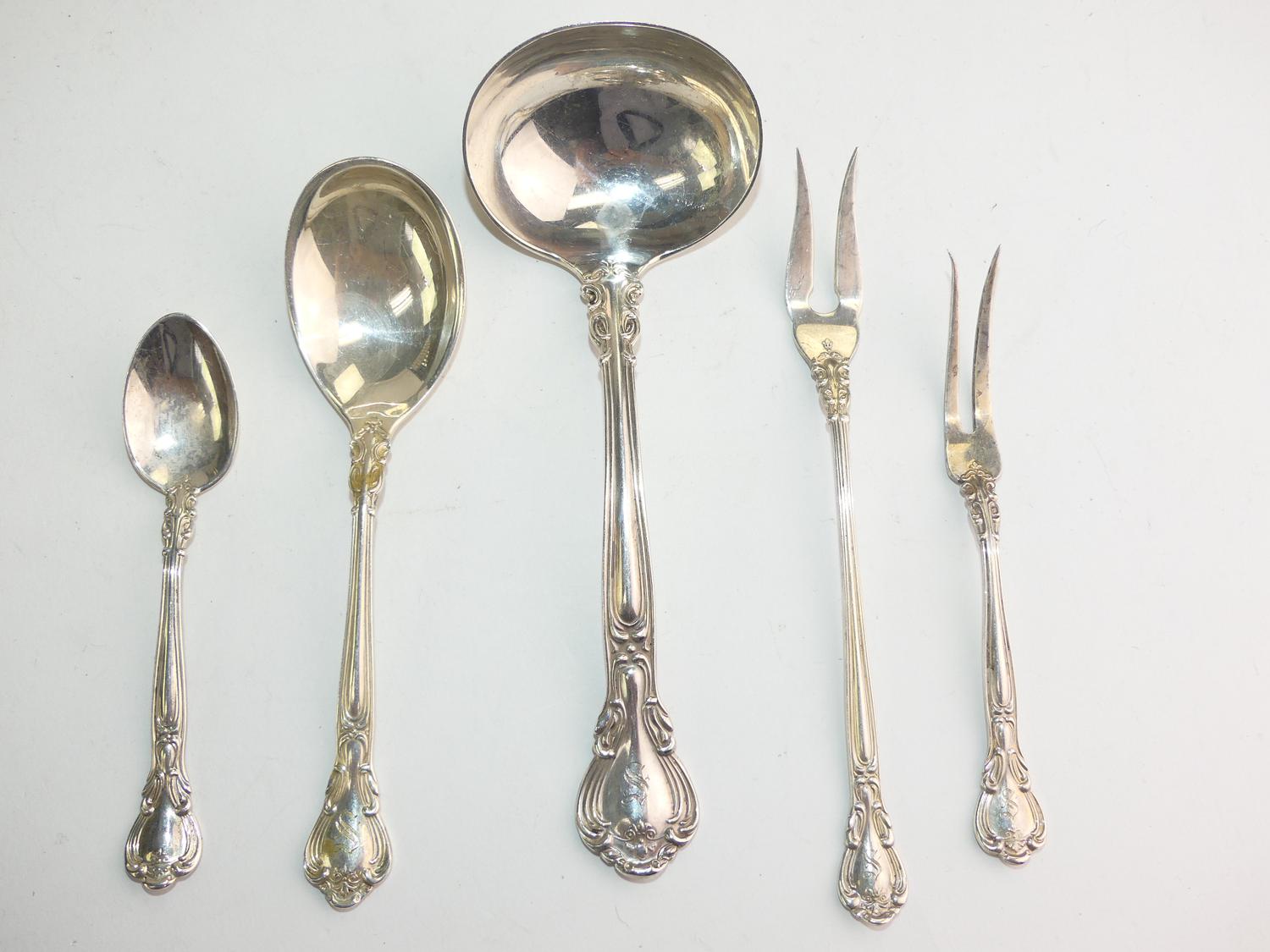 12 dinner knives 8 1/2"12 dinner forks 7"12 salad forks 6"12 spoons 5 3/4"12 butter knives8 tea spoons 5"1 coffee spoon 4 1/4"2 horderve forks1 serving spoon 5 1/2"1 ladle 6 1/4"2 serving spoons 8 1/2"1 cake knife 10 1/2"1 cake lifter 9"1 cake knife 6 3/4"2pc salad servers1 butter knife 6 1/4"3pc carving set