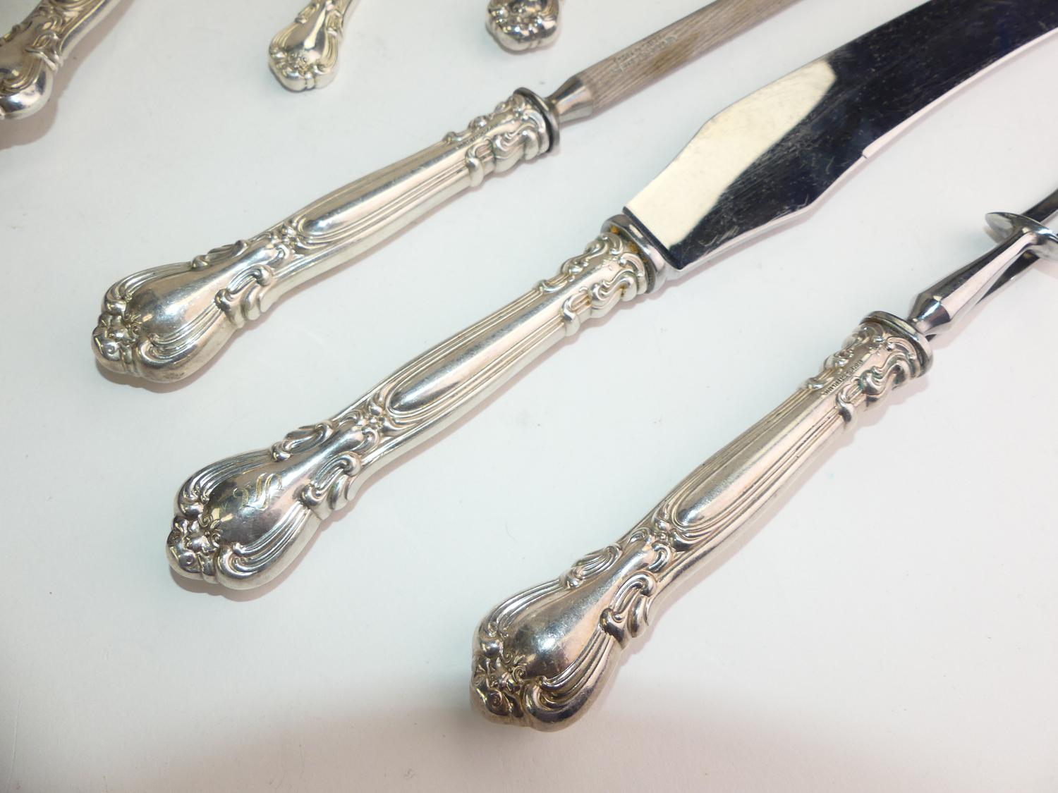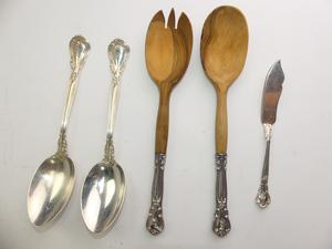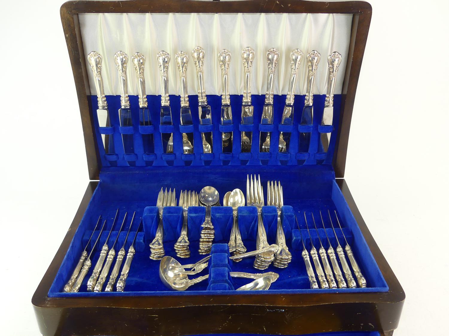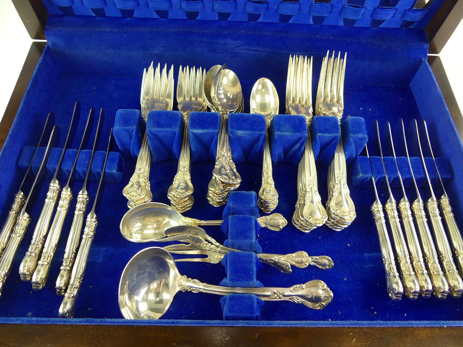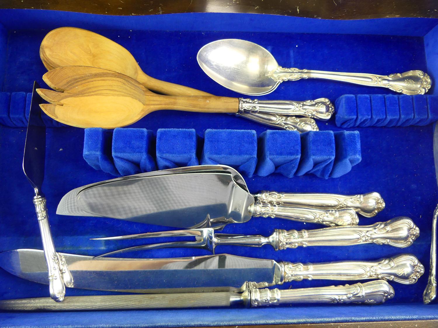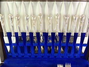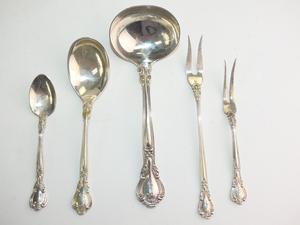 12 dinner knives 8 1/2"12 dinner forks 7"12 salad forks 6"12 spoons 5 3/4"12 butter knives8 tea spoons 5"1 coffee spoon 4 1/4"2 horderve forks1 serving spoon 5 1/2"1 ladle 6 1/4"2 serving spoons 8 1/2"1 cake knife 10 1/2"1 cake lifter 9"1 cake knife 6 3/4"2pc salad servers1 butter knife 6 1/4"3pc carving set