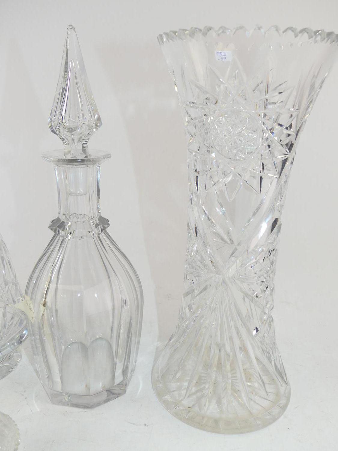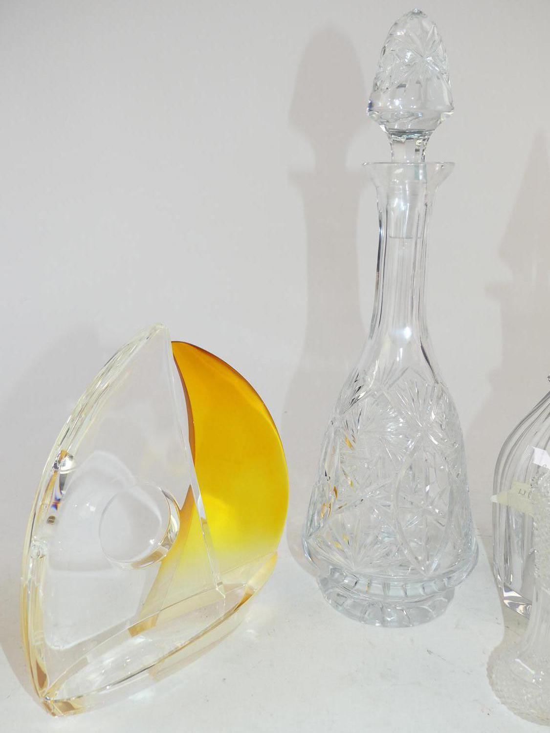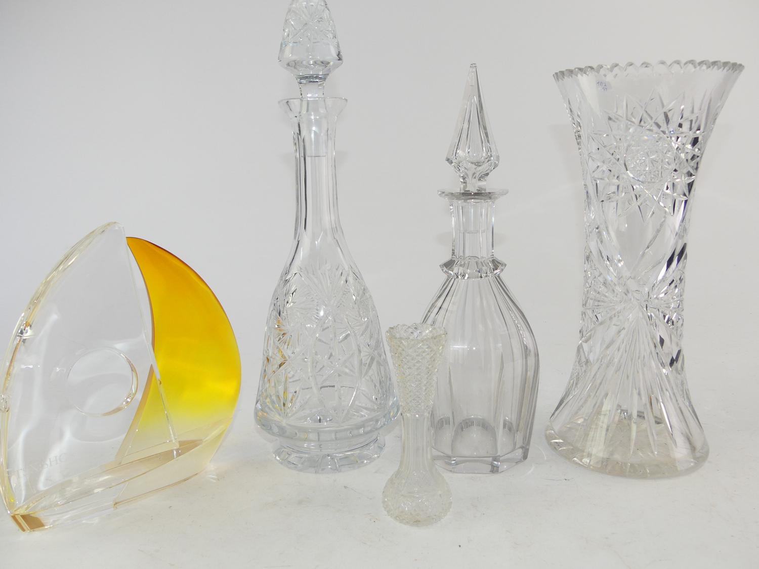 two crystal decanters, crystal vase, sailboat sculpture, etc.
