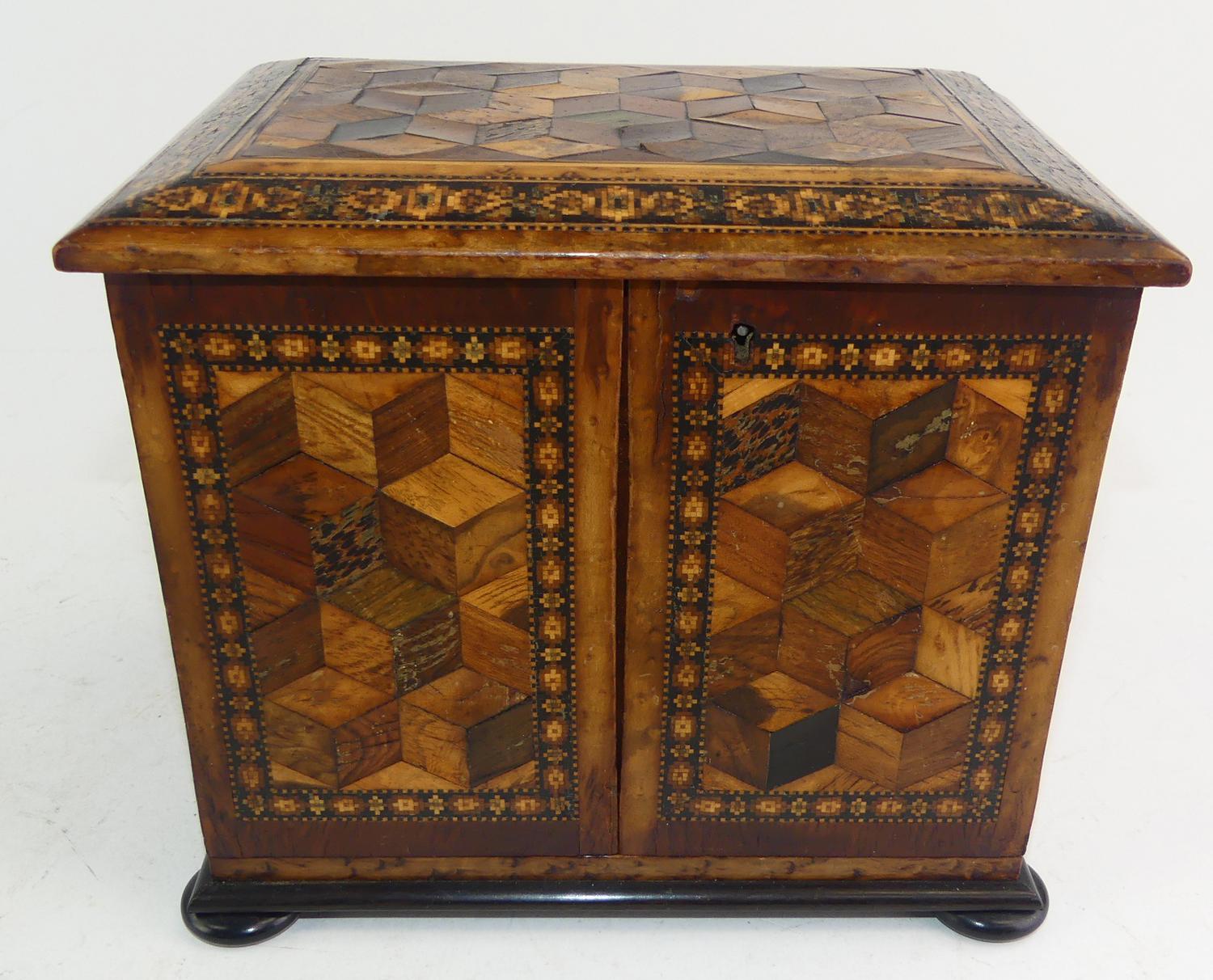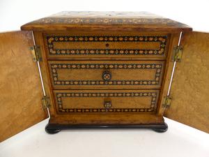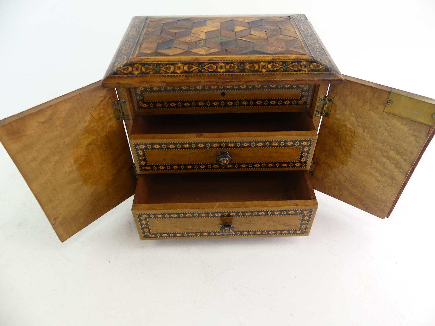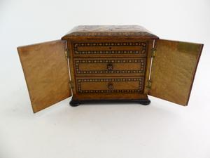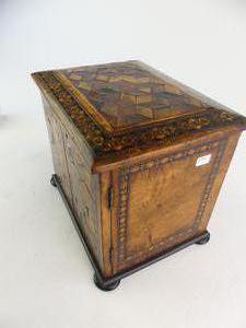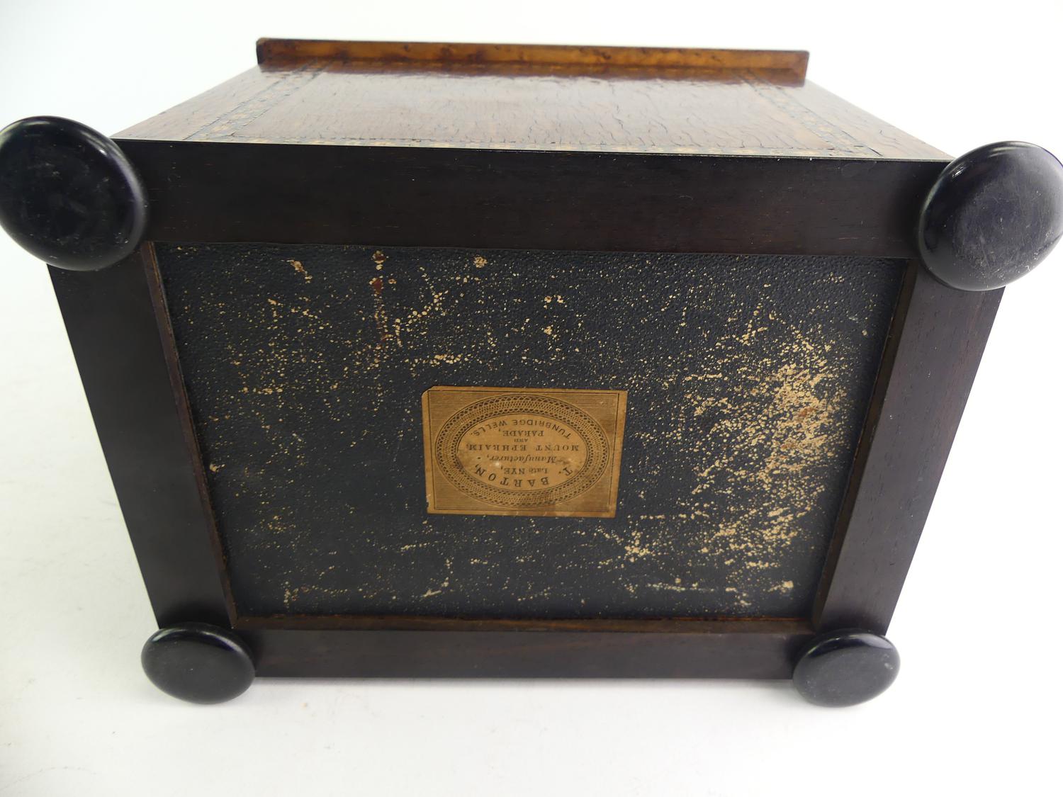 victorian tunbridge ware inlaid dresser chest, labeled t. barton, late nye, manufacturer, mount ephraim and parade, tunbridge wells, english mid 19th century, 7" x 8 1/4" x 6 1/4"