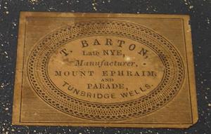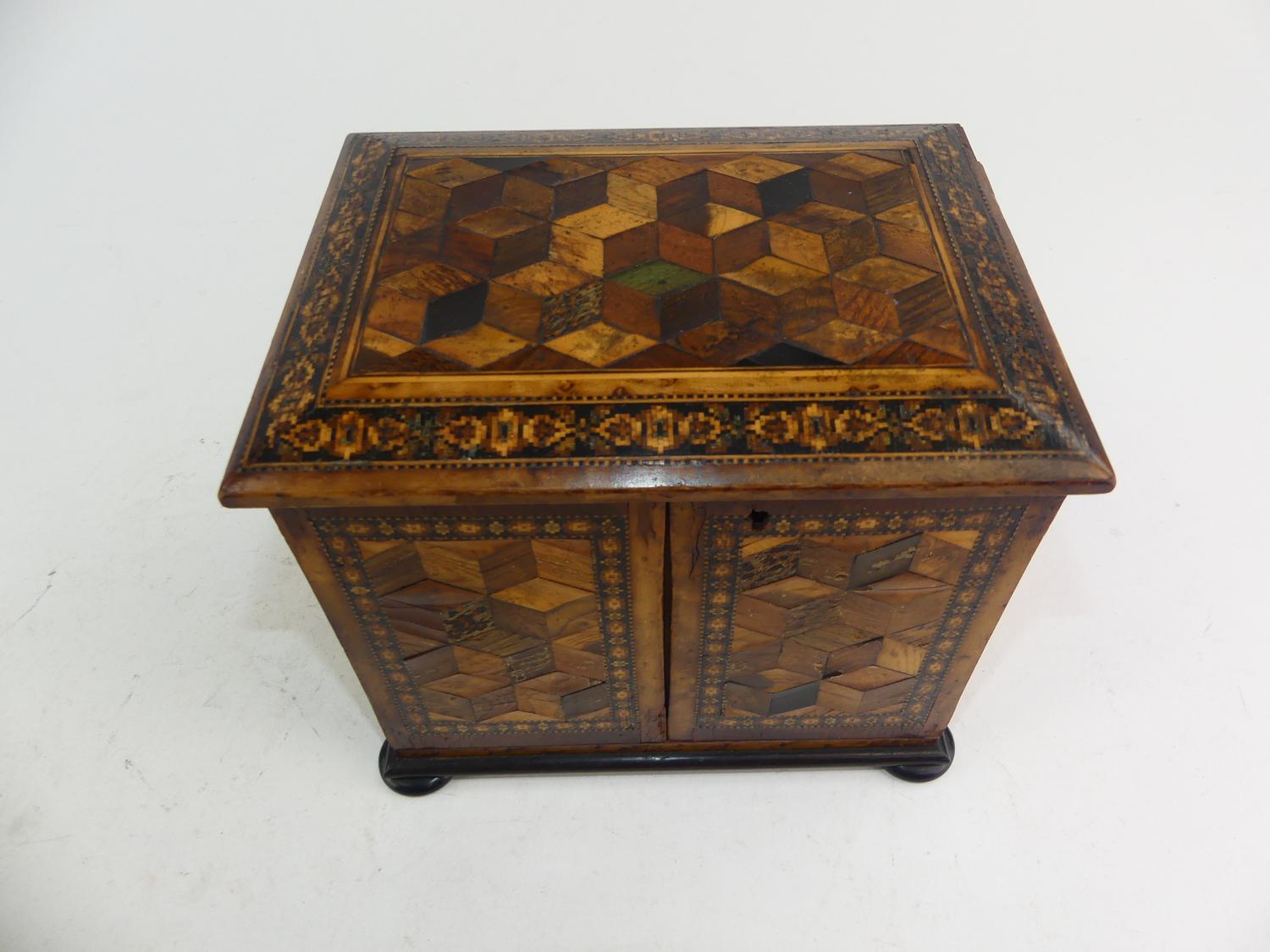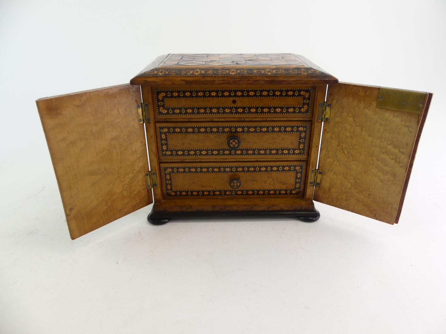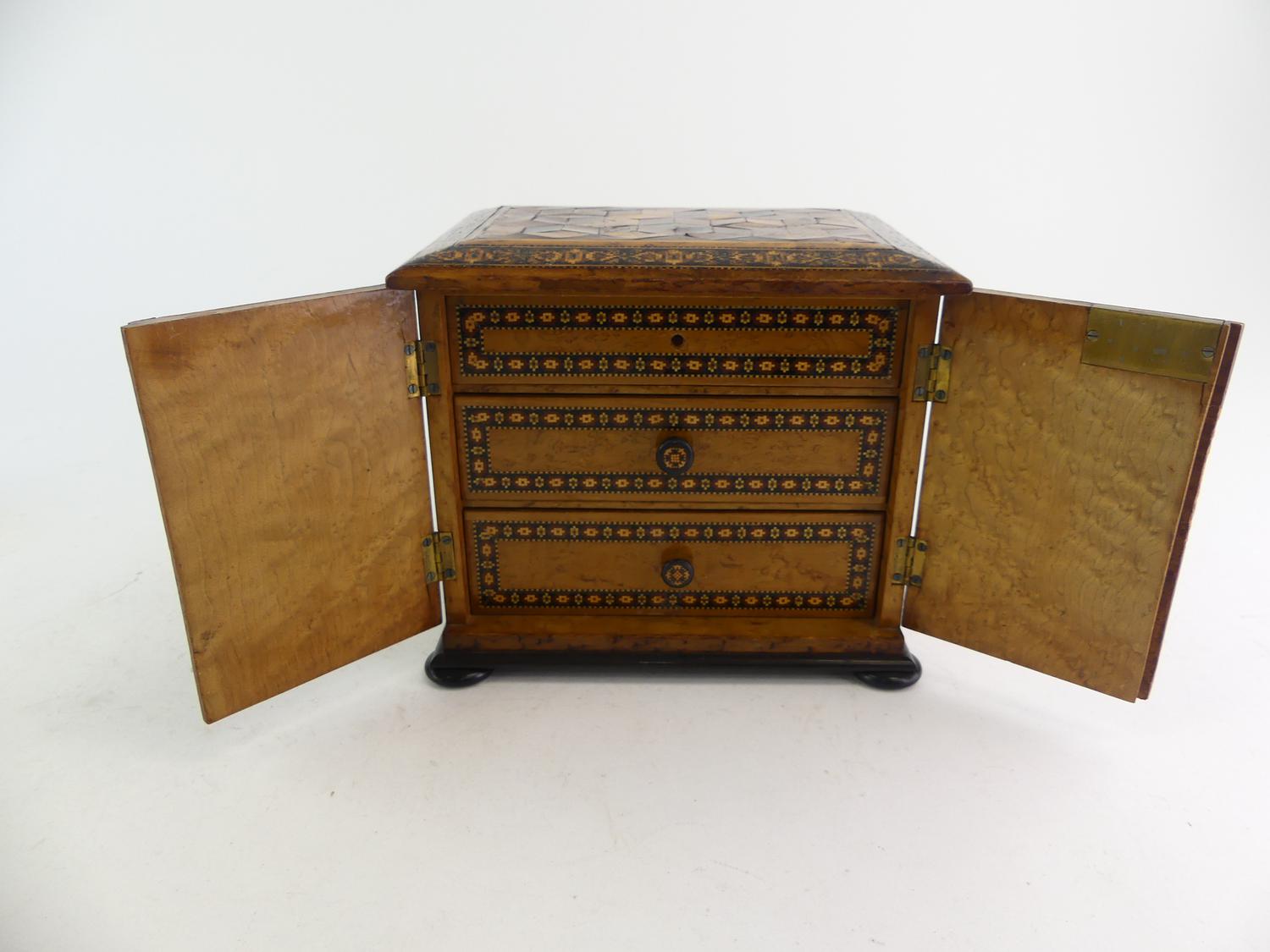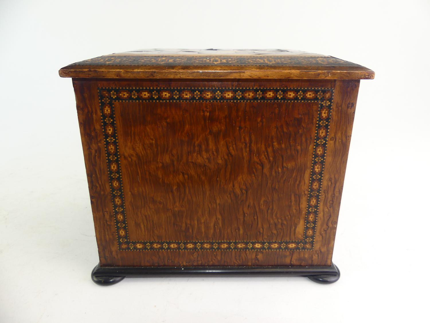 victorian tunbridge ware inlaid dresser chest, labeled t. barton, late nye, manufacturer, mount ephraim and parade, tunbridge wells, english mid 19th century, 7" x 8 1/4" x 6 1/4"