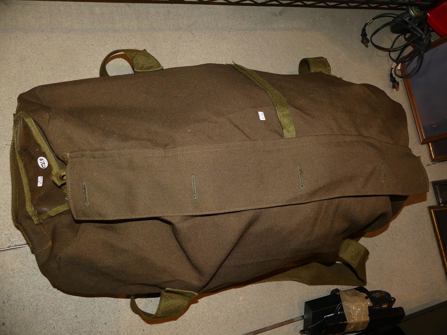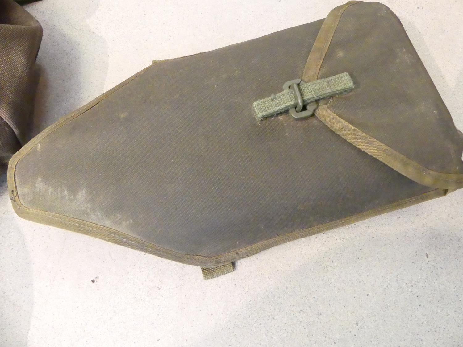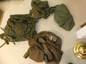 canadian military duffel bag, two other duffel bags, two rucksacks, military shovel
