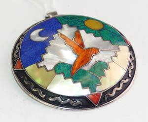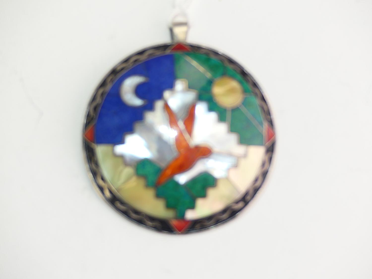 vintage 950 silver hallmarked inlaid mother of pearl, matric pendant, diameter 2 1/4"