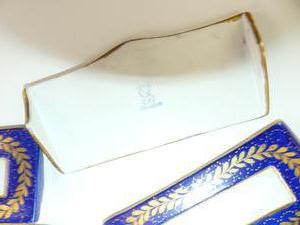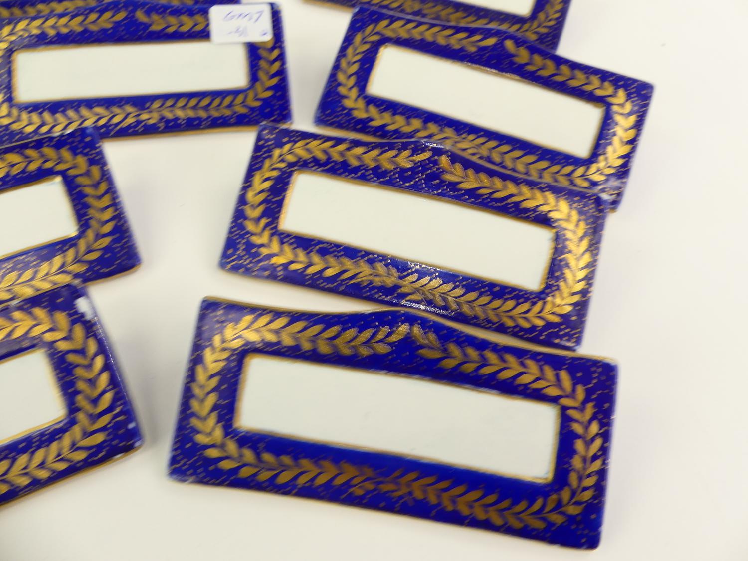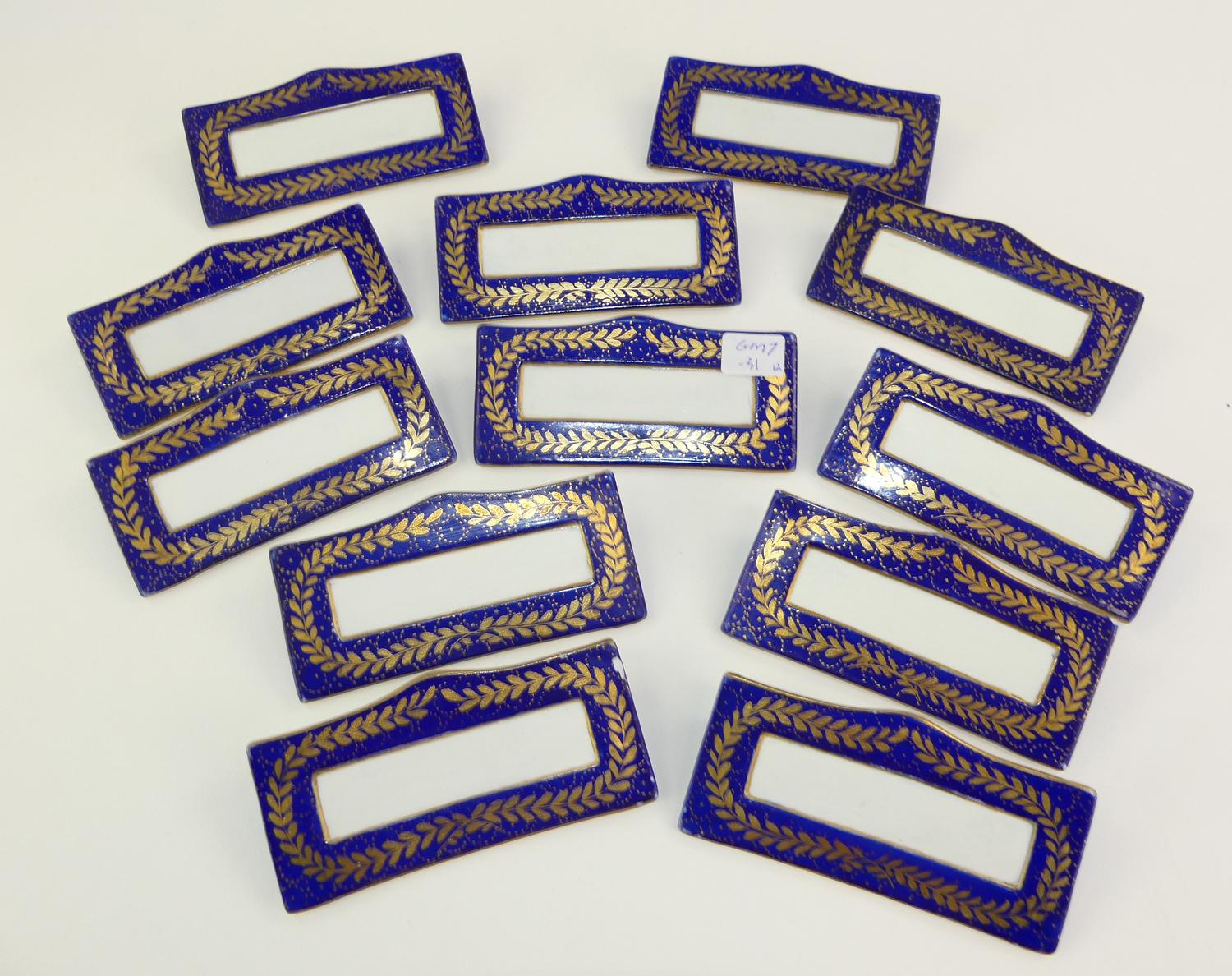 12 dresden cobalt and gilt porcelain place cards, length 3 1/2"
