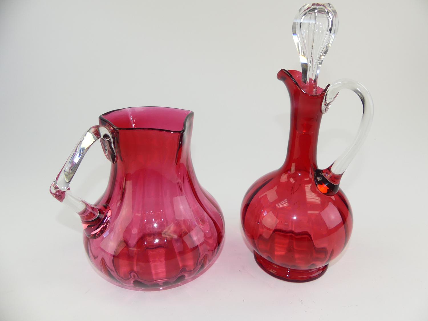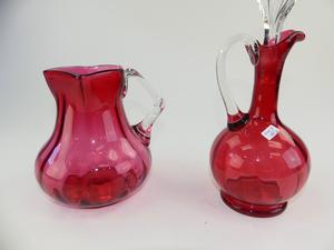 cranberry glass decanter and pitcher, ht 11 1/4"