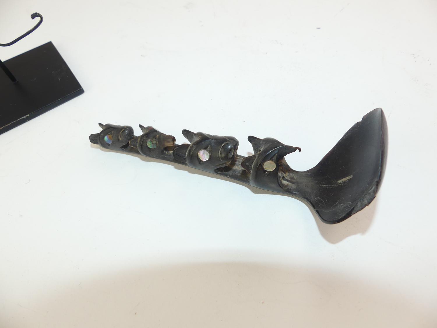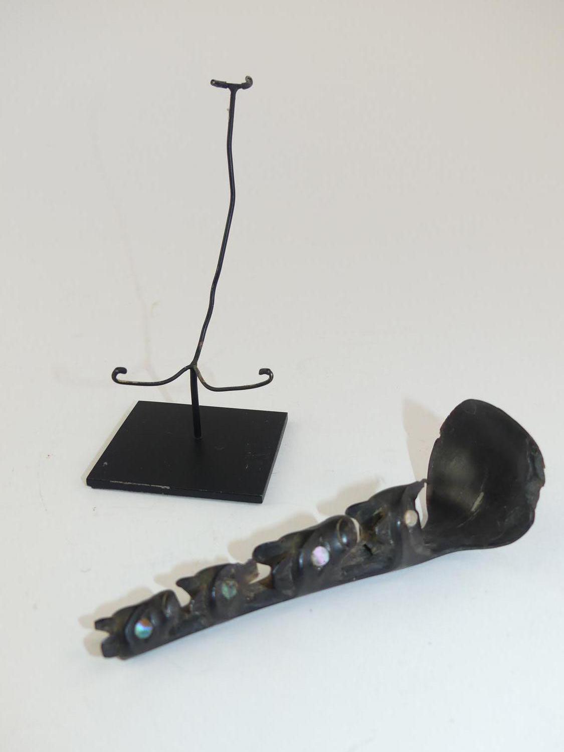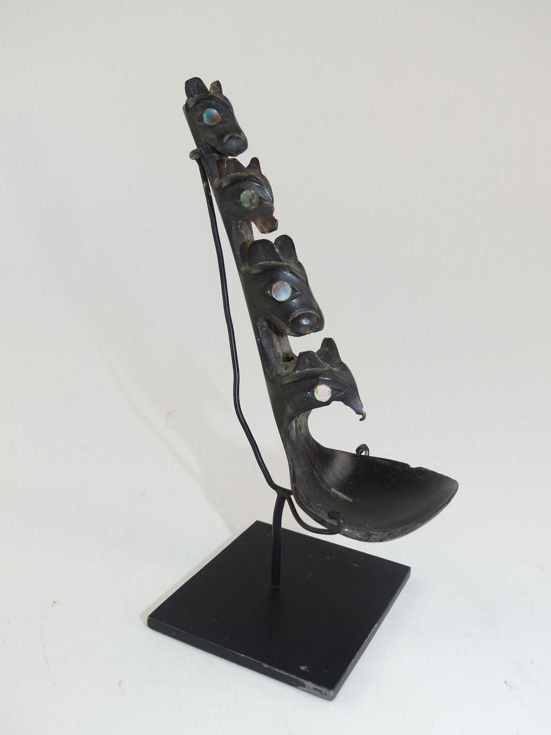 north west coast carved and inlaid spoon on stand, length 4 3/4"