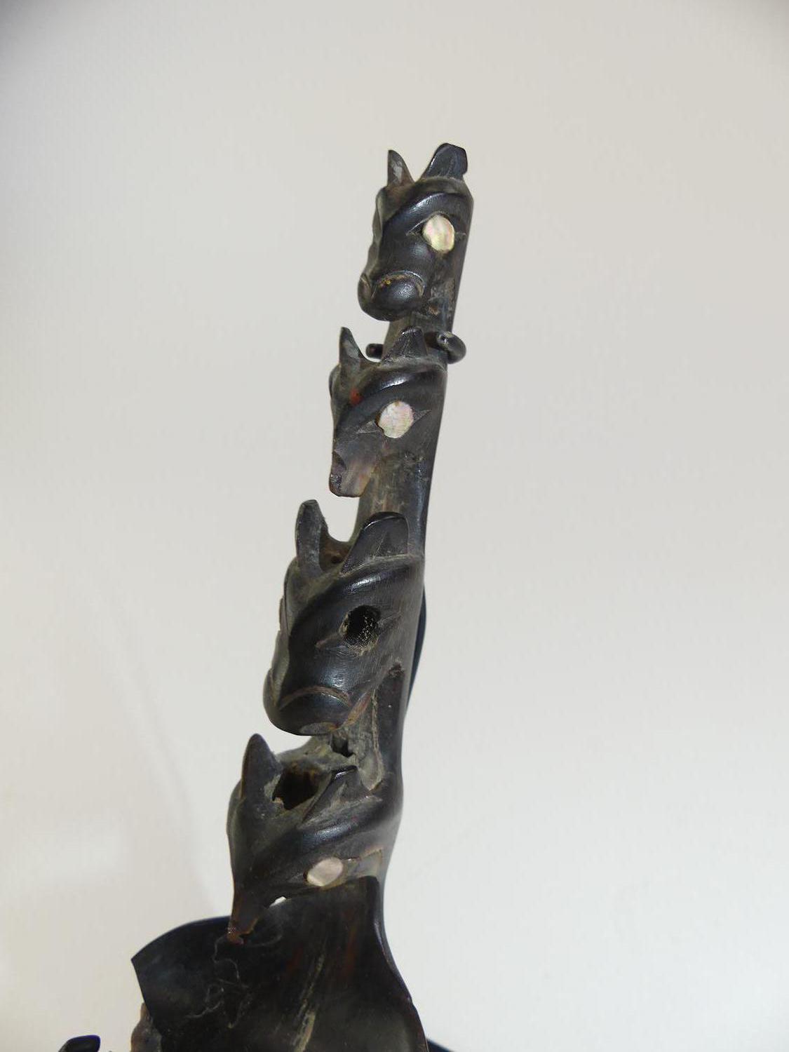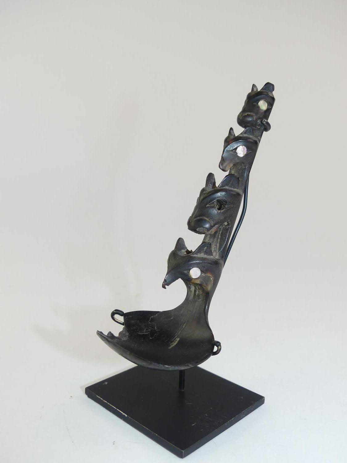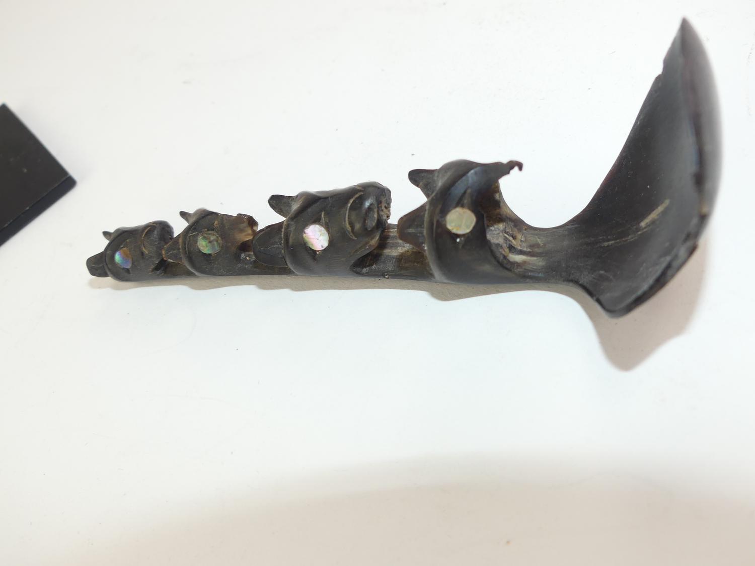 north west coast carved and inlaid spoon on stand, length 4 3/4"