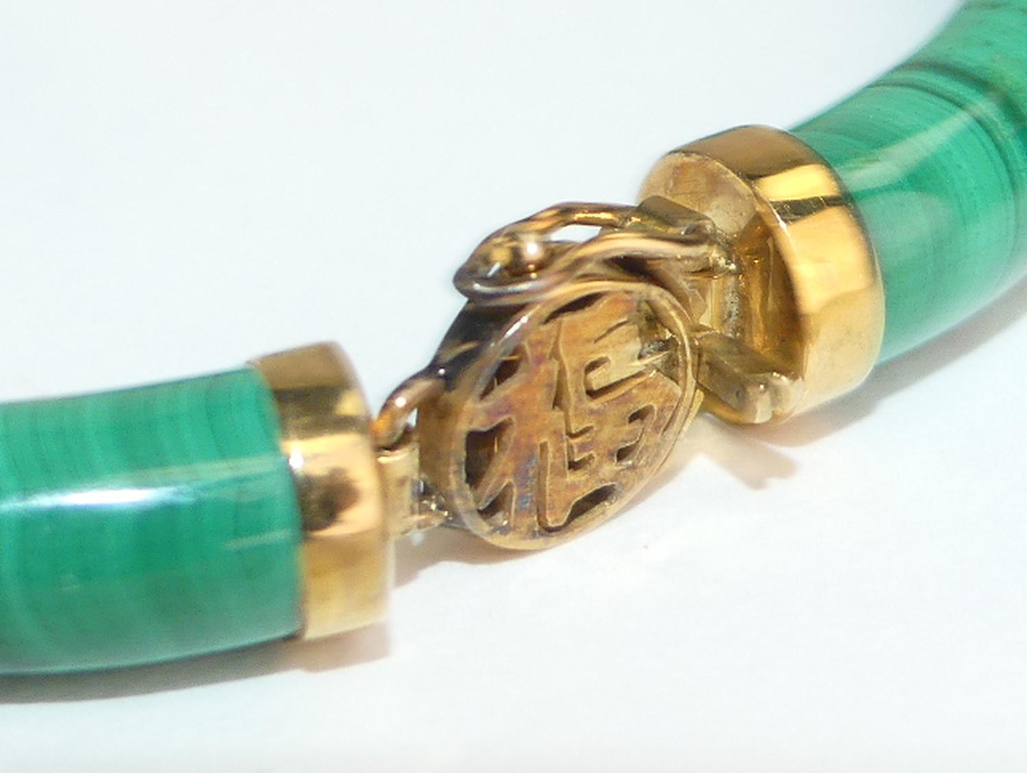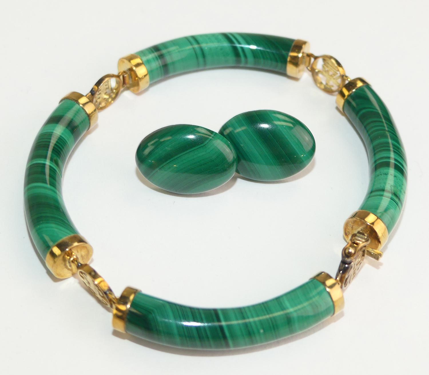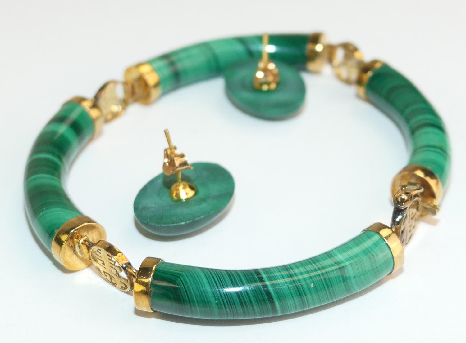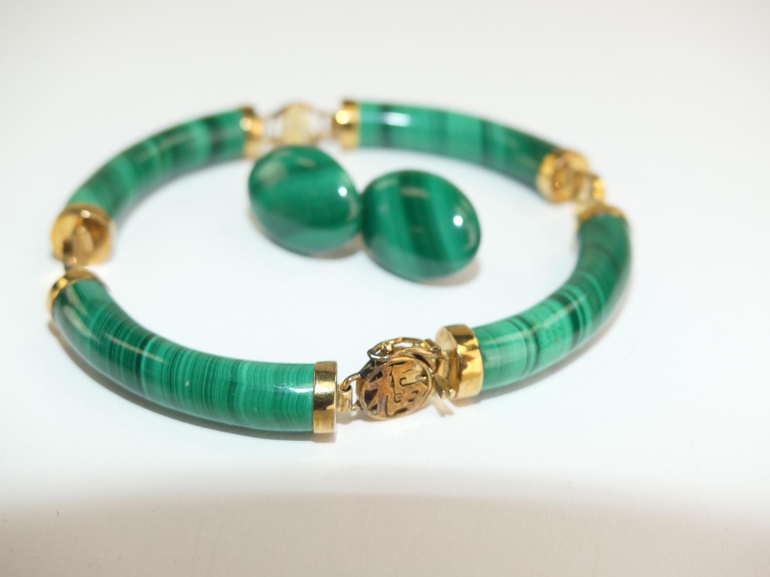 14k yellow gold malachite bracelet and earring suite, length 7"