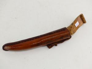 cree maple handled mocotaugan (woodworking crooked knife), late 19th/early 20th century with leather scabbard, length 8 1/2"