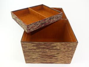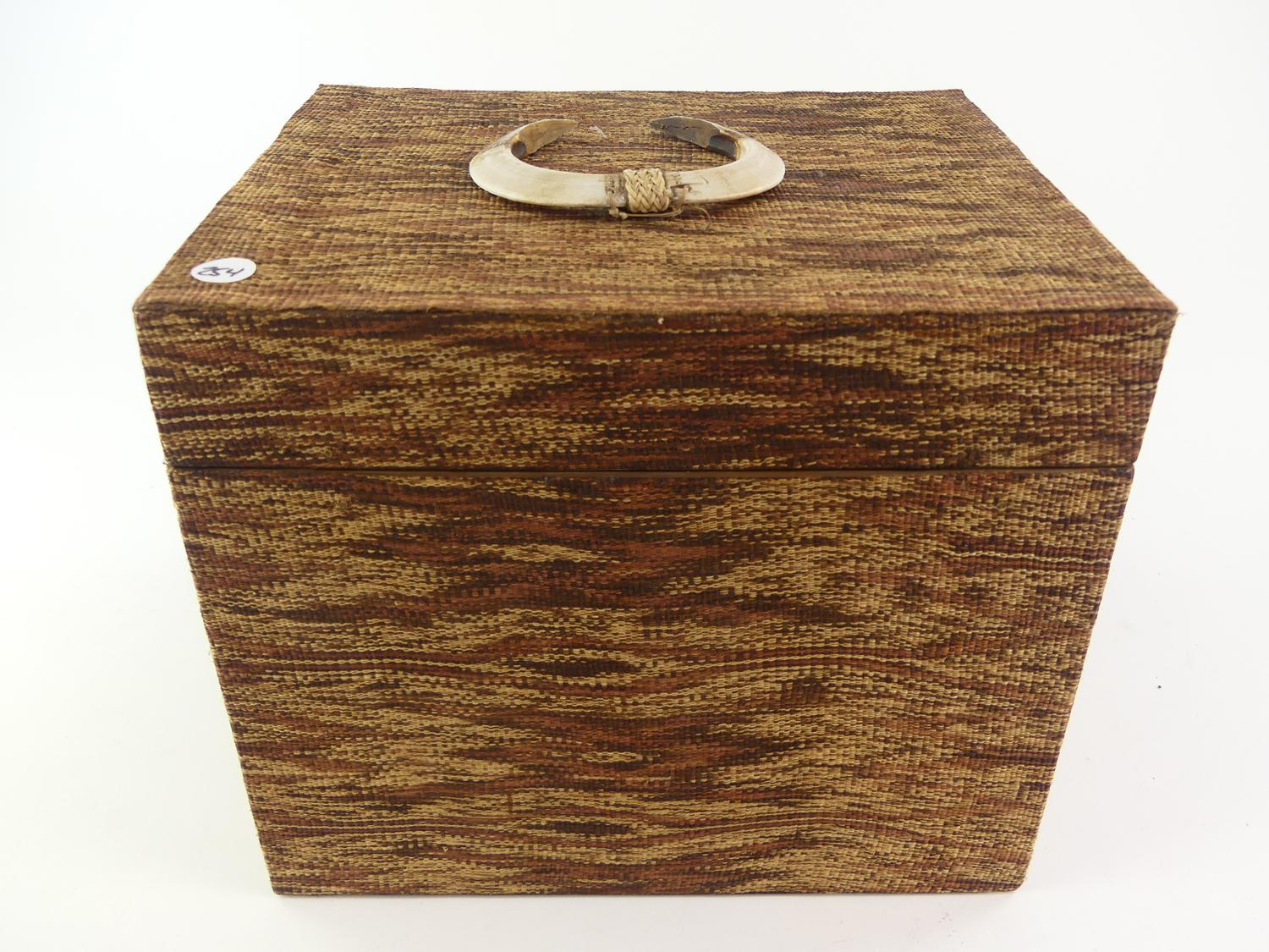 tapestry covered box mounted with boar tusks