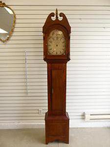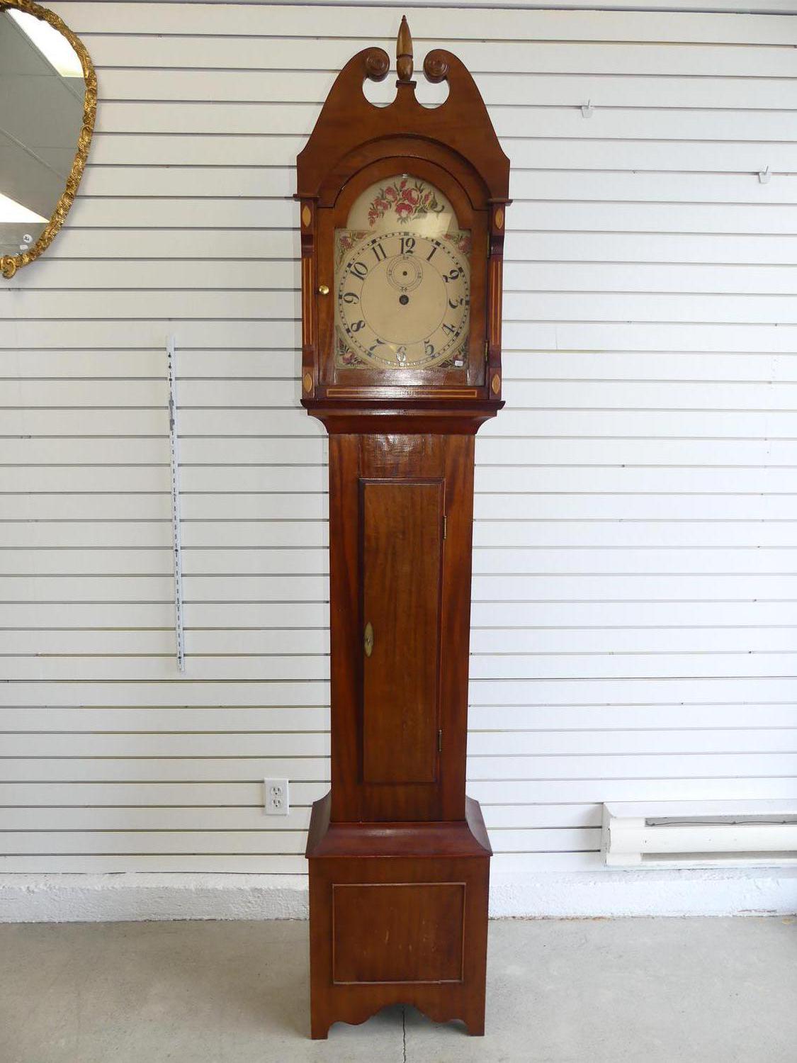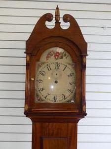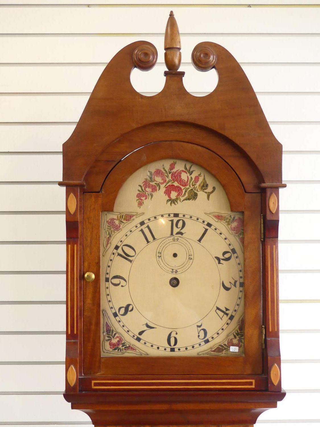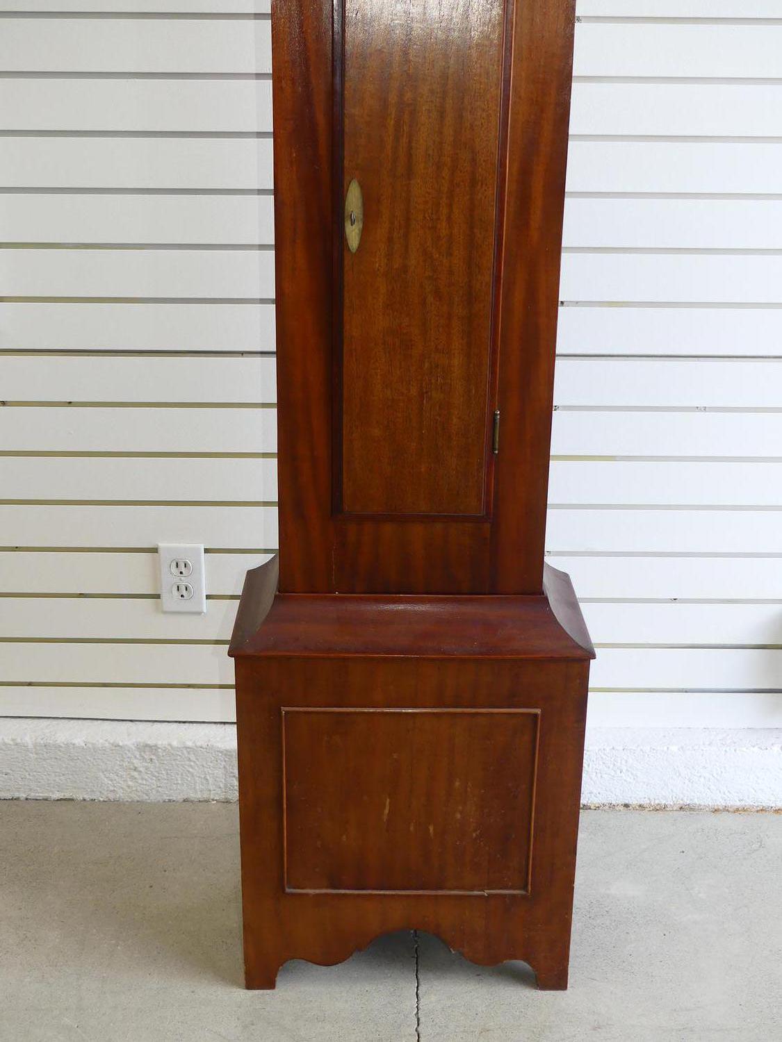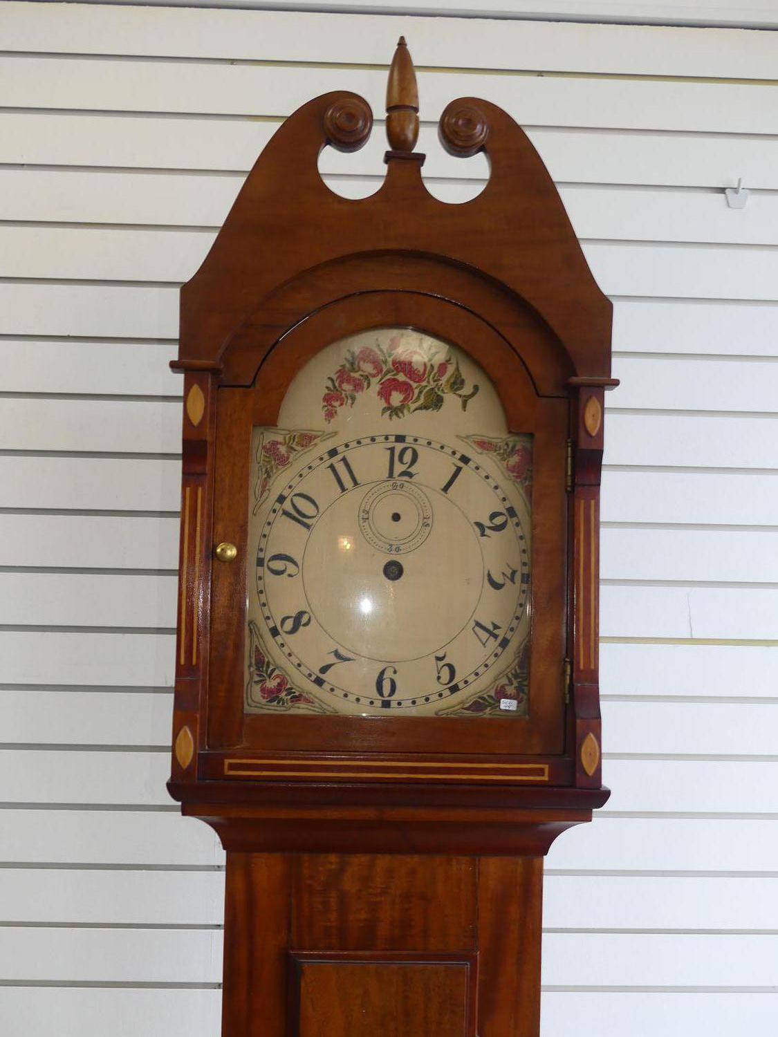 inlaid mahogany longcase clock, in the 18th century manner, mid 20th century, 87" x 17" x 10"