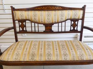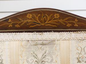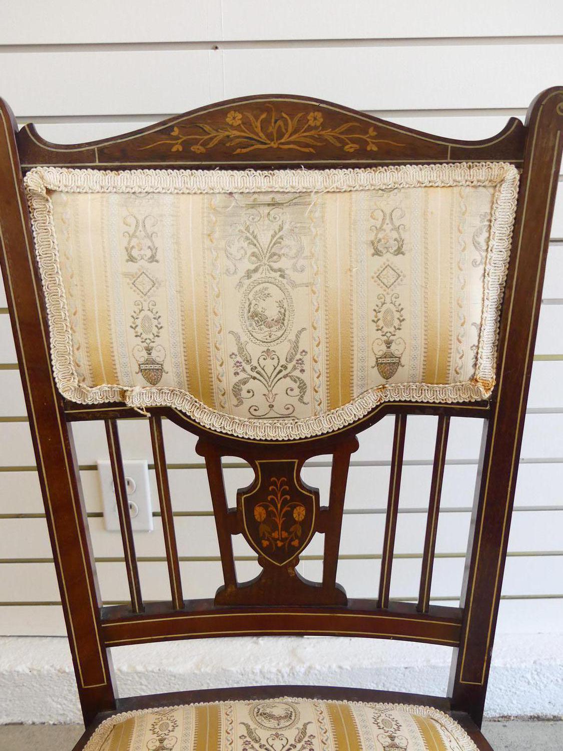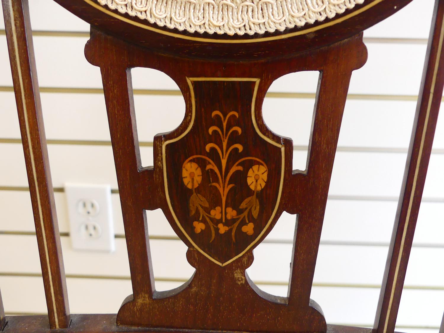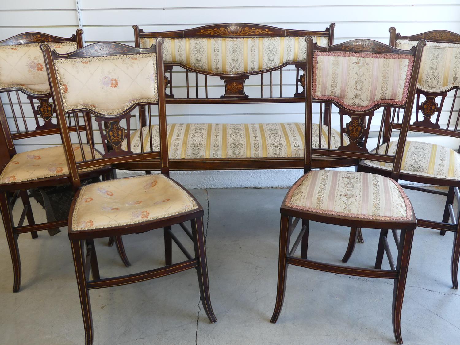 edwardian inlaid mahogany parlor suite, including setee and four side chairs, circa 1900s