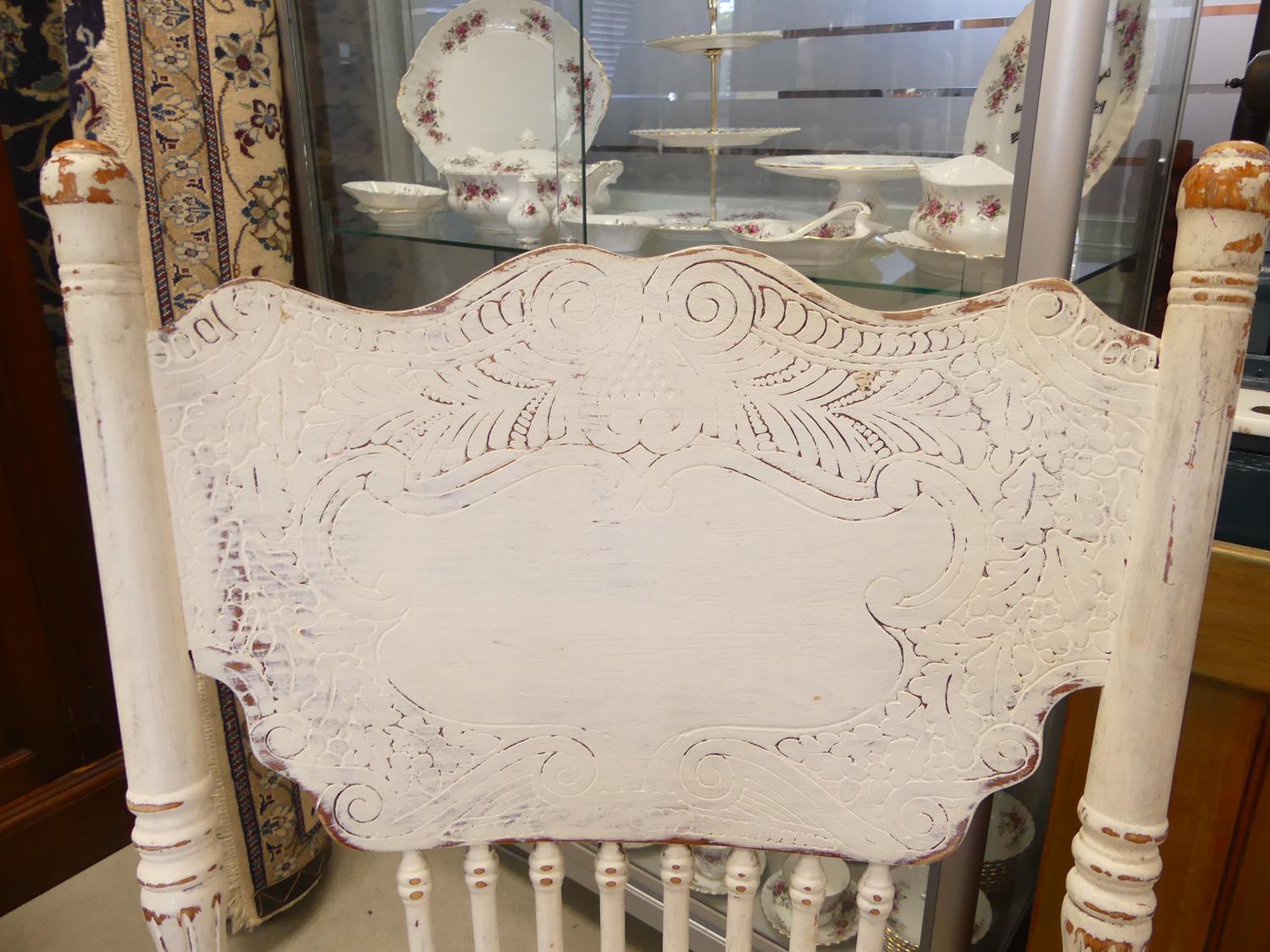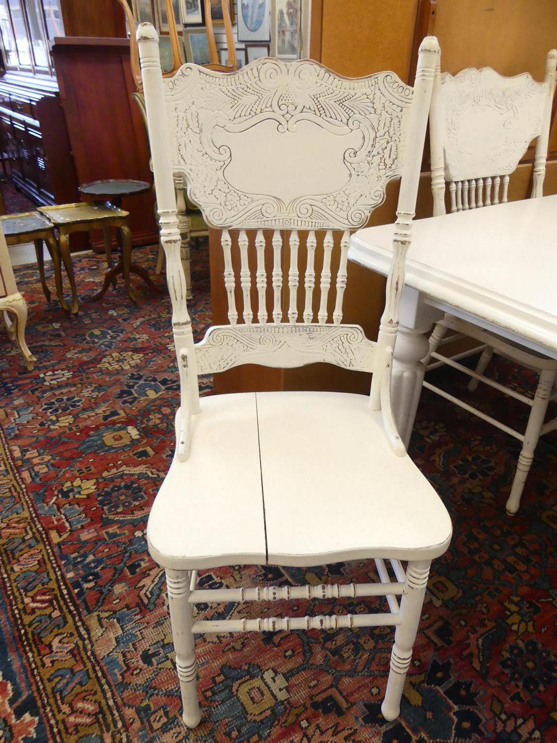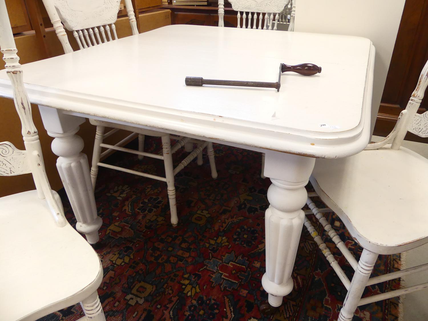 painted victorian mahogany key wind dining table with extension leaf and four painted pressback kitchen chairs