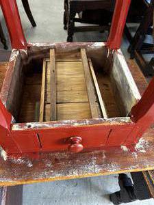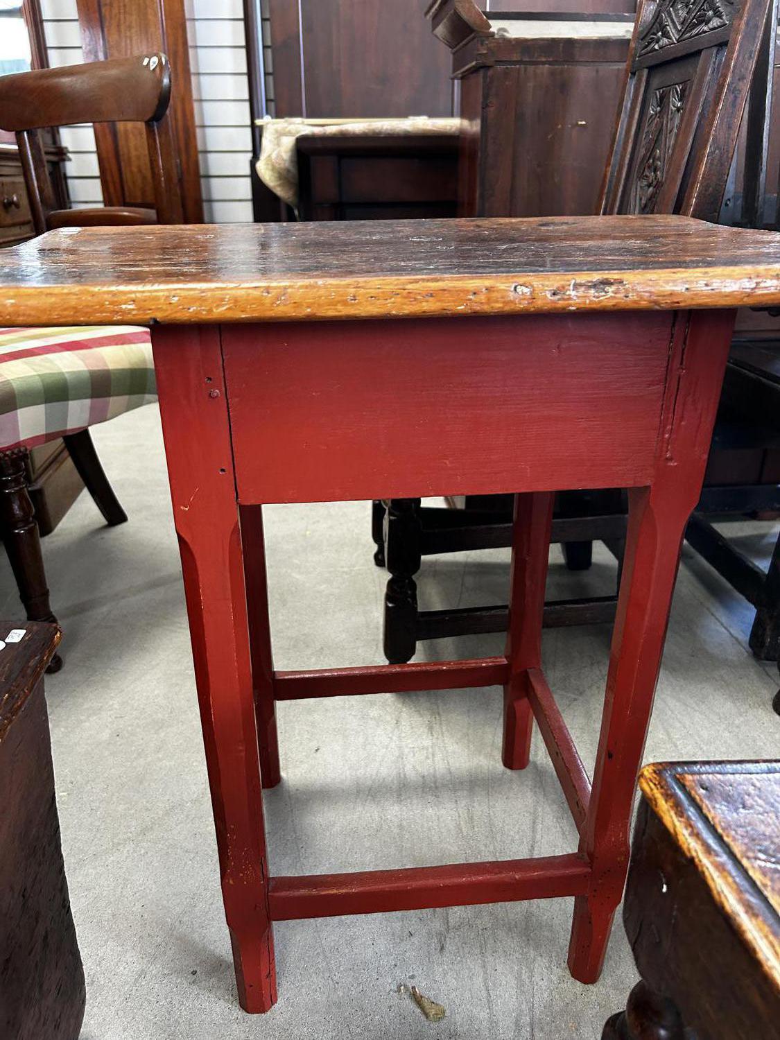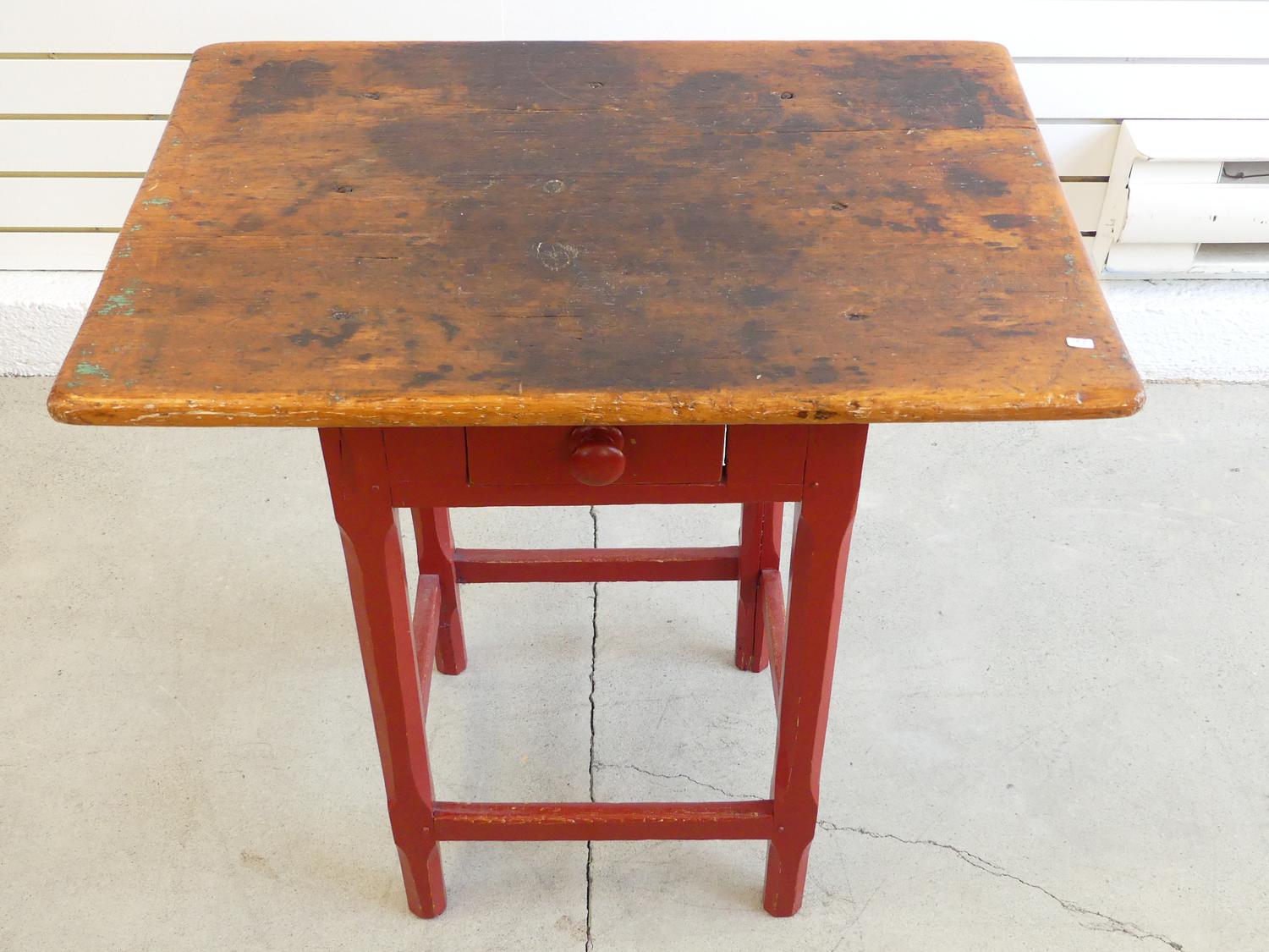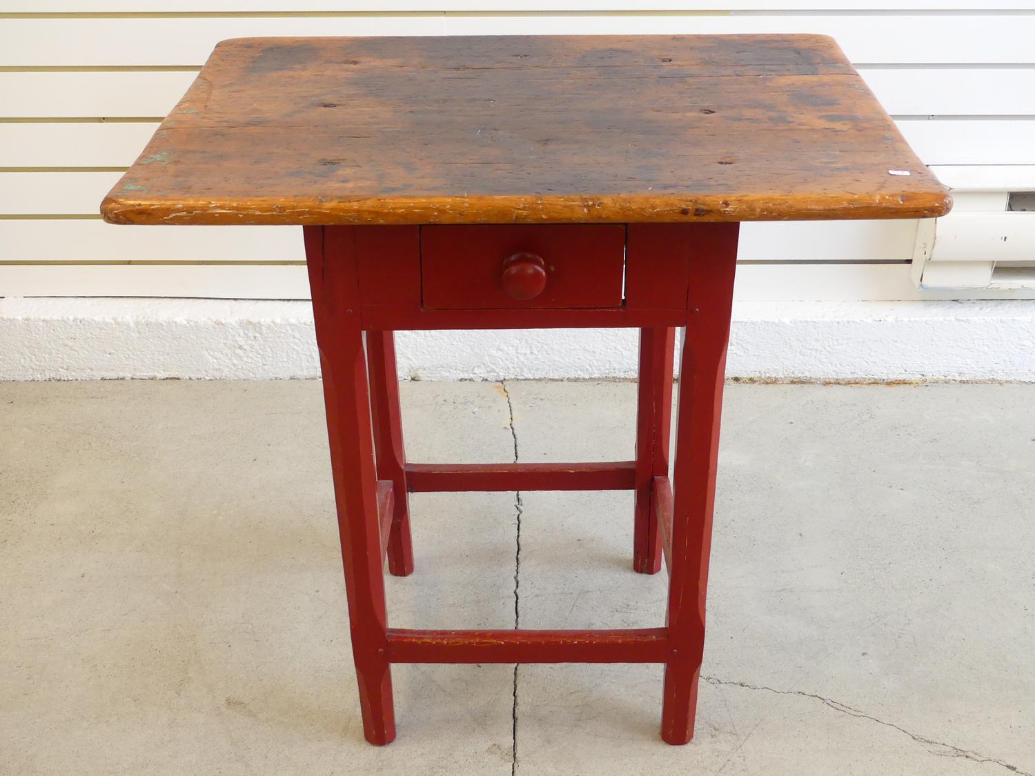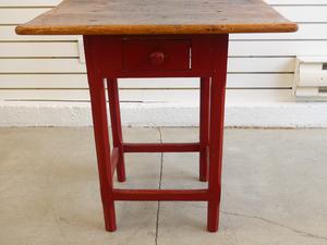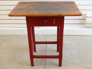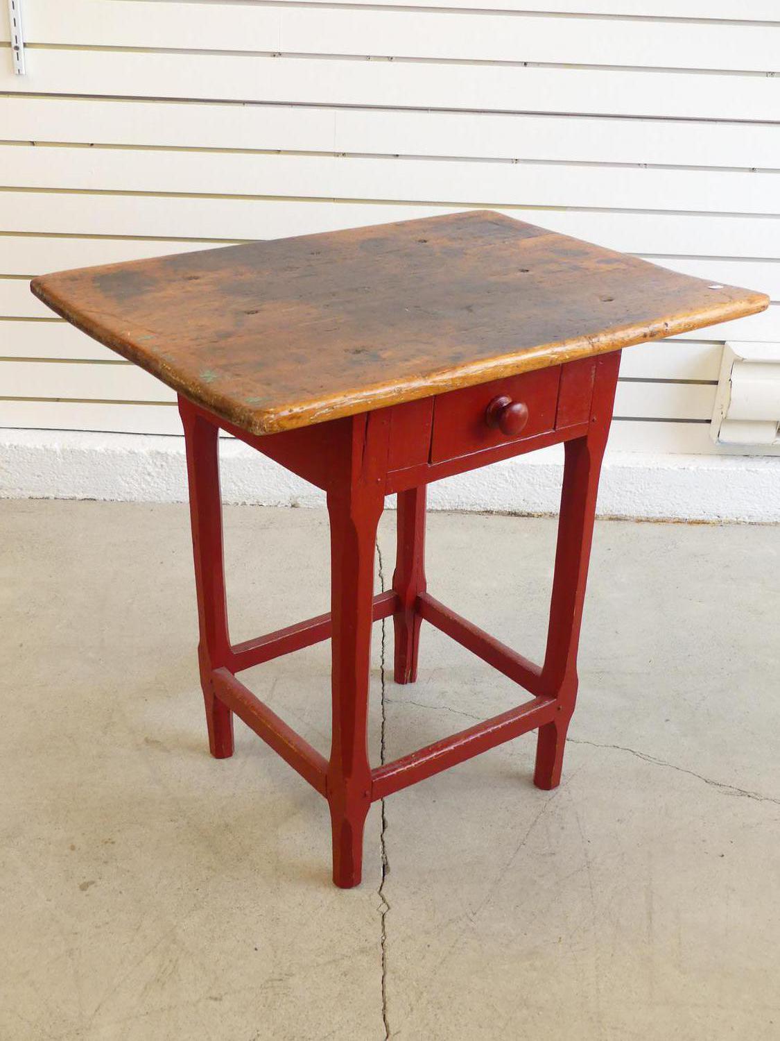 quebec pine tavern table with red painted base, 26" x 26" x 19"