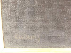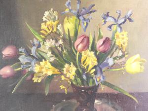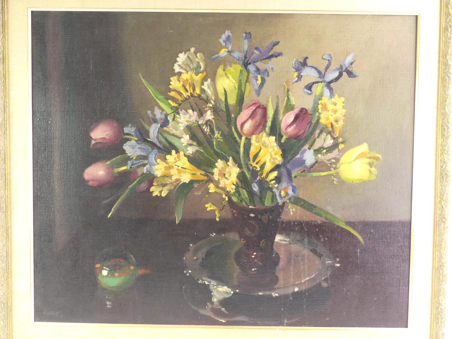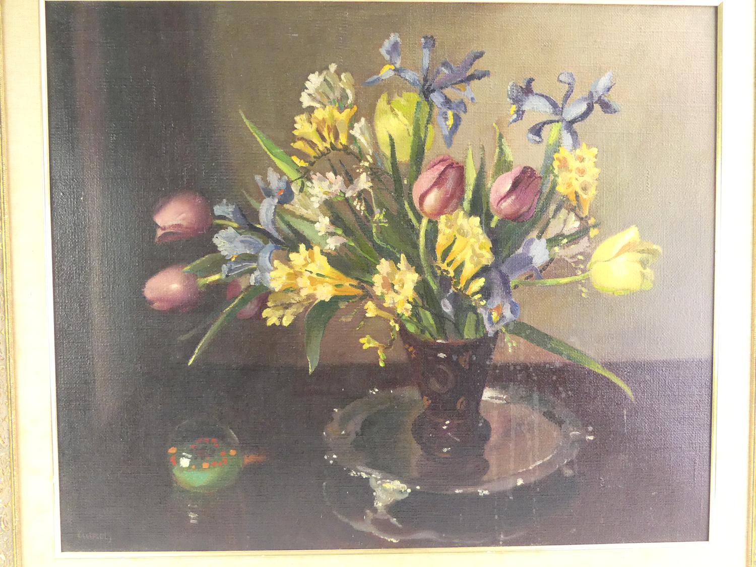 indistinctly signed oil on canvas, 25" x 30", "stillife with art glass paperweight"