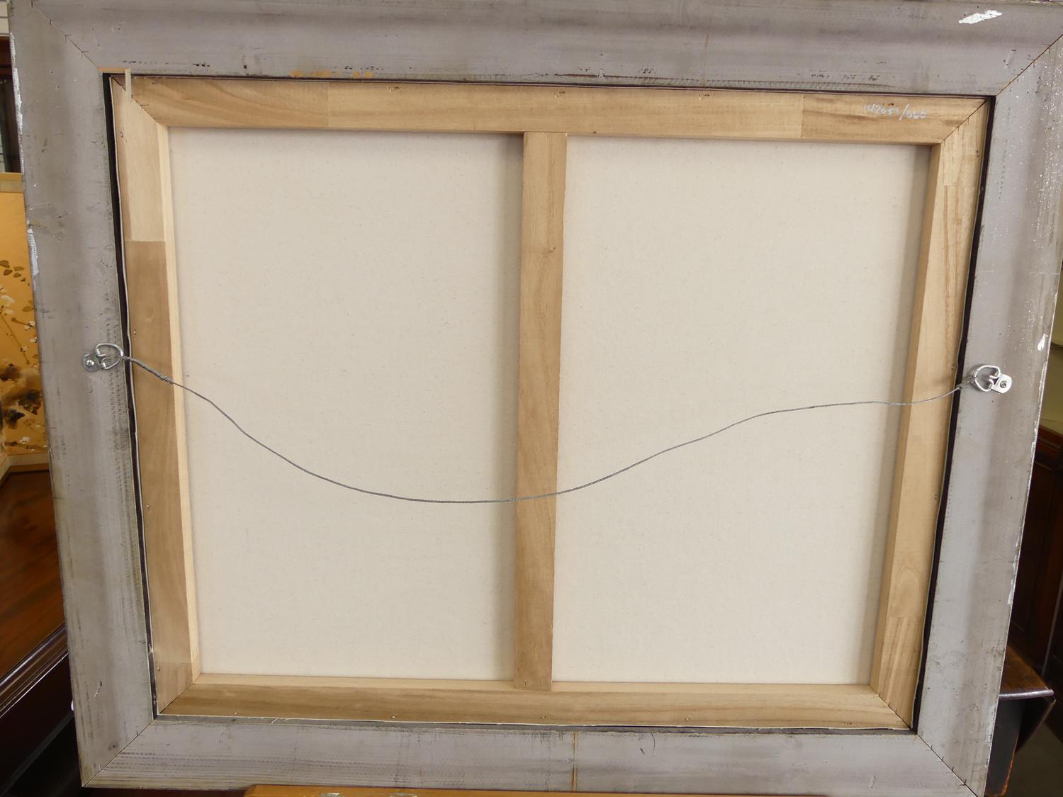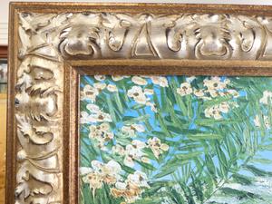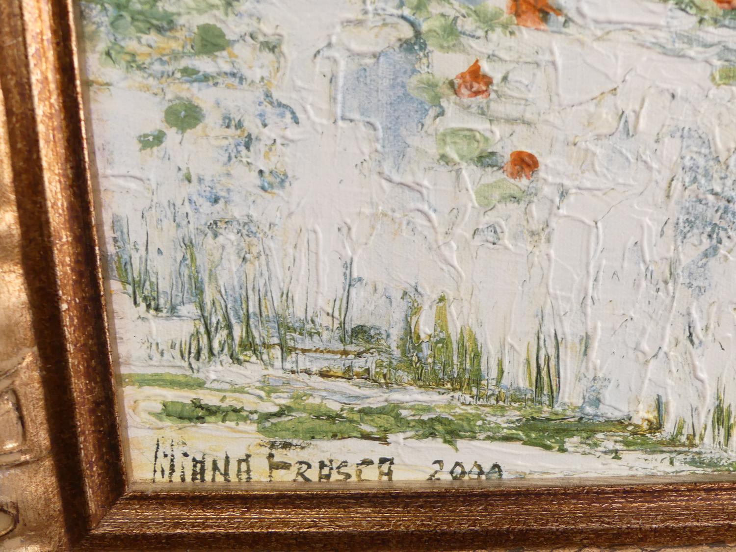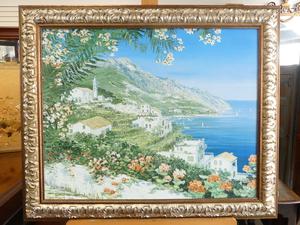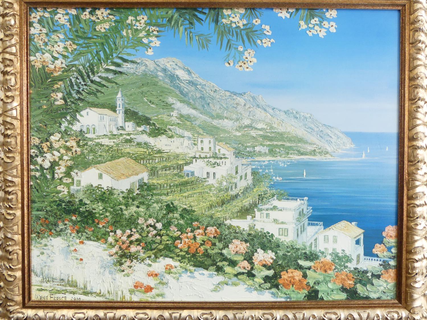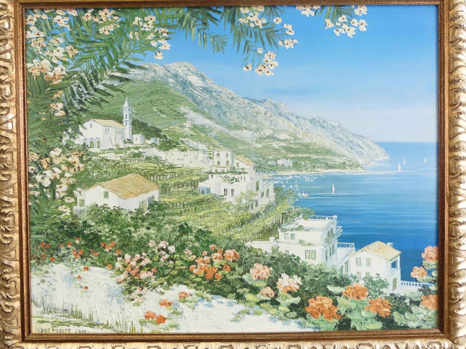 liliana frasca(1932), gilt framed canvas print, overall 30" x 36", "villa at seaside"