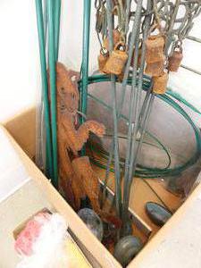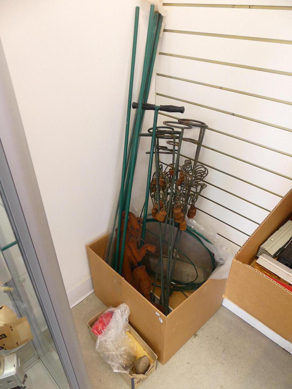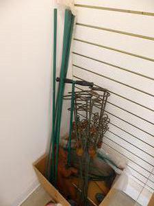 lot of misc. garden decorations and tools including tomatoes plant stands and garden decor
