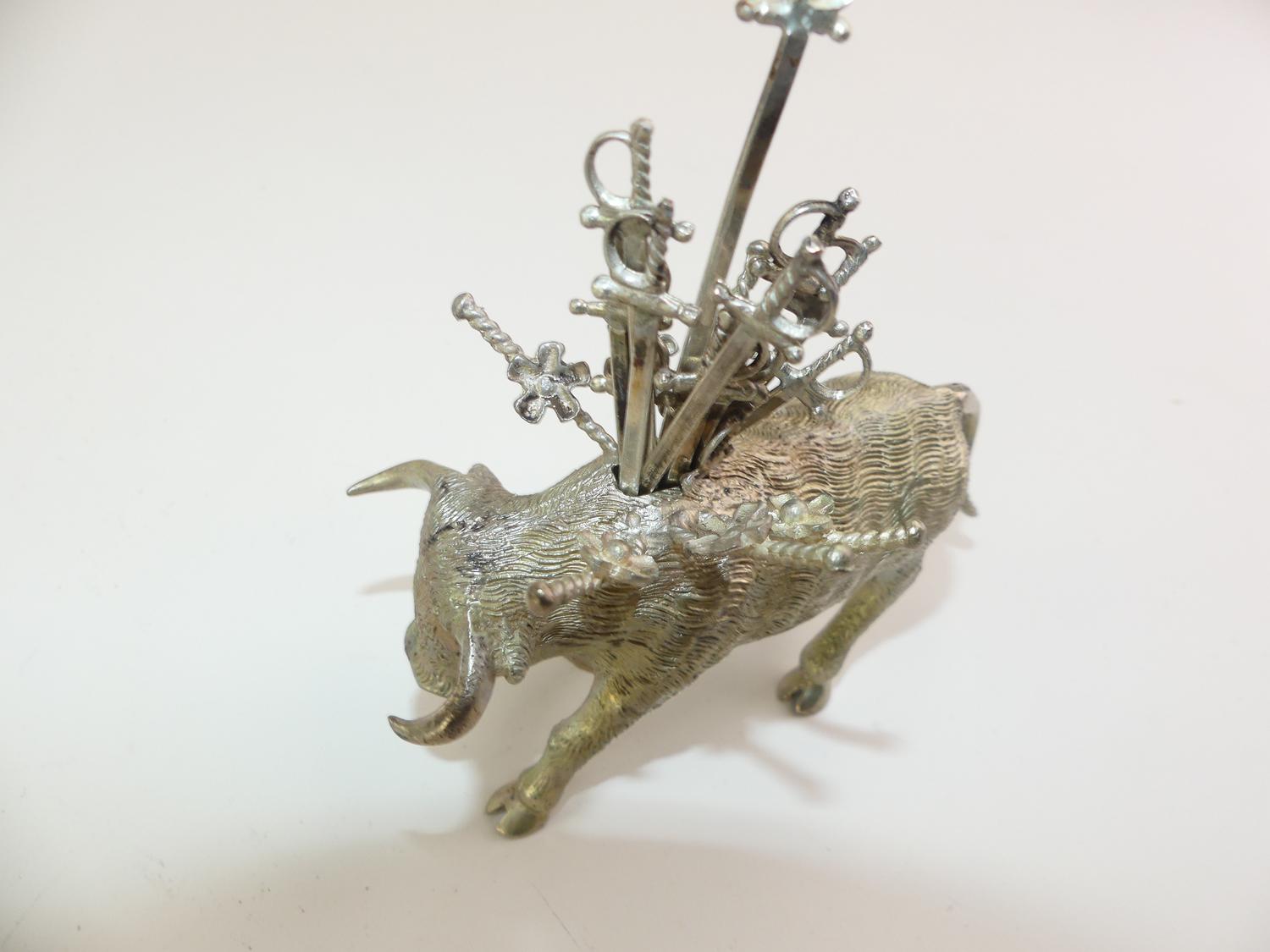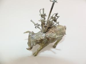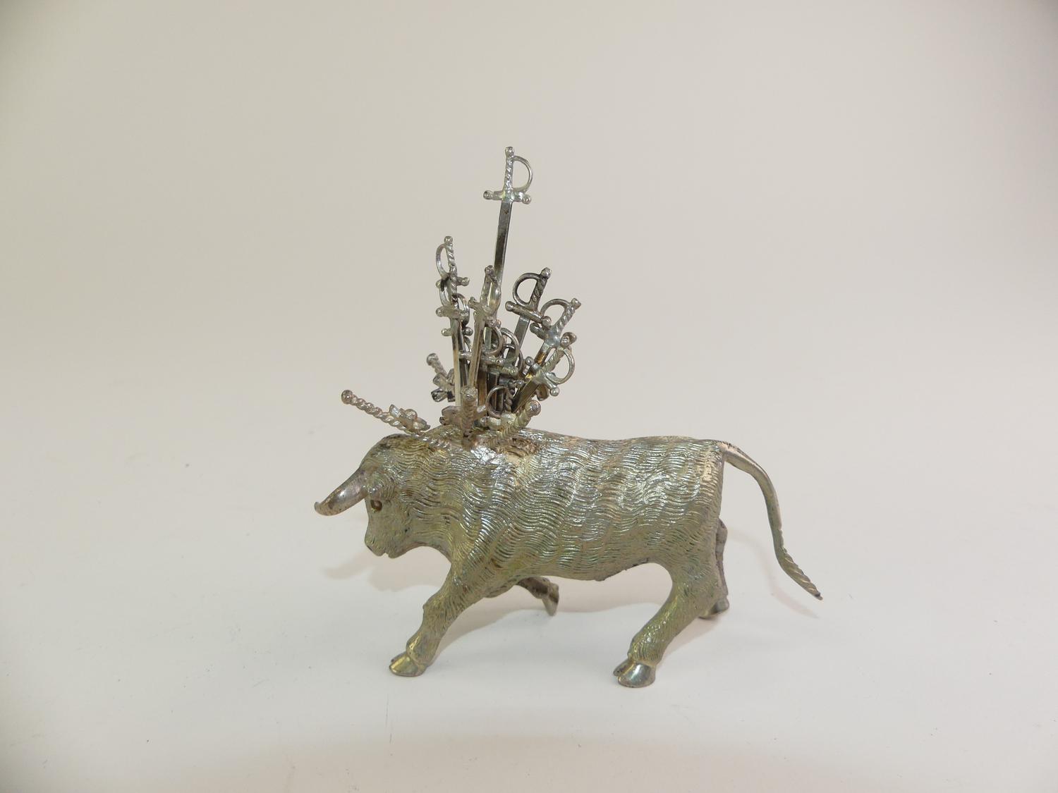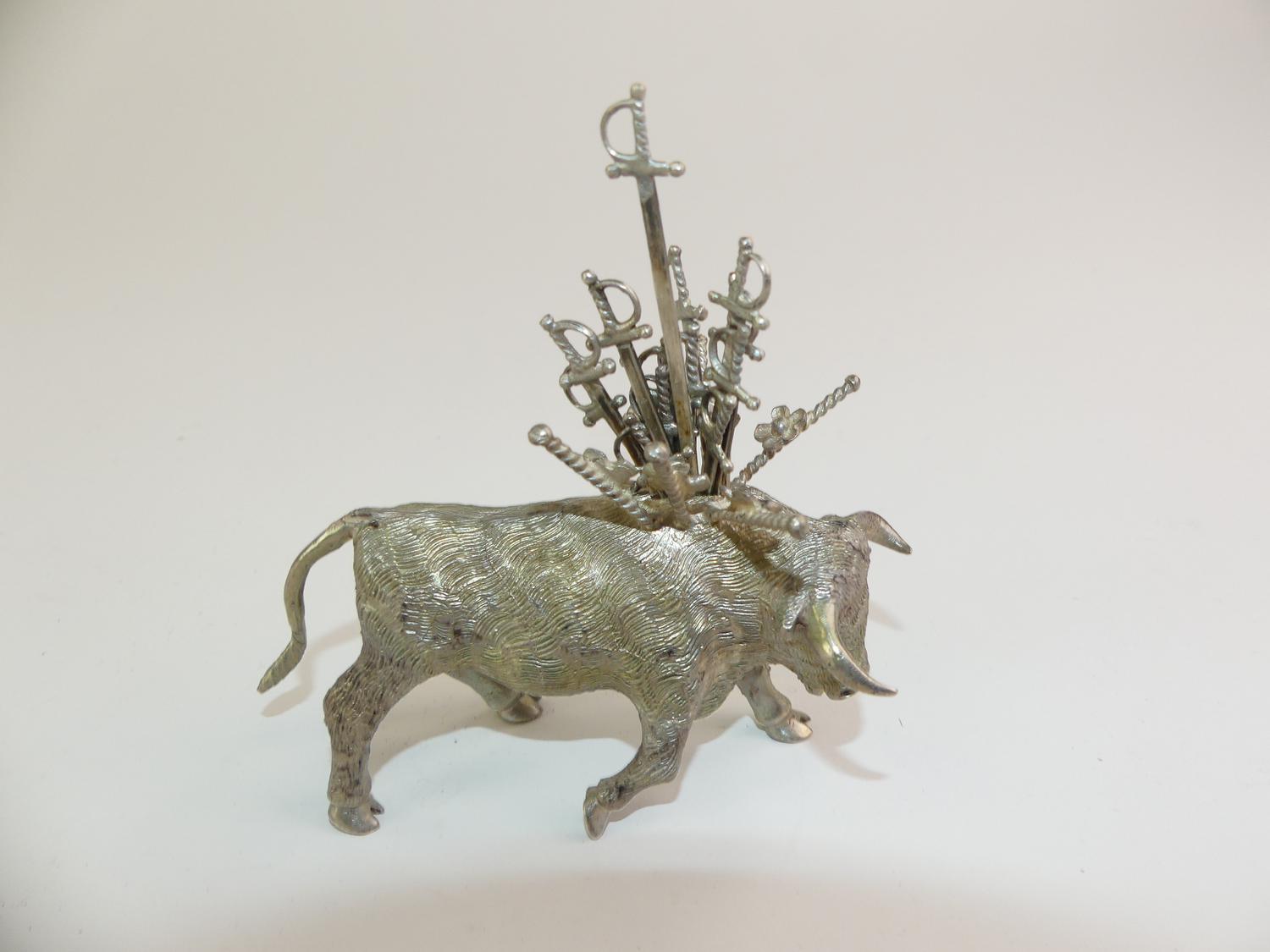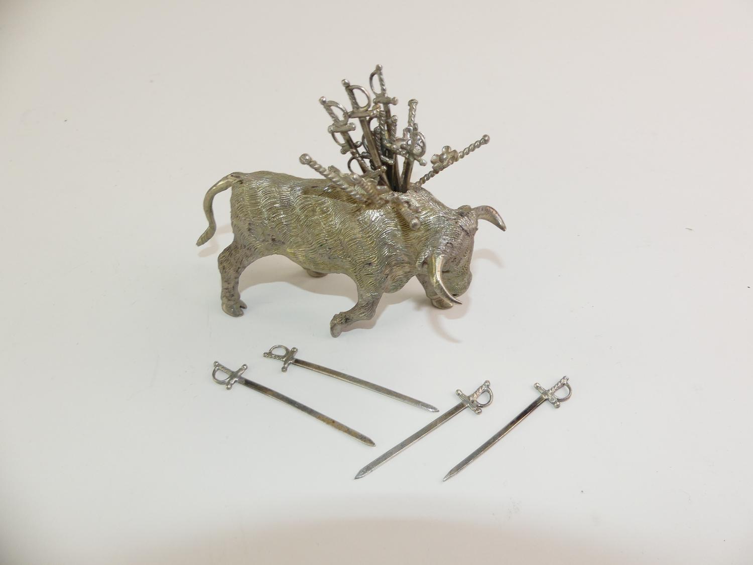 sterling silver bull fitted with 14 sword form coctail picks, length 5", weighing approx 253 grams
