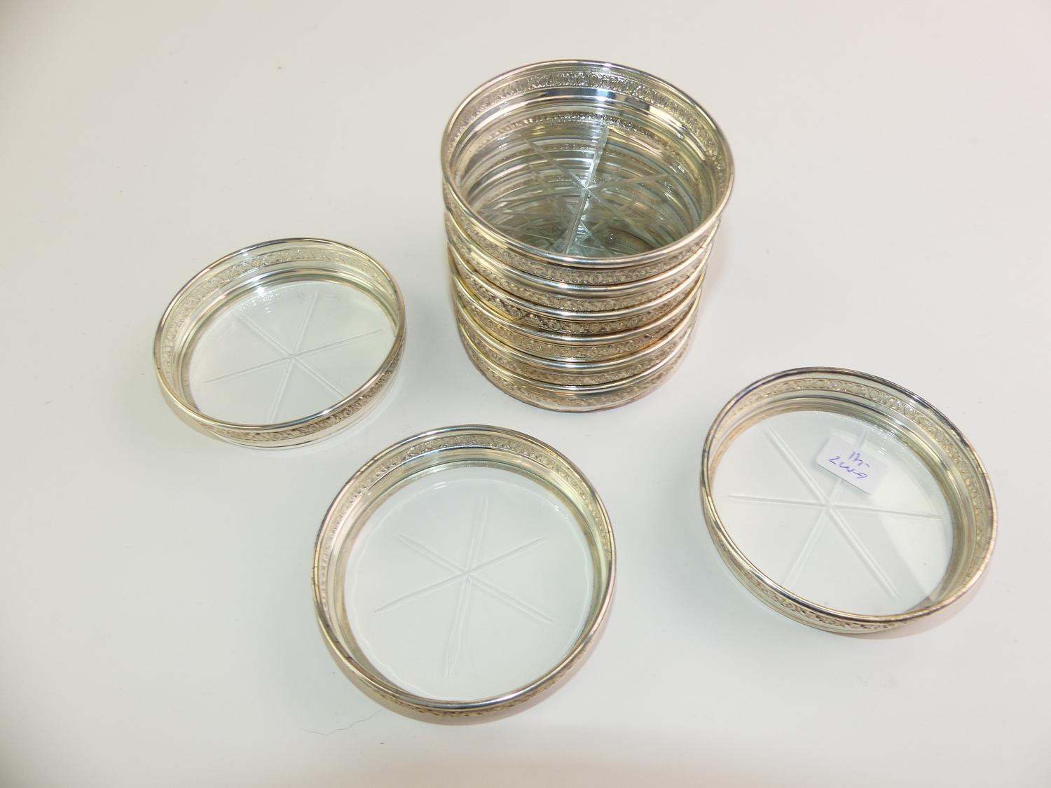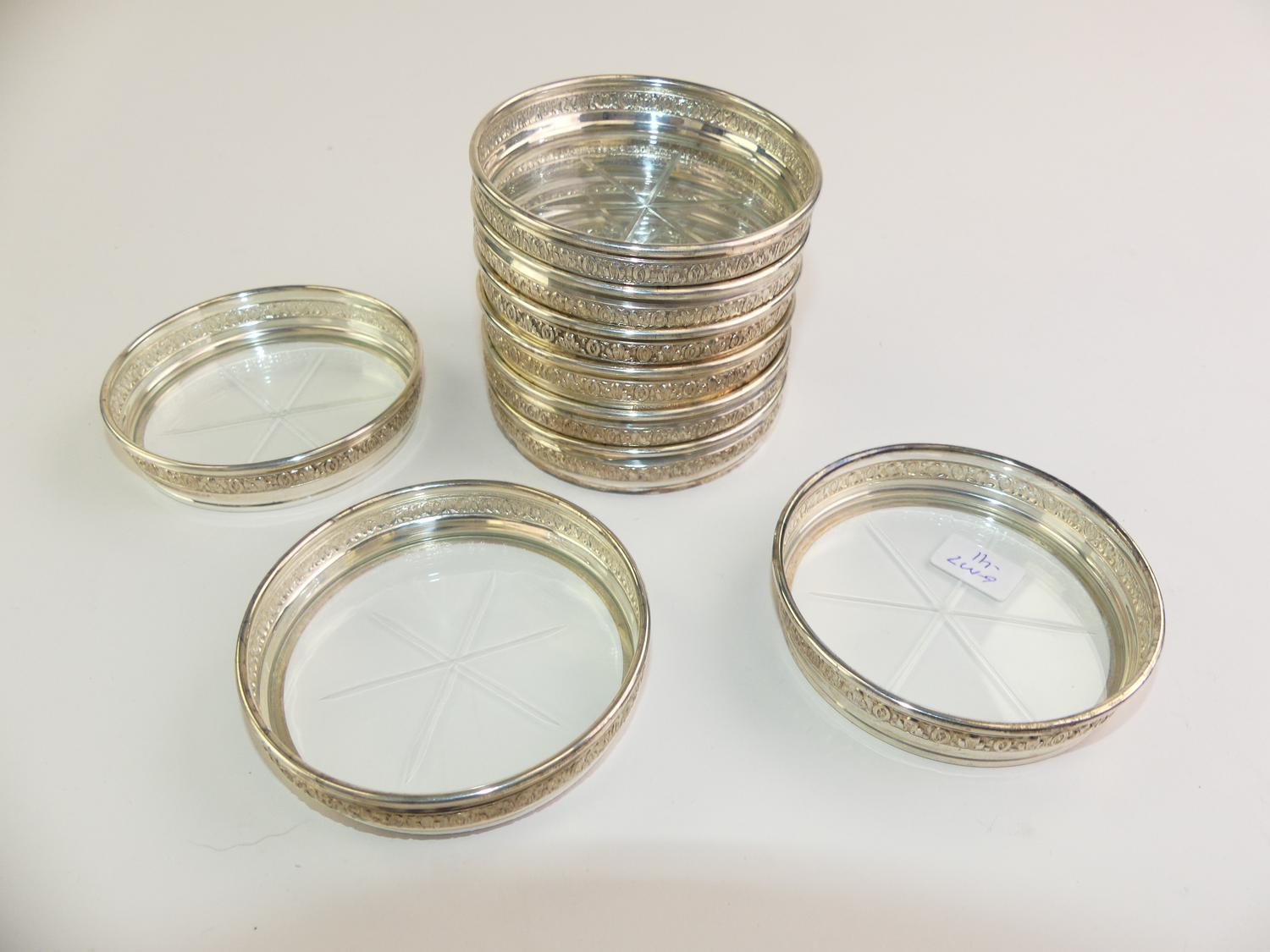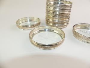 set of nine birks sterling silver and glass coasters
