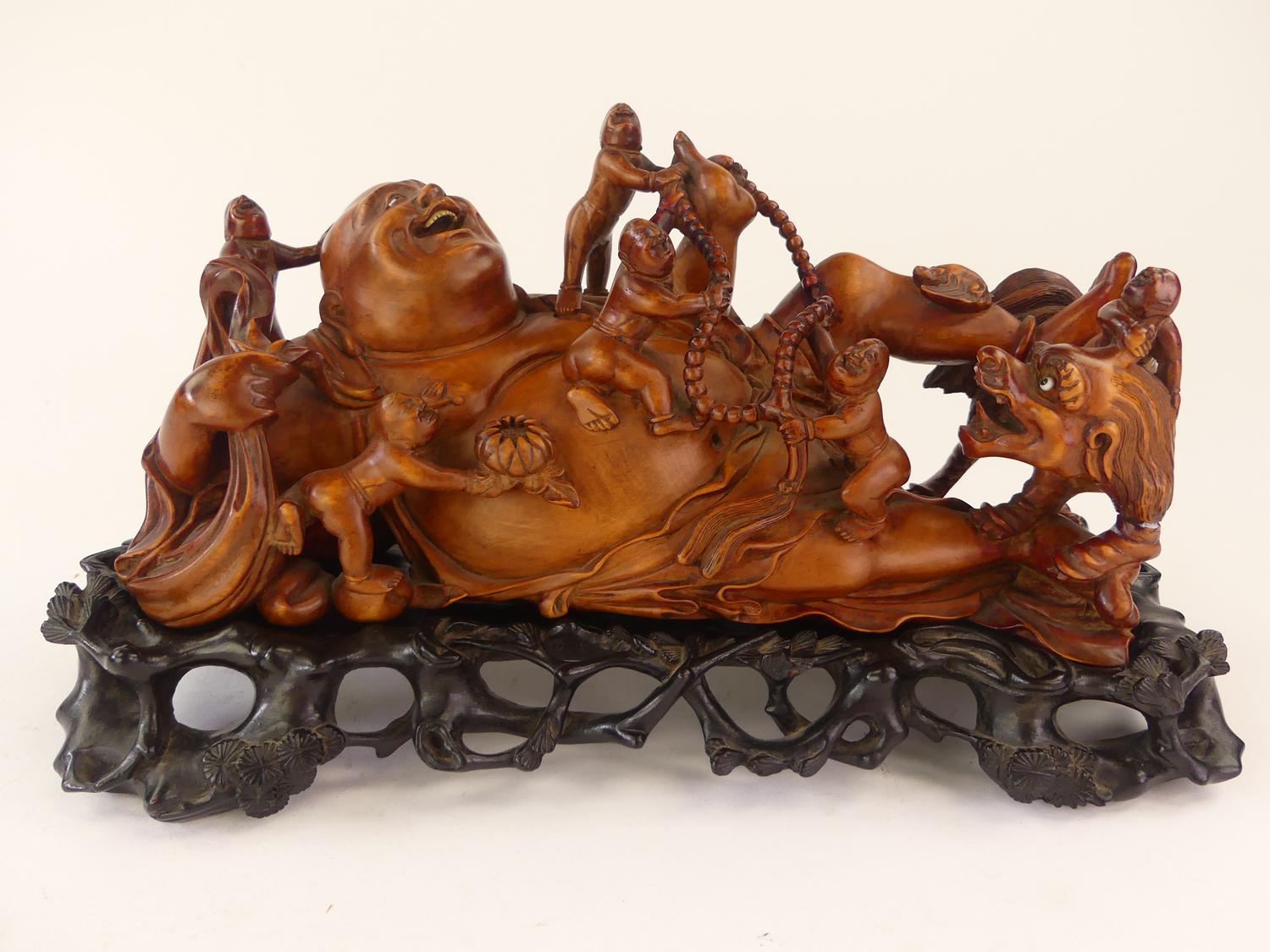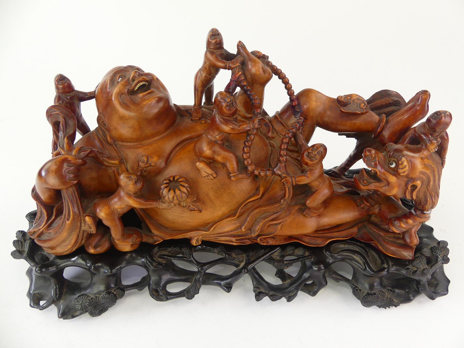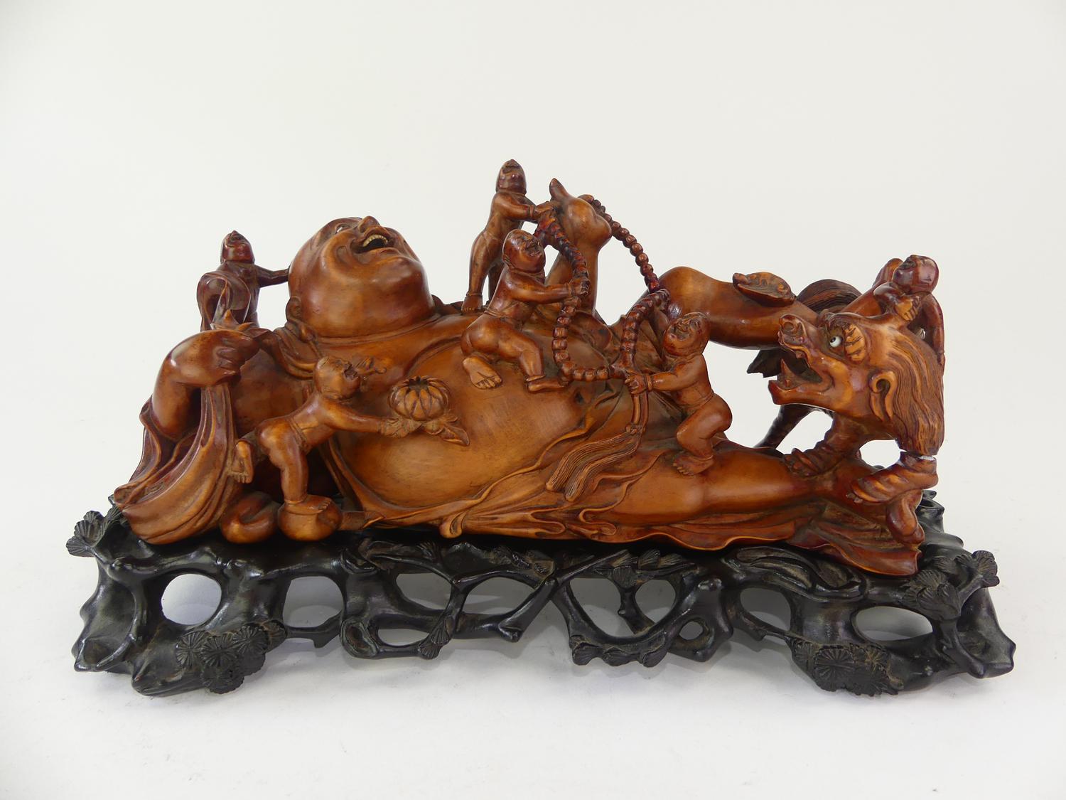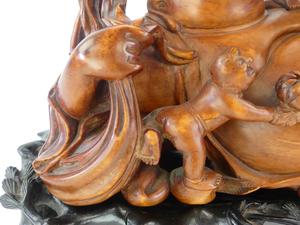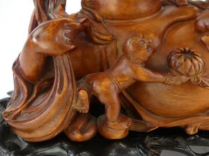 chinese carved buddha on stand, 6" x 11 1/2" x 5"