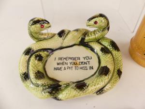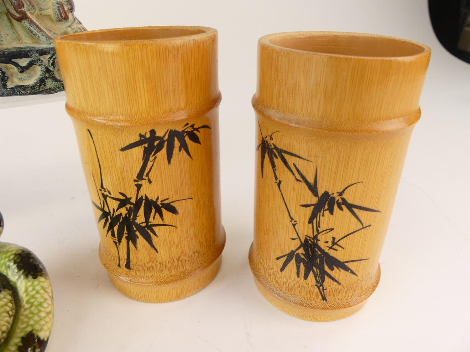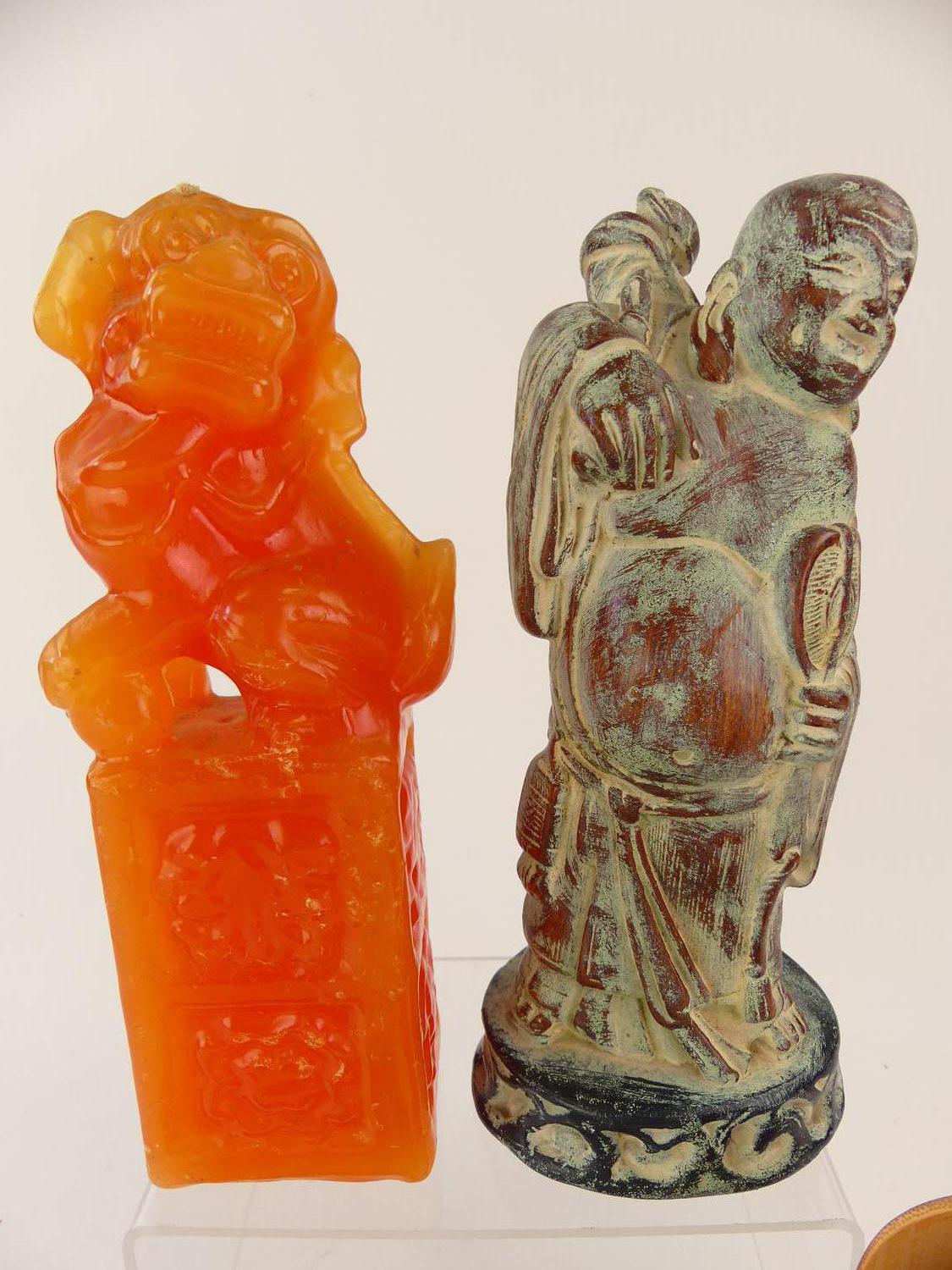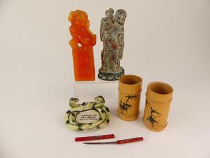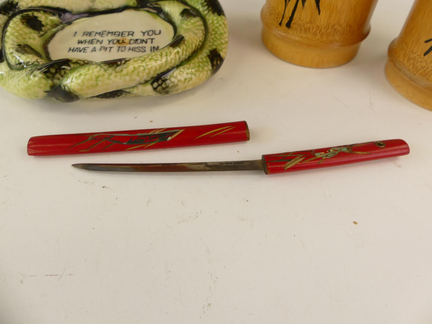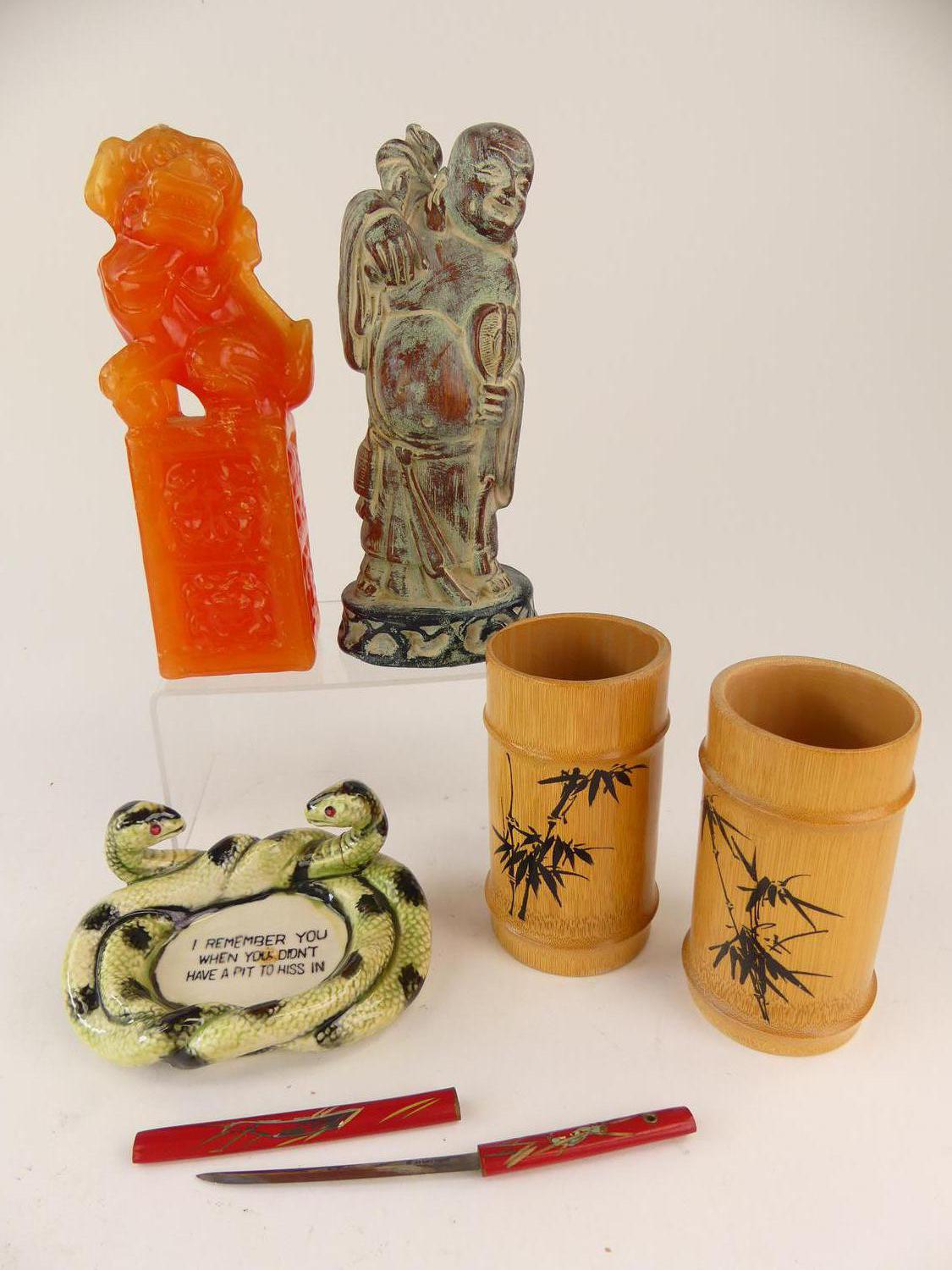 lot including buddha, foo dog candle, 2 bamboo cups, snake ashtray, samurai letter opener