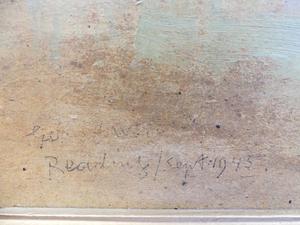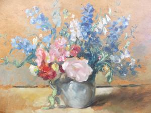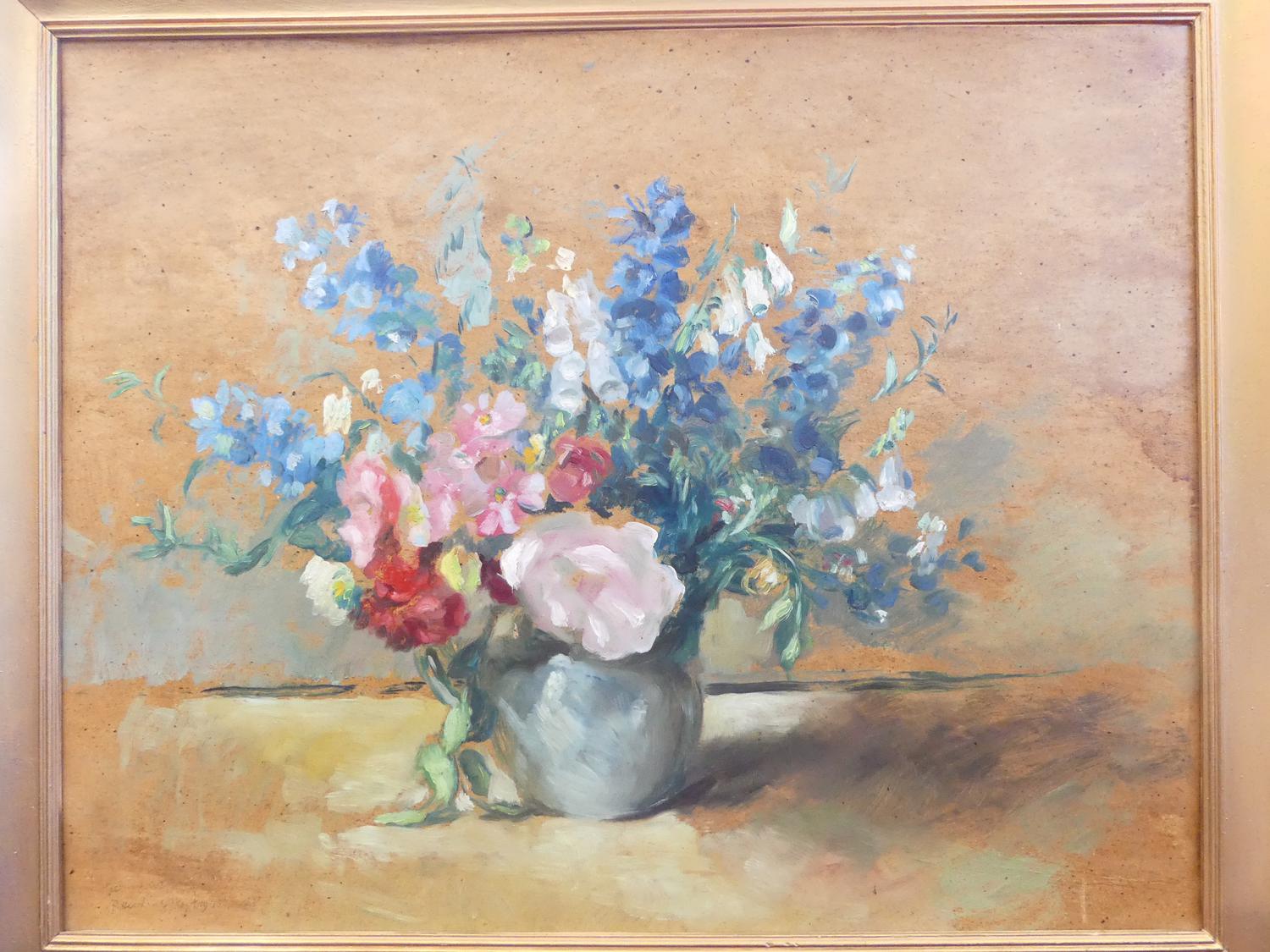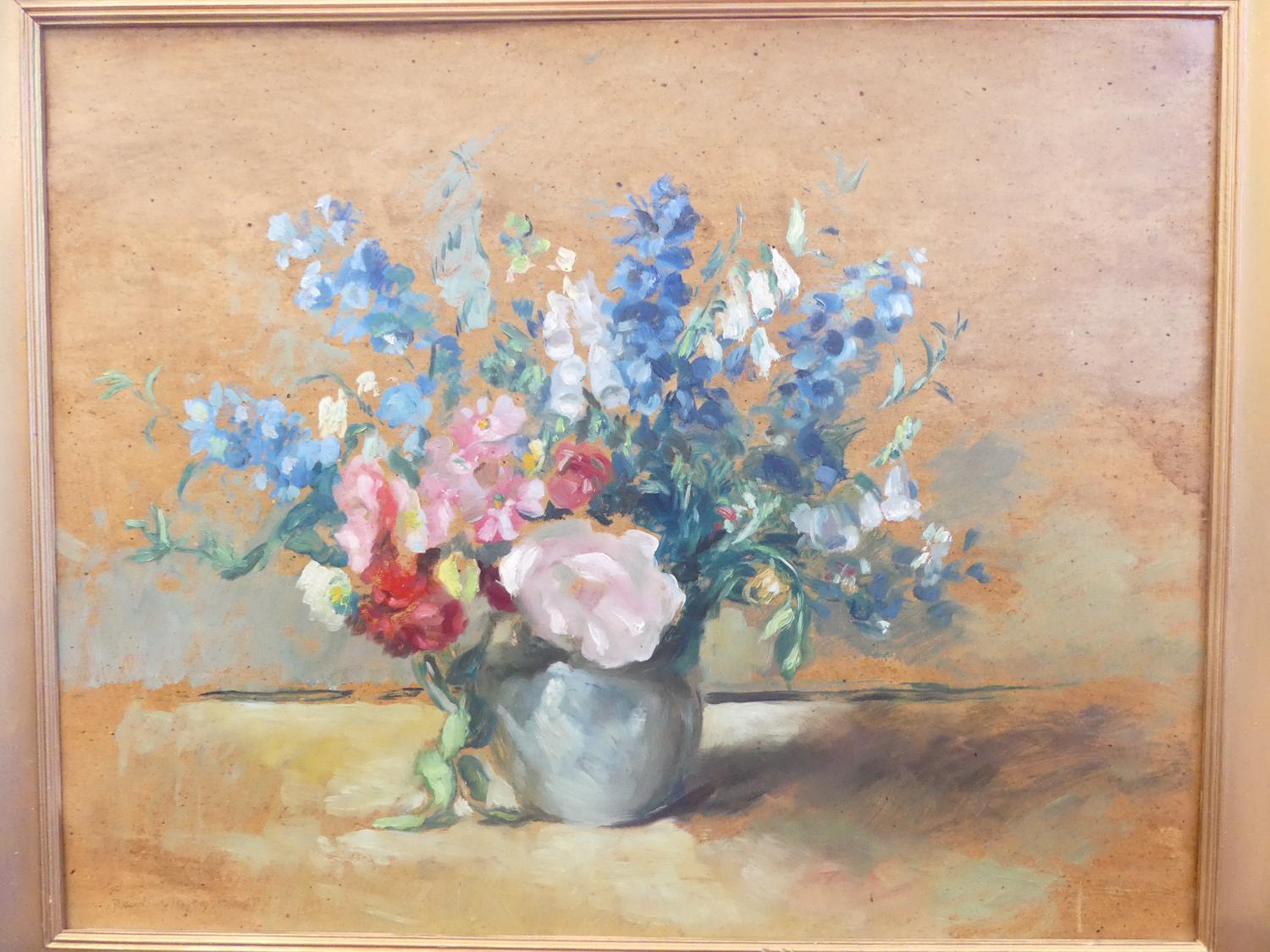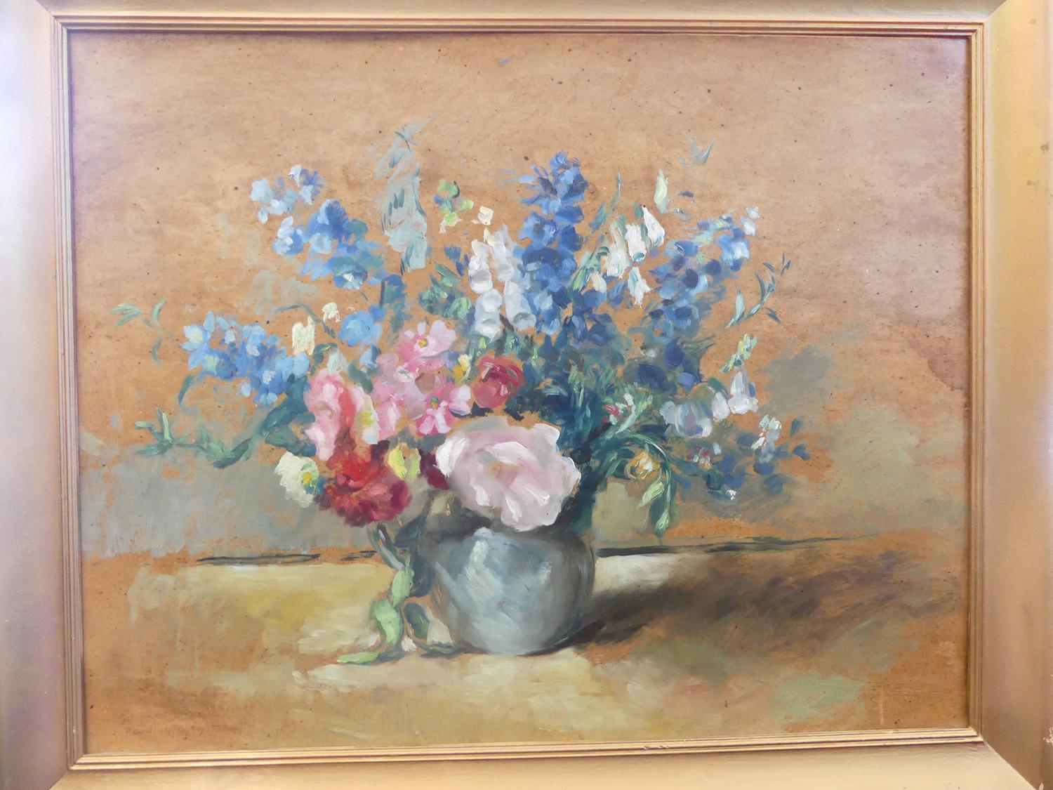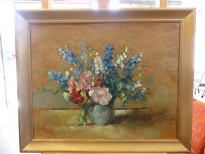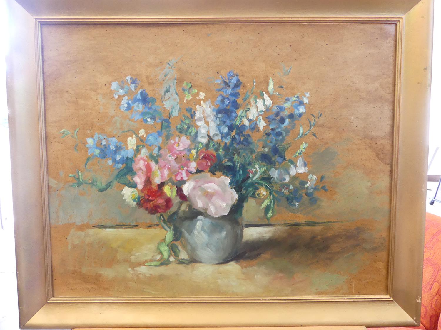 indistinctly signed, d.1945, oil on board, 22" x 28", "stillife"