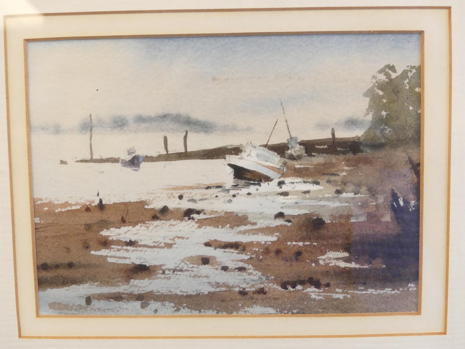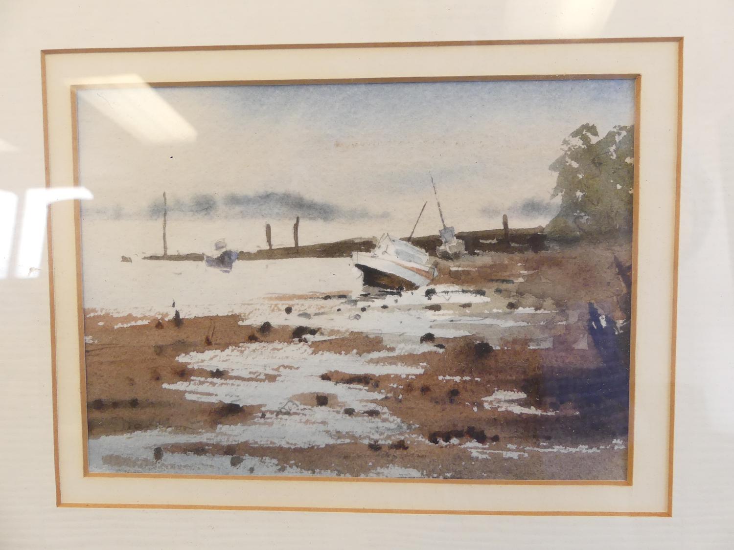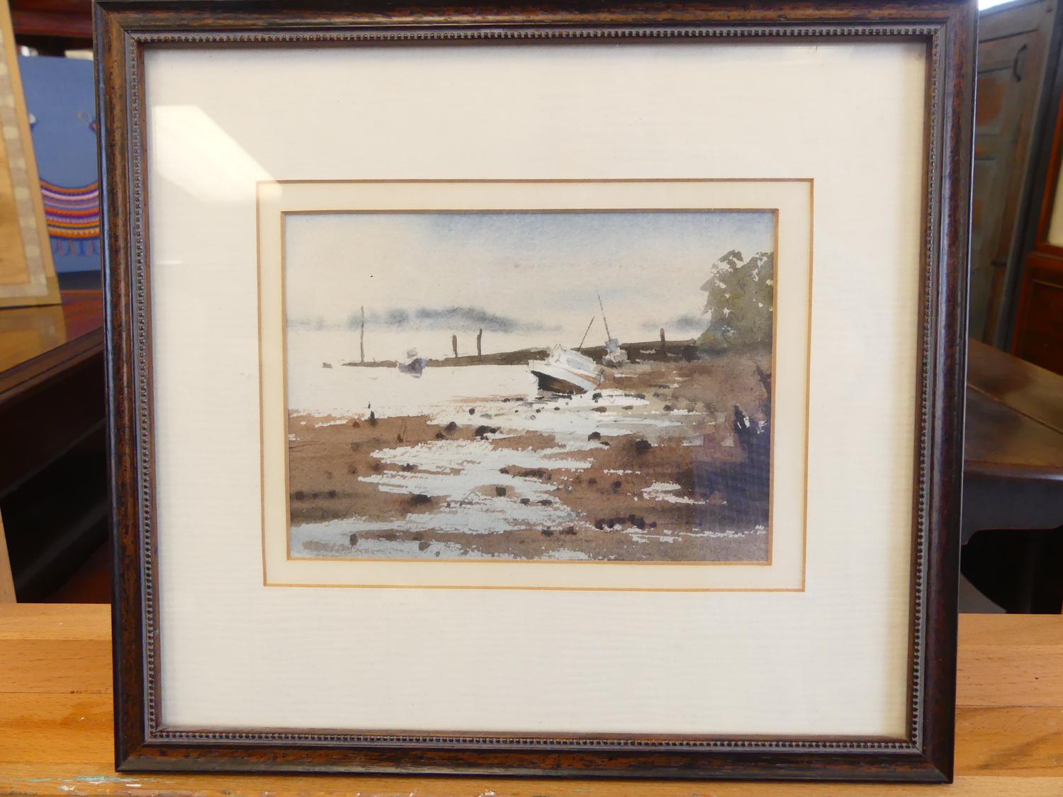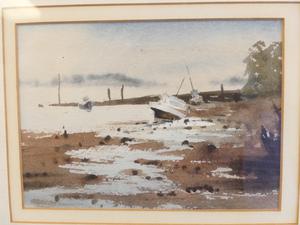 unsigned watercolour, 5" x 7", "low tide with boats"