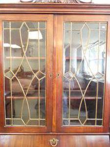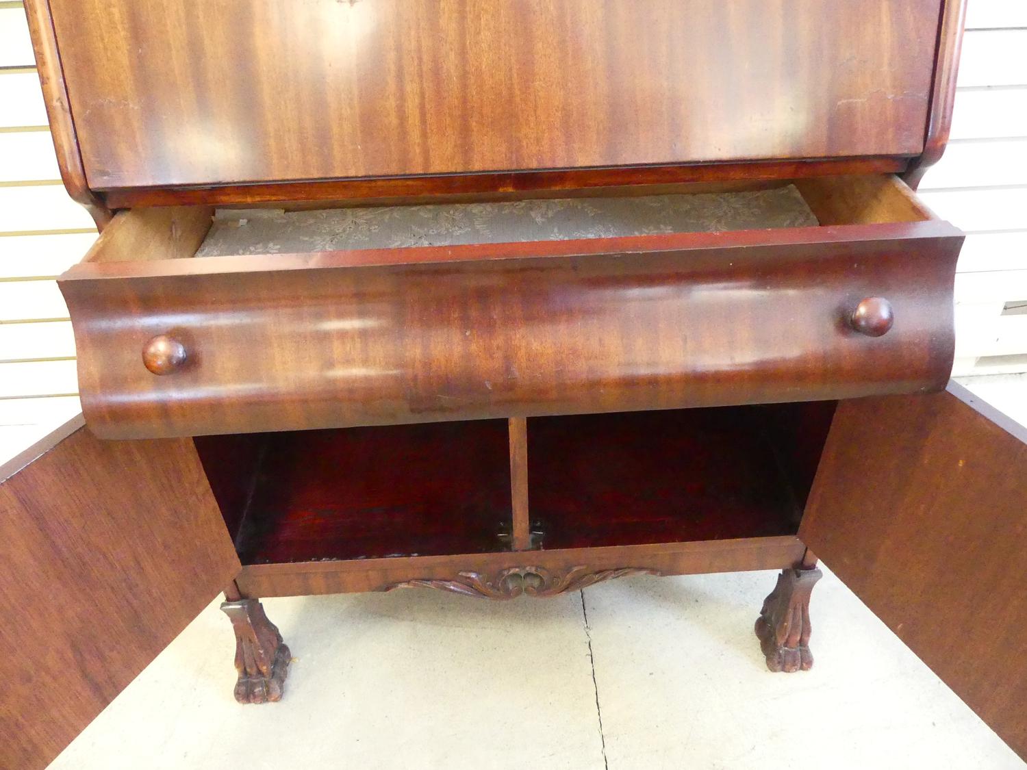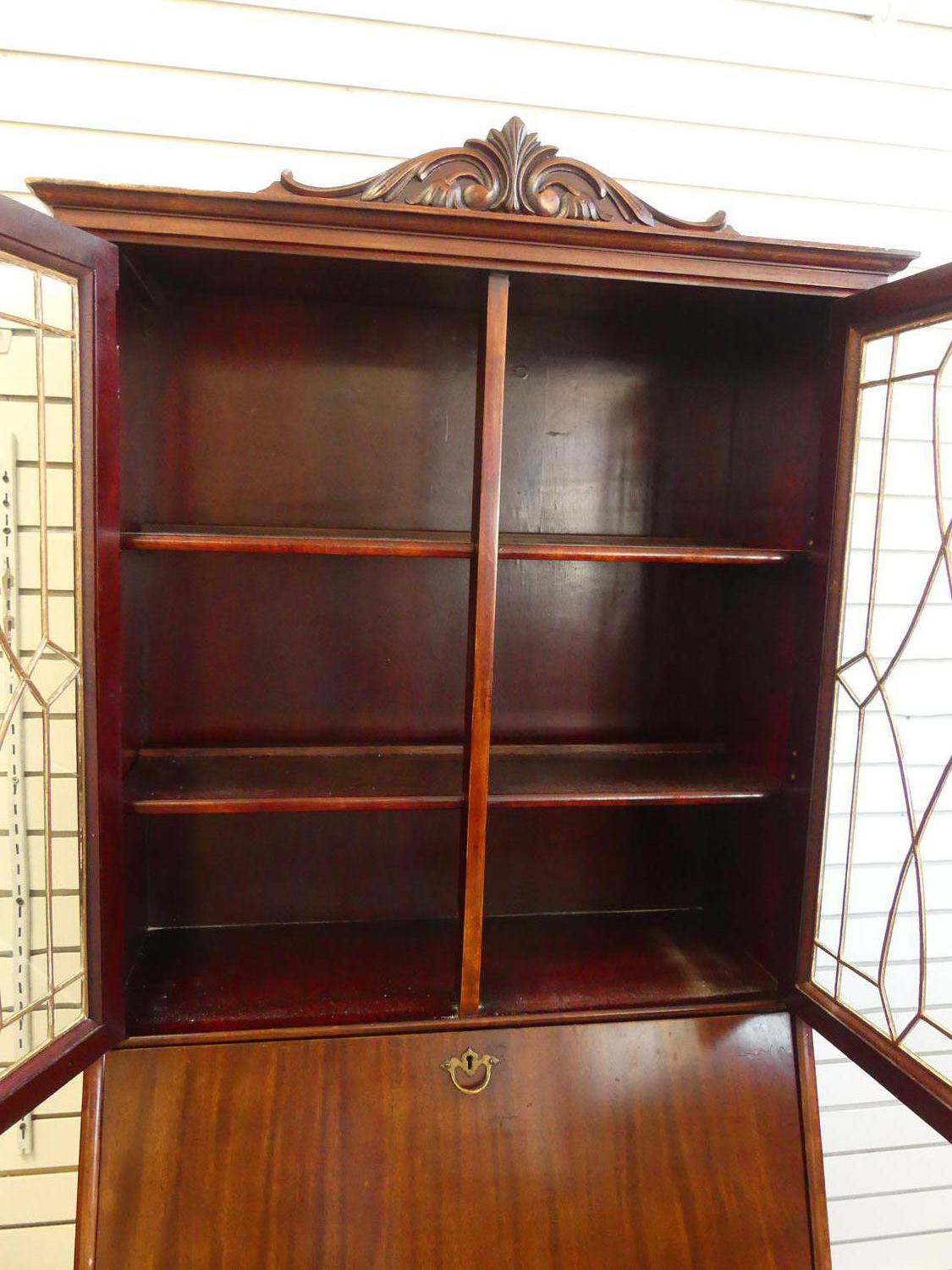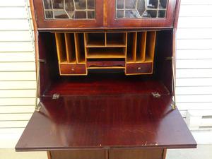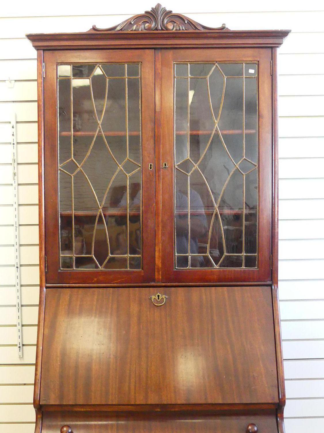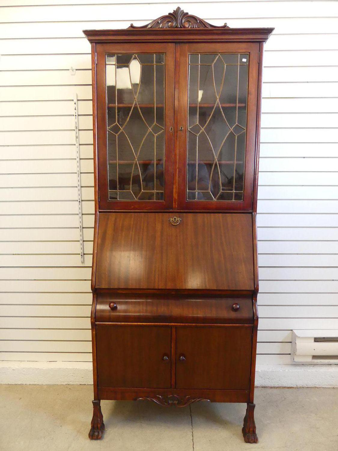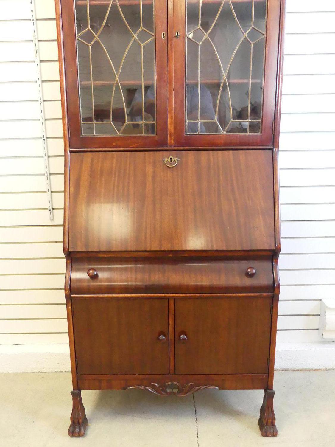 mahogany secretaire bookcase, early 20th century with leaded glass doors and claw feet, 77" x 30" x 17"