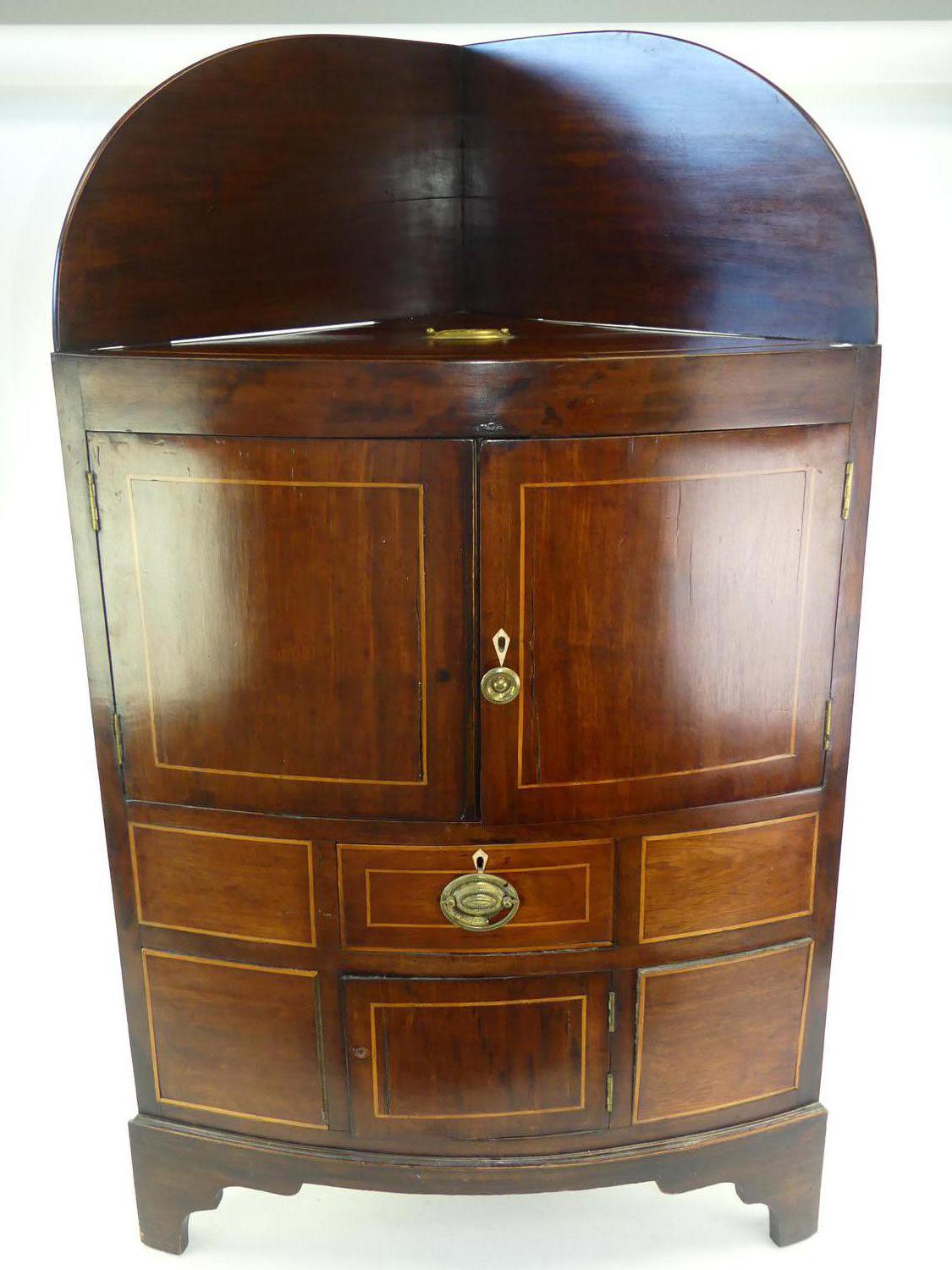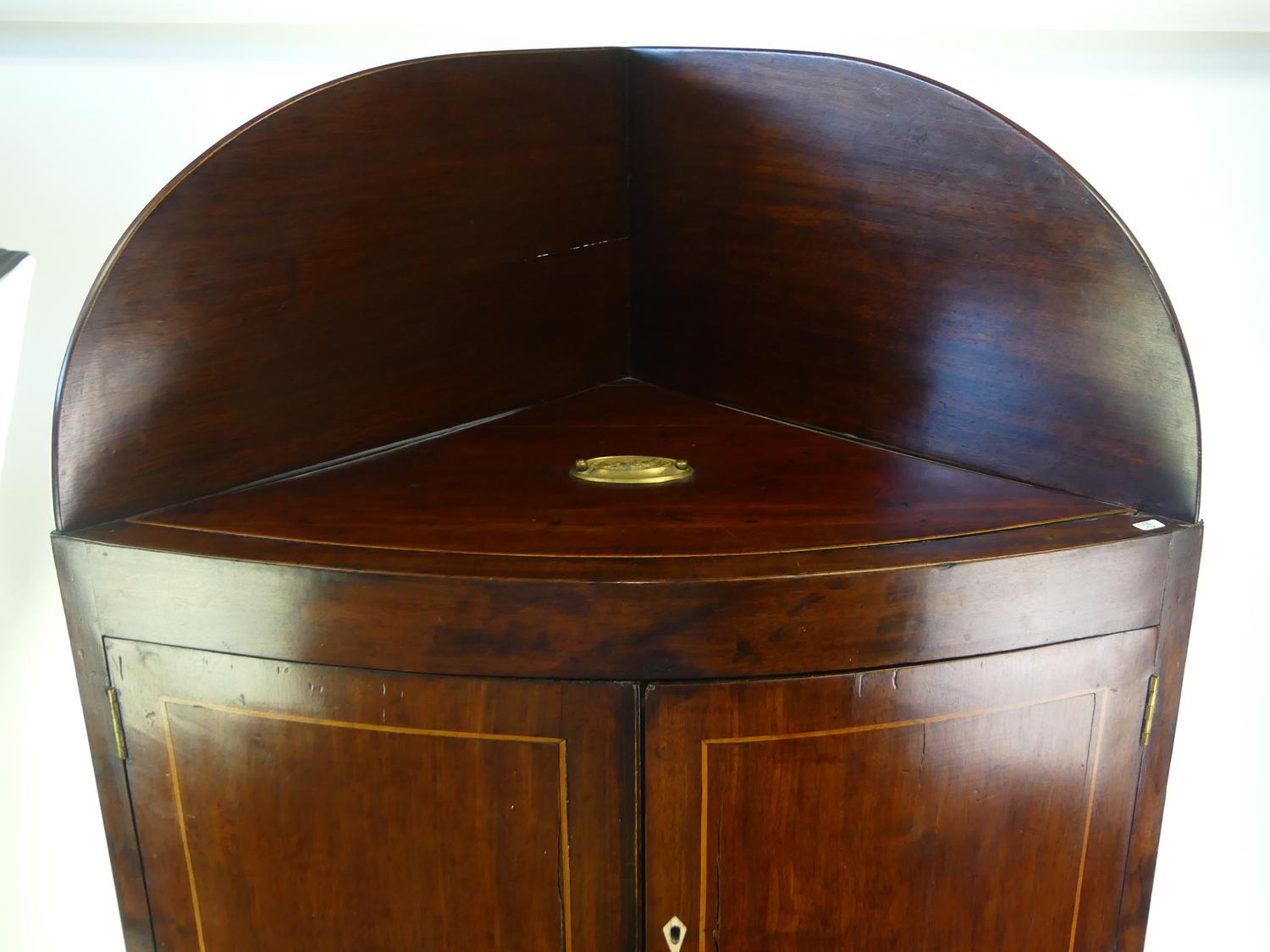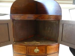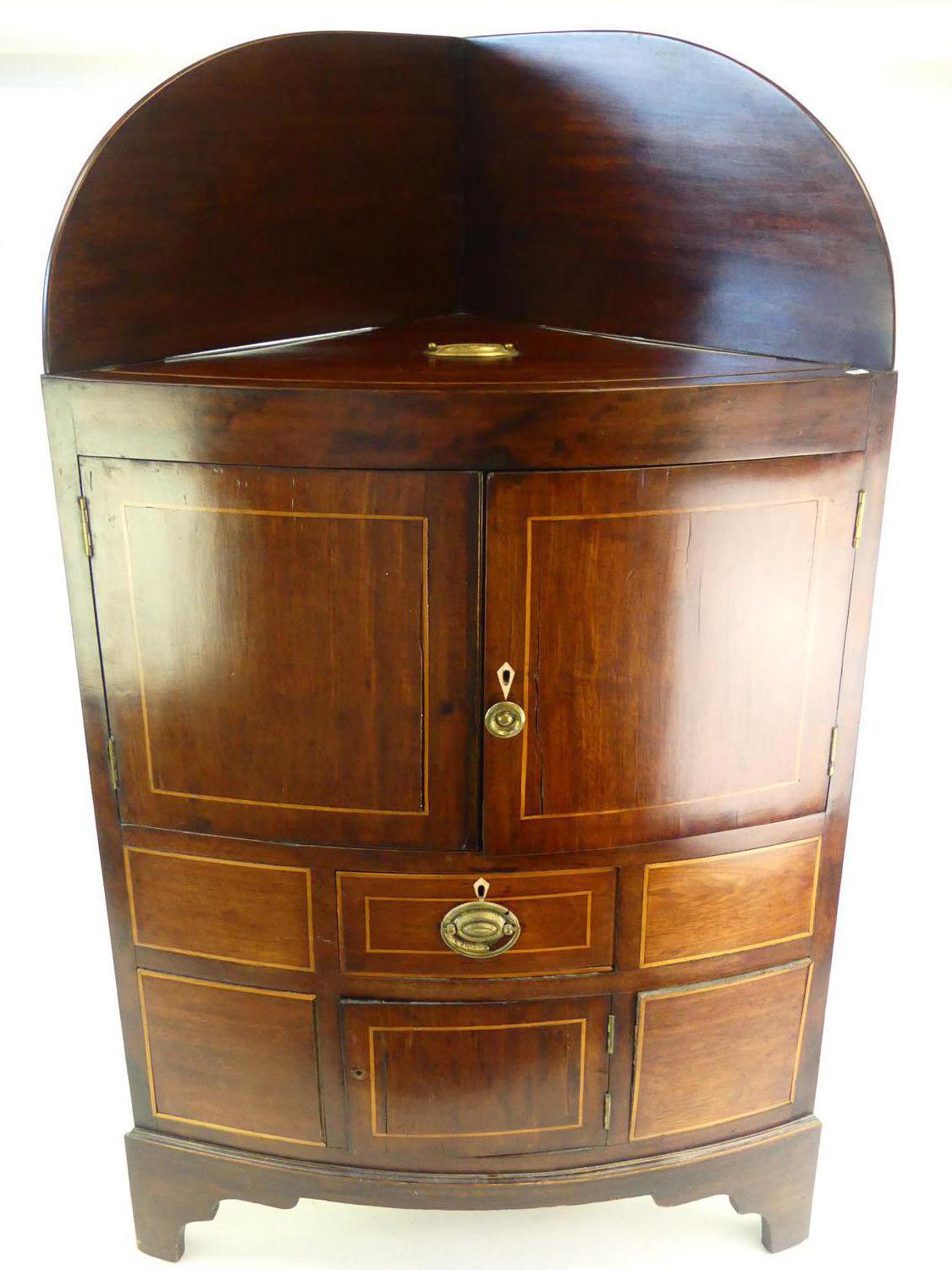 george iii inlaid mahogany corner cabinet, england, early 19th century, 43" x 26" x 18 1/2"
