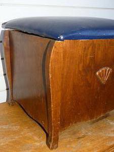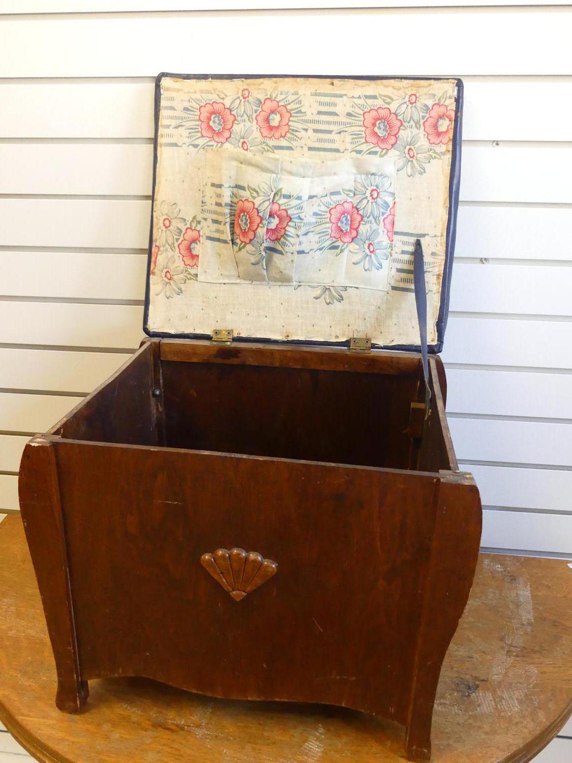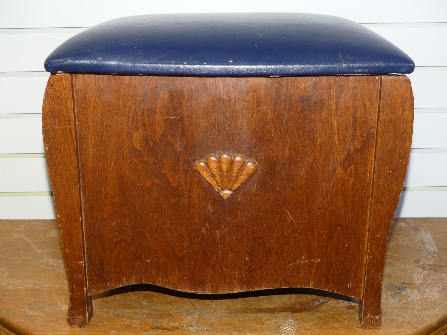 upholstered walnut finish footstool/sewing box, c.1940, 14" x 16" x 13"