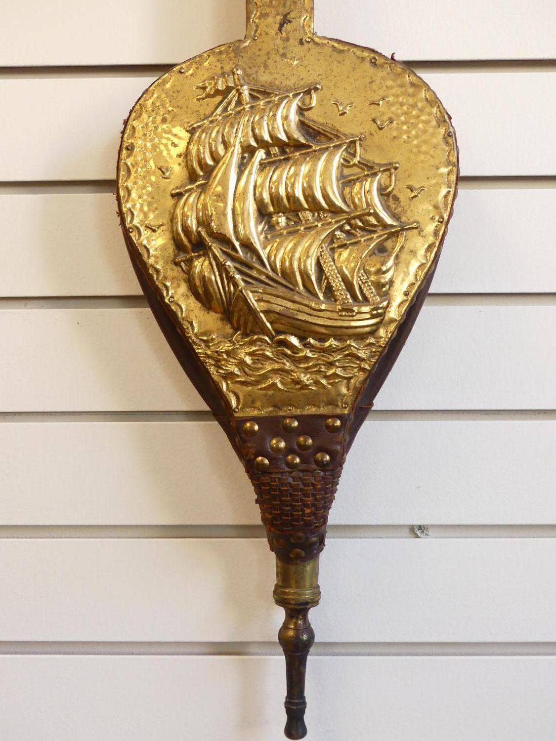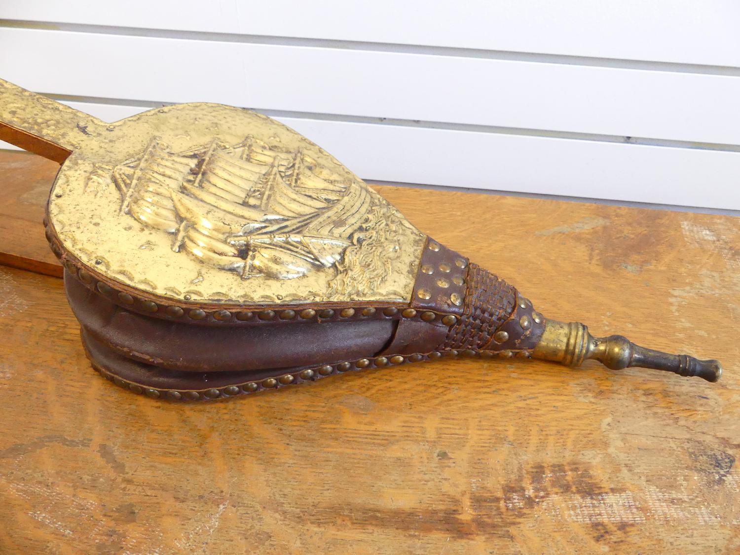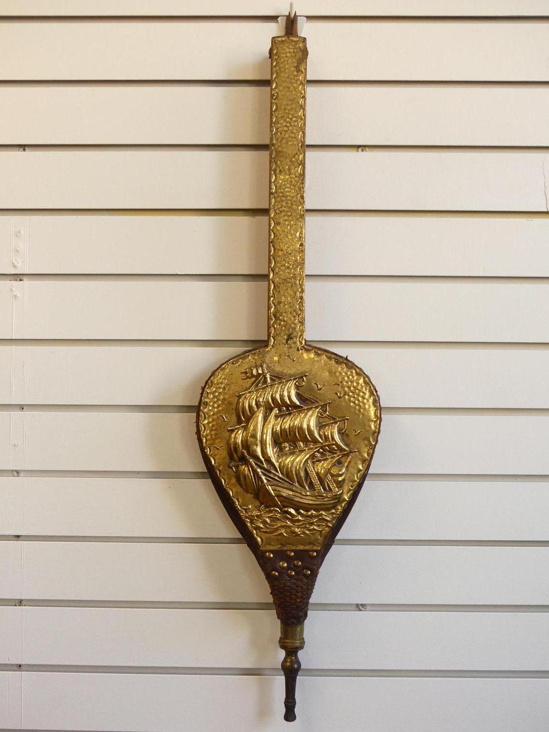 antique brass relief ship motif and oak bellows, length 30"