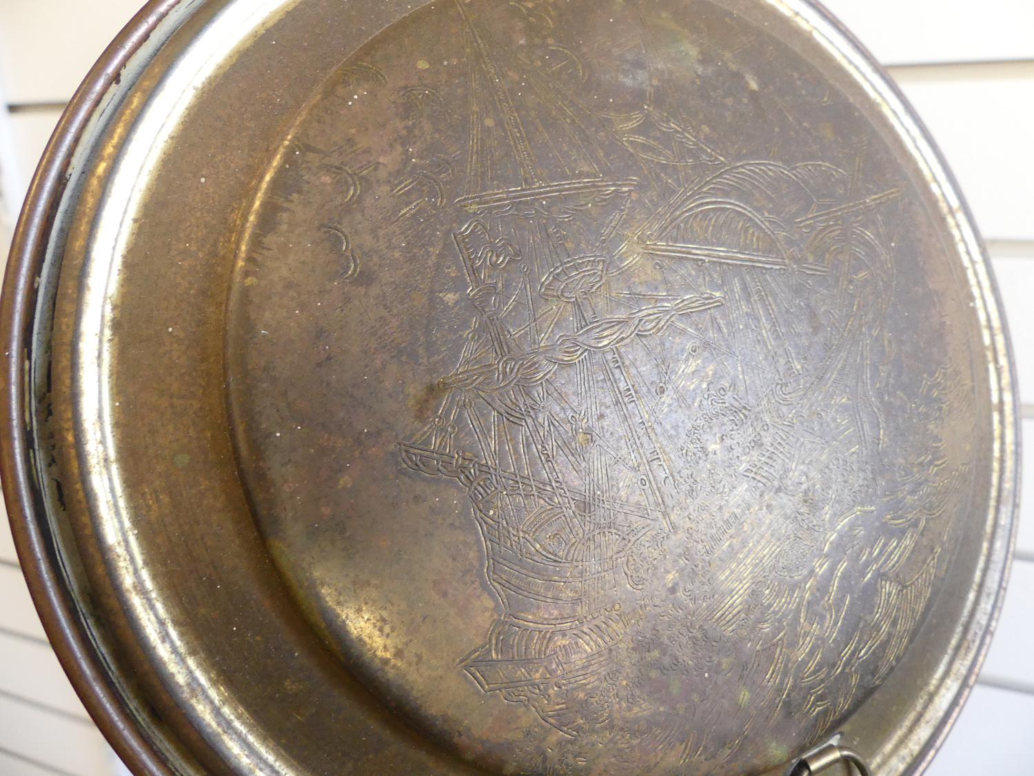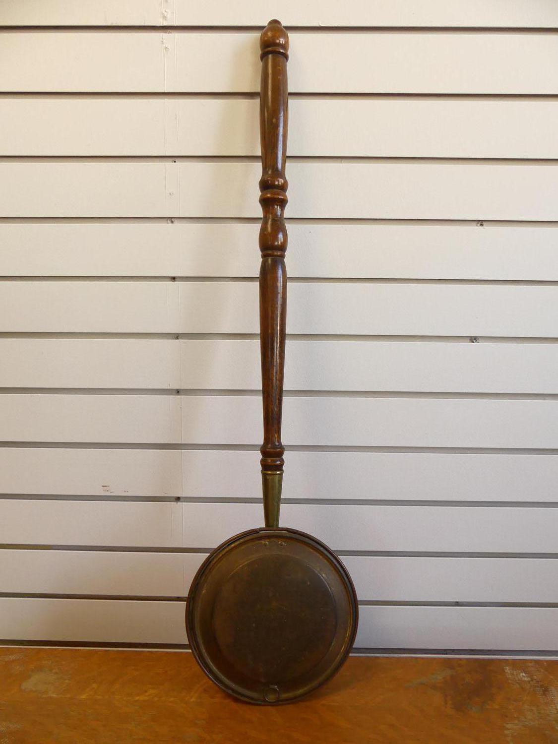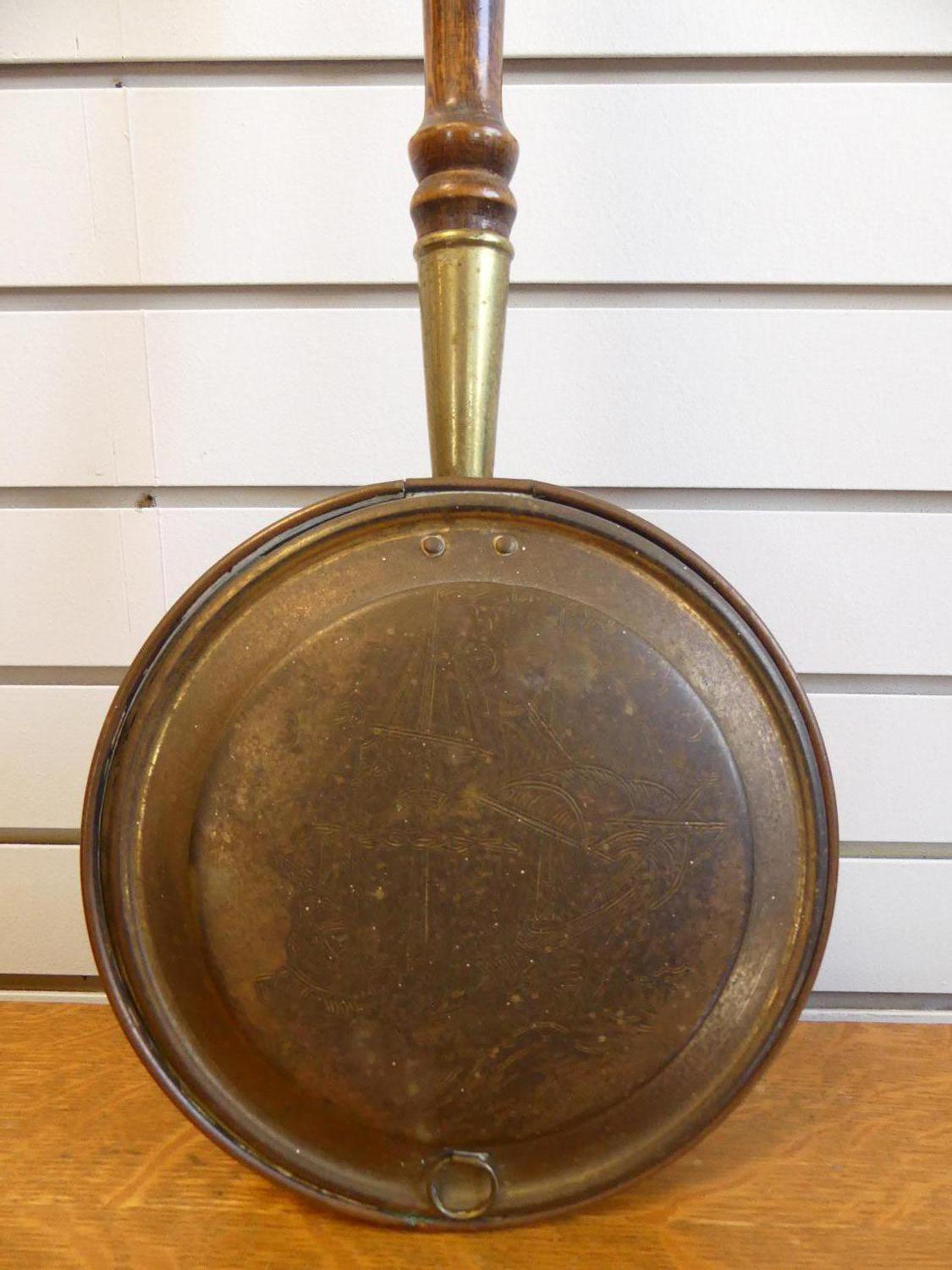19th century brass ship motif and turned wood bedwarmer, length 32"